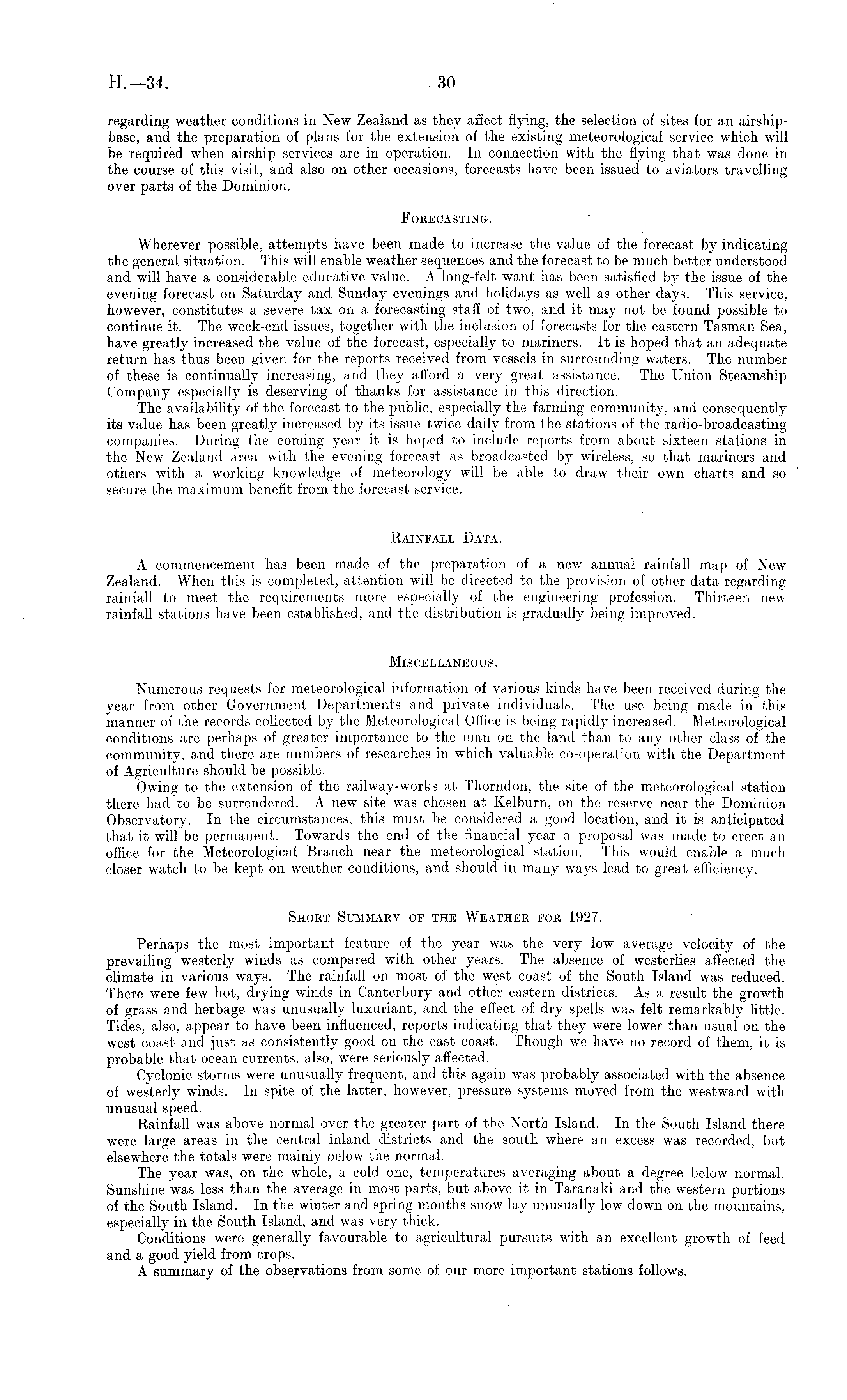 regarding weather conditions in New Zealand as they affect flying, the selection of sites for an airshipbase, and the preparation of plans for the extension of the existing meteorological service which will be required when airship services are in operation. In connection with the flying that was done in the course of this visit, and also on other occasions, forecasts have been issued to aviators travelling over parts of the Dominion. Forecasting. Wherever possible, attempts have been made to increase the value of the forecast by indicating the general situation. This will enable weather sequences and the forecast to be much better understood and will have a considerable educative value. A long-felt want has been satisfied by the issue of the evening forecast on Saturday and Sunday evenings and holidays as well as other days. This service, however, constitutes a severe tax on a forecasting staff of two, and it may not be found possible to continue it. The week-end issues, together with the inclusion of forecasts for the eastern Tasman Sea, have greatly increased the value of the forecast, especially to mariners. It is hoped that an adequate return has thus been given for the reports received from vessels in surrounding waters. The number of these is continually increasing, and they afford a very great assistance. The Union Steamship Company especially is deserving of thanks for assistance in this direction. The availability of the forecast to the public, especially the farming community, and consequently its value has been greatly increased by its issue twice daily from the stations of the radio-broadcasting companies. During the coming year it is hoped to include reports from about sixteen stations in the New Zealand area with the evening forecast as broadcasted by wireless, so that mariners and others with a working knowledge of meteorology will be able to draw their own charts and so secure the maximum benefit from the forecast service. Rainfall Data. A commencement has been made of the preparation of a new annual rainfall map of New Zealand. When this is completed, attention will be directed to the provision of other data regarding rainfall to meet the requirements more especially of the engineering profession. Thirteen new rainfall stations have been established, and the distribution is gradually being improved. Miscellaneous. Numerous requests for meteorological information of various kinds have been received during the year from other Government Departments and private individuals. The use being made in this manner of the records collected by the Meteorological Office is being rapidly increased. Meteorological conditions are perhaps of greater importance to the man on the land than to any other class of the community, and there are numbers of researches in which valuable co-operation with the Department of Agriculture should be possible. Owing to the extension of the railway-works at Thorndon, the site of the meteorological station there had to be surrendered. A new site was chosen at Kelburn, on the reserve near the Dominion Observatory. In the circumstances, this must be considered a good location, and it is anticipated that it will be permanent. Towards the end of the financial year a proposal was made to erect an office for the Meteorological Branch near the meteorological station. This would enable a much closer watch to be kept on weather conditions, and should in many ways lead to great efficiency. Short Summary of the Weather for 1927. Perhaps the most important feature of the year was the very low average velocity of the prevailing westerly winds as compared with other years. The absence of westerlies affected the climate in various ways. The rainfall on most of the west coast of the South Island was reduced. There were few hot, drying winds in Canterbury and other eastern districts. As a result the growth of grass and herbage was unusually luxuriant, and the effect of dry spells was felt remarkably little. Tides, also, appear to have been influenced, reports indicating that they were lower than usual on the west coast and just as consistently good on the east coast. Though we have no record of them, it is probable that ocean currents, also, were seriously affected. Cyclonic storms were unusually frequent, and this again was probably associated with the absence of westerly winds. In spite of the latter, however, pressure systems moved from the westward with unusual speed. Rainfall was above normal over the greater part of the North Island. In the South Island there were large areas in the central inland districts and the south where an excess was recorded, but elsewhere the totals were mainly below the normal. The year was, on the whole, a cold one, temperatures averaging about a degree below normal. Sunshine was less than the average in most parts, but above it in Taranaki and the western portions of the South Island. In the winter and spring months snow lay unusually low down on the mountains, especially in the South Island, and was very thick. Conditions were generally favourable to agricultural pursuits with an excellent growth of feed and a good yield from crops. A summary of the observations from some of our more important stations follows.