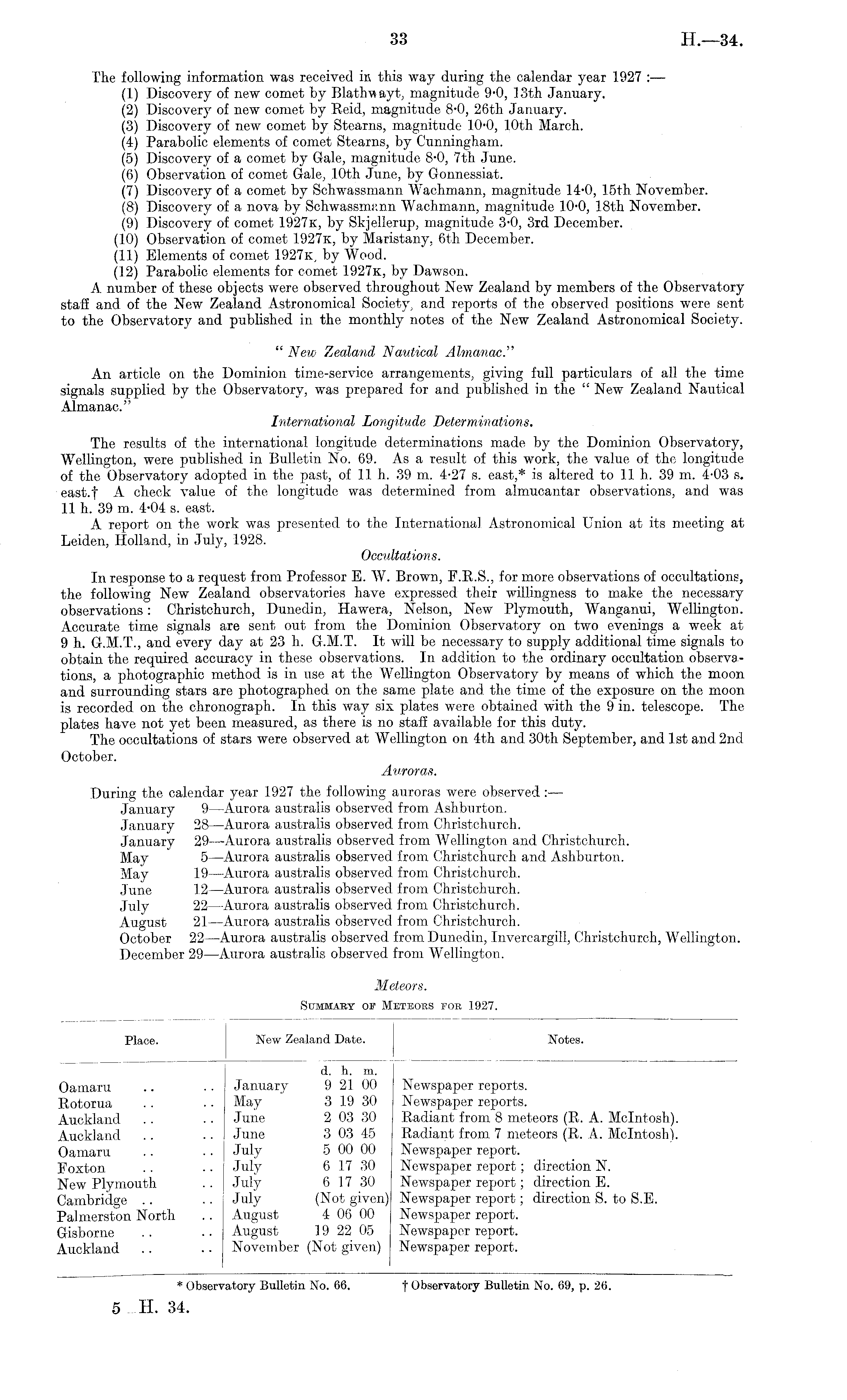 The following information was received in this way during the calendar year 1927 : — (1) Discovery of new comet by Blathwayt, magnitude 9-0, 13th January. (2) Discovery of new comet by Reid, magnitude 8-0, 26th January. (3) Discovery of new comet by Stearns, magnitude 10-0, 10th March. (4) Parabolic elements of comet Stearns, by Cunningham. (5) Discovery of a comet by Gale, magnitude 8-0, '7th June. (6) Observation of comet Gale, 10th June, by Gonnessiat. (7) Discovery of a comet by Schwassmann Wachmann, magnitude 14-0, 15th. November. (8) Discovery of a nova by Schwassmr.nn Wachmann, magnitude 10-0, 18th November. (9) Discovery of comet 1927k, by Skjellerup, magnitude 3-0, 3rd December. (10) Observation of comet 1927k, by Maristany, 6th December. (11) Elements of comet 1927k, by Wood. (12) Parabolic elements for comet 1927k, by Dawson. A number of these objects were observed throughout New Zealand by members of the Observatory staff and of the New Zealand Astronomical Society, and reports of the observed positions were sent to the Observatory and published in the monthly notes of the New Zealand Astronomical Society. " New Zealand Nautical Almanac." An article on the Dominion time-service arrangements, giving full particulars of all the time signals supplied by the Observatory, was prepared for and published in the " New Zealand Nautical Almanac." International Longitude Determinations. The results of the international longitude determinations made by the Dominion Observatory, Wellington, were published in Bulletin No. 69. As a result of this work, the value of the longitude of the Observatory adopted in the past, of 11 h. 39 m. 4-27 s. east,* is altered to 11 h. 39 m. 4'03 s. east.f A check value of the longitude was determined from almucantar observations, and was 11 h. 39 m. 4-04 s. east. A report on the work was presented to the International Astronomical Union at its meeting at Leiden, Holland, in July, 1928. Occultations. In response to a request from Professor E. W. Brown, F.R.S., for more observations of occultations, the following New Zealand observatories have expressed their willingness to make the necessary observations: Christchurch, Dunedin, Hawera, Nelson, New Plymouth, Wanganui, Wellington. Accurate time signals are sent out from the Dominion Observatory on two evenings a week at 9h. G.M.T., and every day at 23 li. G.M.T. It will be necessary to supply additional time signals to obtain the required accuracy in these observations. In addition to the ordinary occultation observa - tions, a photographic method is in use at the Wellington Observatory by means of which the moon and surrounding stars are photographed on the same plate and the time of the exposure on the moon is recorded on the chronograph. In this way six plates were obtained with the 9 in. telescope. The plates have not yet been measured, as there is no staff available for this duty. The occultations of stars were observed at Wellington on 4th and 30th September, and Ist and 2nd October. Auroras. During the calendar year 1927 the following auroras were observed : — January 9—Aurora australis observed from Ashburton. January 28 —Aurora australis observed from Christchurch. January 29—Aurora australis observed from Wellington and Christchurch. May s—Aurora australis observed from Christchurch and Ashburton. May 19 —Aurora australis observed from Christchurch. June 12 —Aurora australis observed from Christchurch. July 22—Aurora australis observed from Christchurch. August 21 —Aurora australis observed from Christchurch. October 22—Aurora australis observed from Dunedin, Invercargill, Christchurch, Wellington. December 29 —Aurora australis observed from Wellington.