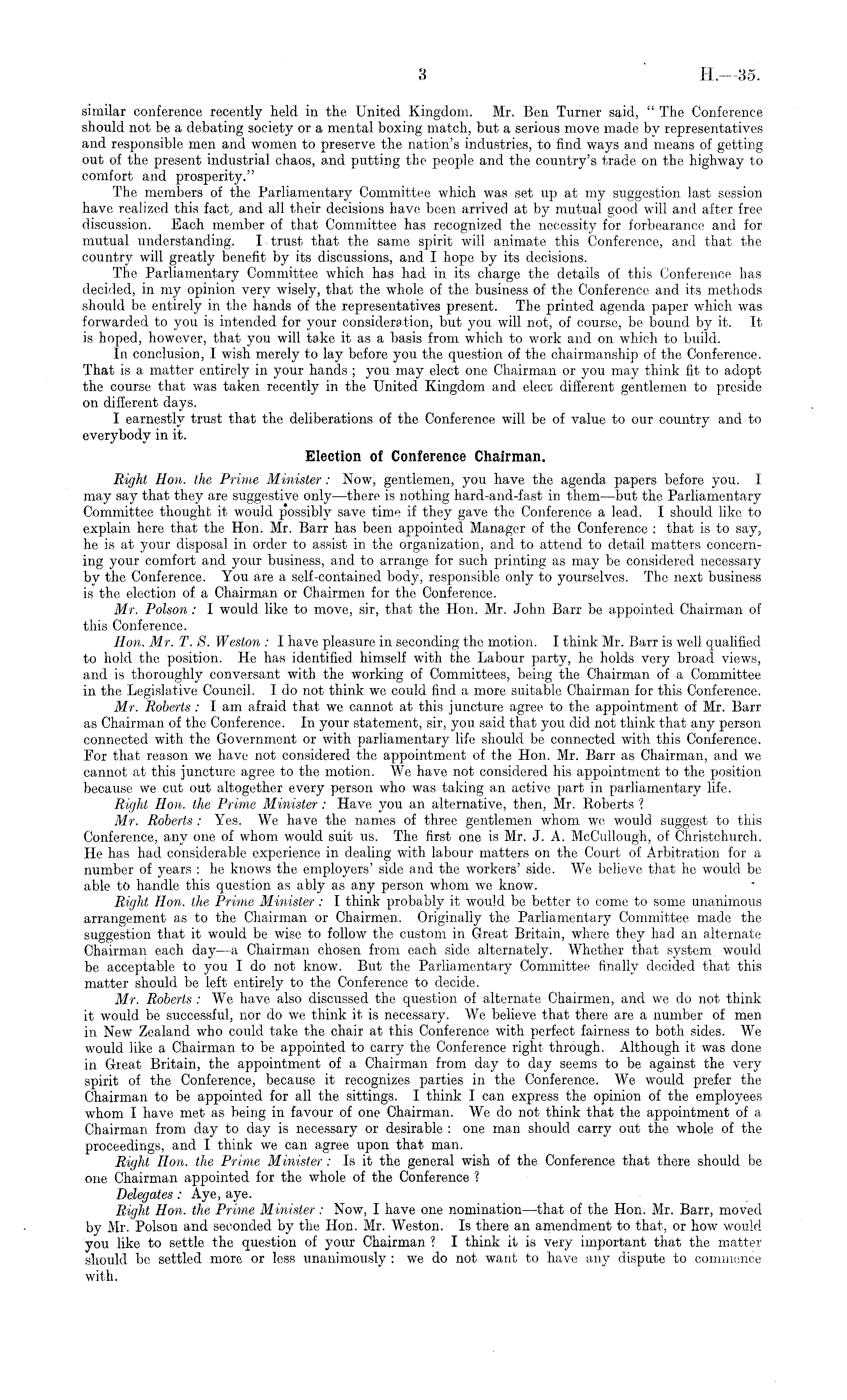 similar conference recently held in the United Kingdom. Mr. Ben Turner said, " The Conference should not be a debating society or a mental boxing match, but a serious move made by representatives and responsible men and women to preserve the nation's industries, to find ways and means of getting out of the present industrial chaos, and putting the people and the country's trade on the highway to comfort and prosperity." The members of the Parliamentary Committee which was set up at my suggestion last session have realized this fact, and all their decisions have been arrived at by mutual good will and after free discussion. Each member of that Committee has recognized the necessity for forbearance and for mutual understanding. I trust that the same spirit will animate this Conference, and that the country will greatly benefit by its discussions, and I hope by its decisions. The Parliamentary Committee which ha,s had in its charge the details of this Conference has decided, in my opinion very wisely, that the whole of the business of the Conference and its methods should be entirely in the hands of the representatives present. The printed agenda paper which was forwarded to you is intended for your consideration, but you will not, of course, be bound by it. It is hoped, however, that you will take it as a basis from which to work and on which to build. In conclusion, I wish merely to lay before you the question of the chairmanship of the Conference. That is a matter entirely in your hands ; you may elect one Chairman or you may think fit to adopt the course that was taken recently in the United Kingdom and elect different gentlemen to preside on different days. I earnestly trust that the deliberations of the Conference will be of value to our country and to everybody in it. Election of Conference Chairman. Right Hon. the Prime Minister : Now, gentlemen, you have the agenda papers before you. I may say that they are suggestive only—there is nothing hard-and-fast in them—but the Parliamentary Committee thought it would possibly save time if they gave the Conference a lead. I should like to explain here that the Hon. Mr. Barr has been appointed Manager of the Conference : that is to say, he is at your disposal in order to assist in the organization, and to attend to detail matters concerning your comfort and your business, and to arrange for such printing as may be considered necessary by the Conference. You are a self-contained body, responsible only to yourselves. The next business is the election of a Chairman or Chairmen for the Conference. Mr. Poison : I would like to move, sir, that the Hon. Mr. John Barr be appointed Chairman of this Conference. Hon. Mr. T. S. Weston : I have pleasure in seconding the motion. I think Mr. Barr is well qualified to hold the position. He has identified, himself with the Labour party, he holds very broad views, and is thoroughly conversant with the working of Committees, being the Chairman of a Committee in the Legislative Council. Ido not think we could find a more suitable Chairman for this Conference. Mr. Roberts : I am afraid that we cannot at this juncture agree to the appointment of Mr. Barr as Chairman of the Conference. In your statement, sir, you said that you did not think that any person connected with the Government or with parliamentary life should be connected with this Conference. For that reason we have not considered the appointment of the Hon. Mr. Barr as Chairman, and we cannot at this juncture agree to the motion. We have not considered his appointment to the position because we cut out altogether every person who was taking an active part in parliamentary life. Right Hon. the Prime Minister : Have you an alternative, then, Mr. Roberts ? Mr. Roberts : Yes. We have the names of three gentlemen whom we would suggest to this Conference, any one of whom would suit us. The first one is Mr. J. A. McCullough, of Christchurch. He has had considerable experience in dealing with labour matters on the Court of Arbitration for a number of years : he knows the employers' side and the workers' side. We believe that he would be able to handle this question as ably as any person whom we know. Right Hon. the Prime Minister : I think probably it would be better to come to some unanimous arrangement as to the Chairman or Chairmen. Originally the Parliamentary Committee made the suggestion that it would be wise to follow the custom in Great Britain, where they had an alternate Chairman each day —a Chairman chosen from each side alternately. Whether that system would be acceptable to you I do not know. But the Parliamentary Committee finally decided that this matter should be left entirely to the Conference to decide. Mr. Roberts : We have also discussed the question of alternate Chairmen, and we do not think it would be successful, nor do we think it is necessary. We believe that there are a number of men in New Zealand who could take the chair at this Conference with perfect fairness to both sides. We would like a Chairman to be appointed to carry the Conference right through. Although it was done in Great Britain, the appointment of a Chairman from day to day seems to be against the very spirit of the Conference, because it recognizes parties in the Conference. We would prefer the Chairman to be appointed for all the sittings. I think I can express the opinion of the employees whom I have met as being in favour of one Chairman. We do not think that the appointment of a Chairman from day to day is necessary or desirable : one man should carry out the whole of the proceedings, and I think we can agree upon that man. Right lion, the Prime Minister : Is it the general wish of the Conference that there should be one Chairman appointed for the whole of the Conference ? Delegates: Aye, aye. Right Hon. the Prime Minister : Now, I have one nomination —that of the Hon. Mr. Barr, moved by Mr. Poison and seconded by the Hon. Mr. Weston. Is there an amendment