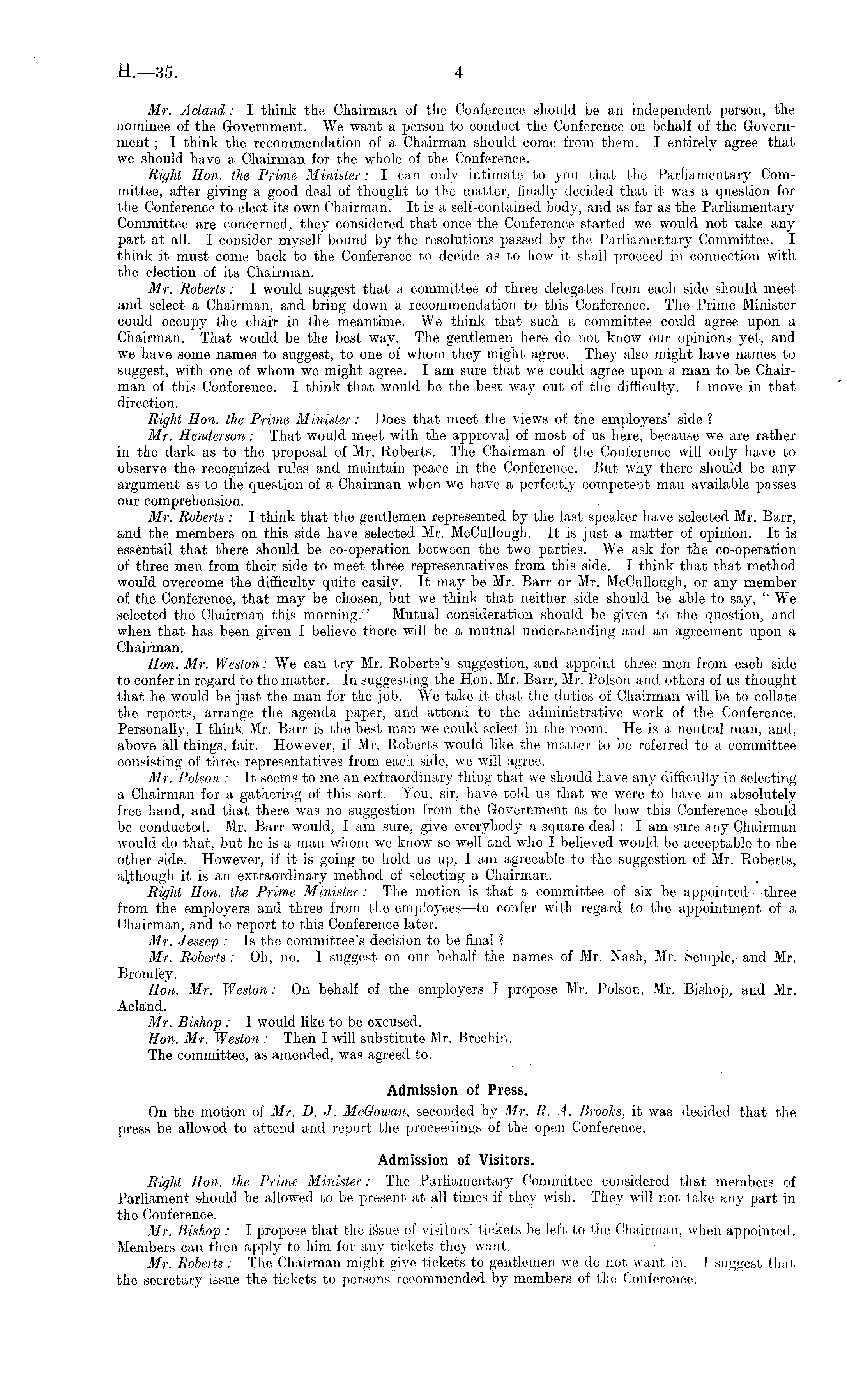 Mr. A eland : I think the Chairman of the Conference should be an independent person, the nominee of the Government. We want a person to conduct the Conference on behalf of the Government ; I think the recommendation of a Chairman should come from them. I entirely agree that we should have a Chairman for the whole of the Conference. Right Hon. the Prime Minister: I can only intimate to you that the Parliamentary Committee, after giving a good deal of thought to the matter, finally decided that it was a question for the Conference to elect its own Chairman. It is a self-contained body, and as far as the Parliamentary Committee are concerned, they considered that once the Conference started we would not take any part at all. I consider myself bound by the resolutions passed by the Parliamentary Committee. 1 think it must come back to the Conference to decide as to how it shall proceed in connection with the election of its Chairman. Mr. Roberts : I would suggest that a committee of three delegates from each side should meet and select a Chairman, and bring down a recommendation to this Conference. The Prime Minister could occupy the chair in the meantime. We think that such a committee could agree upon a Chairman. That would be the best way. The gentlemen here do not know our opinions yet, and we have some names to suggest, to one of whom they might agree. They also might have names to suggest, with one of whom we might agree. lam sure that we could agree upon a man to be Chairman of this Conference. I think that would be the best way out of the difficulty. I move in that direction. Right Hon. the Prime Minister : Does that meet the views of the employers' side ? Mr. Henderson: That would meet with the approval of most of us here, because we are rather in the dark as to the proposal of Mr. Roberts. The Chairman of the Conference will only have to observe the recognized rules and maintain peace in the Conference. But why there should be any argument as to the question of a Chairman when we have a perfectly competent man available passes our comprehension. Mr. Roberts : I think that the gentlemen represented by the last speaker have selected Mr. Barr, and the members on this side have selected Mr. McCullough. It is just a matter of opinion. It is essentail that there should be co-operation between the two parties. We ask for the co-operation of three men from their side to meet three representatives from this side. I think that that method would overcome the difficulty quite easily. It may be Mr. Barr or Mr. McCullough, or any member of the Conference, that may be chosen, but we think that neither side should be able to say, "We selected the Chairman this morning." Mutual consideration should be given to the question, and when that has been given I believe there will be a mutual understanding and an agreement upon a Chairman. Hon. Mr. Weston: We can try Mr. Roberts's suggestion, and appoint three men from each side to confer in regard to the matter. In suggesting the Hon. Mr. Barr, Mr. Poison and others of us thought that he would be just the man for the job. We take it that the duties of Chairman will be to collate the reports, arrange the agenda paper, and attend to the administrative work of the Conference. Personally, I think Mr. Barr is the best man we could select in the room. He is a neutral man, and, above all things, fair. However, if Mr. Roberts would like the matter to be referred to a committee consisting of three representatives from each side, we will, agree. Mr. Poison : It seems to me an extraordinary thing that we should have any difficulty in selecting a Chairman for a gathering of this sort. You, sir, have told us that we were to have an absolutely free hand, and that there was no suggestion from the Government as to how this Conference should be conducted. Mr. Barr would, I am sure, give everybody a square deal : lam sure any Chairman would do that, but he is a man whom we know so well and who I believed would be acceptable to the other side. However, if it is going to hold us up, lam agreeable to the suggestion of Mr. Roberts, although it is an extraordinary method of selecting a Chairman. Right Hon. the Prime Minister : The motion is that a committee of six be appointed—three from the employers and three from the employees—to confer with regard to the appointment of a Chairman, and to report to this Conference later. Mr. Jessep : Is the committee's decision to be final ? Mr. Roberts : Oh, no. I suggest on our behalf the names of Mr. Nash, Mr. Semple,- and Mr. Bromley. Hon. Mr. Weston : On behalf of the employers I propose Mr. Poison, Mr. Bishop, and Mr. Acland. Mr. Bishop : I would like to be excused. Hon. Mr. Weston : Then I will substitute Mr. Brechin. The committee, as amended, was agreed to. Admission of Press. On the motion of Mr. D. J. McGoivan, seconded by Mr. R. A. Brooks, it was decided that the press be allowed to attend and report the proceedings of the open Conference. Admission of Visitors. Right Hon. the Prime Minister: The Parliamentary Committee considered that members of Parliament should be allowed to be present at all times if they wish. They will not take any part in the Conference. Mr. Bishop : I propose that the ifisue of visitors' tickets be left to the Chairman, when appointed. Members can then apply to him for any tickets they want. Mr. Roberts : The Chairman might give tickets to gentlemen we do not want in. I suggest that the secretary issue the tickets to persons recommended by members of the Conference.