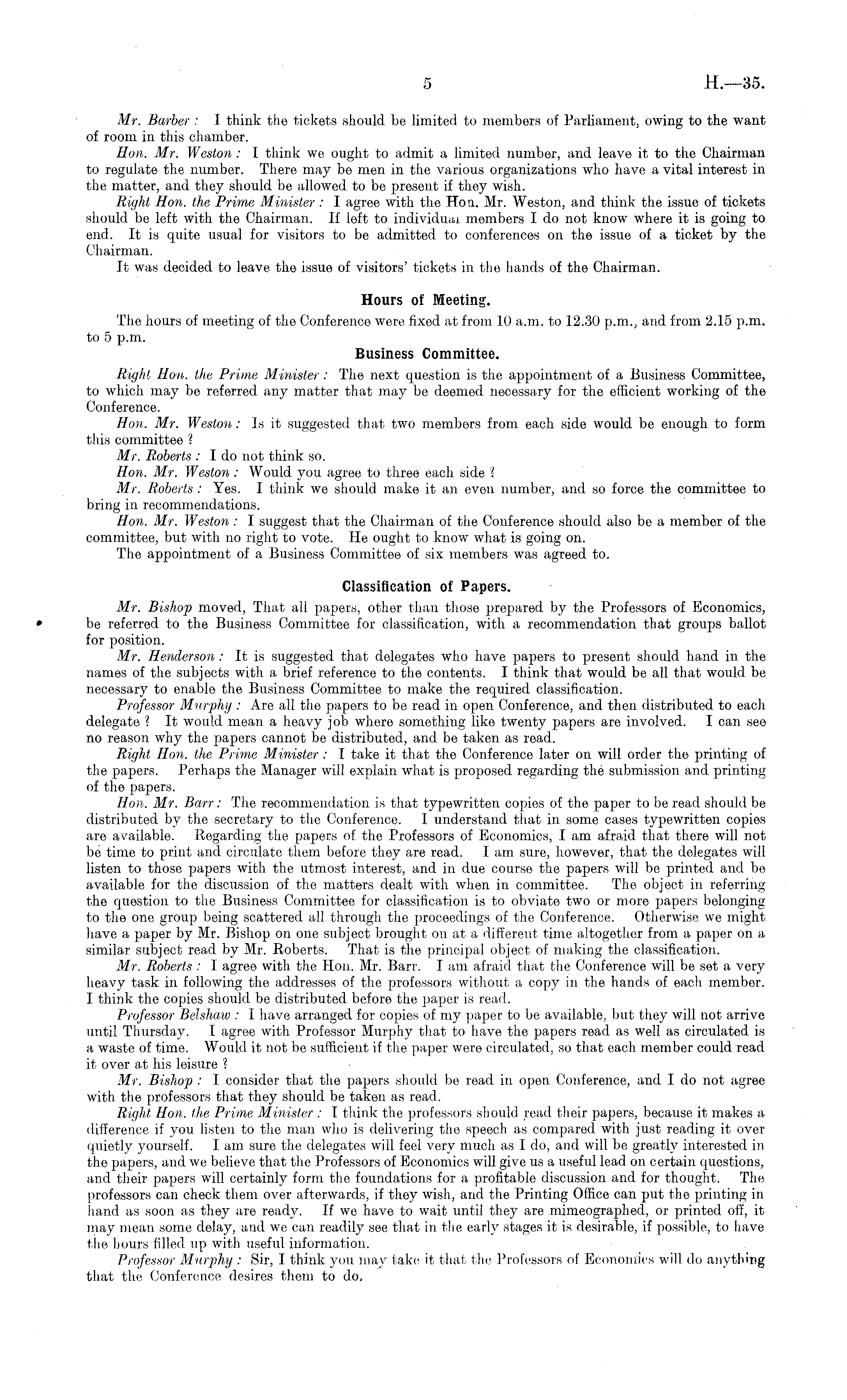 Mr. Barber : I think the tickets should be limited to members of Parliament, owing to the want of room in this chamber. Hon. Mr. Weston : I think we ought to admit a limited number, and leave it to the Chairman to regulate the number. There may be men in the various organizations who have a vital interest in the matter, and they should be allowed to be present if they wish. Right Hon. the Prime Minister: 1 agree with the Hon. Mr. Weston, and think the issue of tickets should be left with the Chairman. If left to individual members Ido not know where it is going to end. It is quite usual for visitors to be admitted to conferences on the issue of a ticket by the Chairman. It was decided to leave the issue of visitors' tickets in the hands of the Chairman. Hours of Meeting. The hours of meeting of the Conference were fixed at from 10 a.m. to 12.30 p.m., and from 2.15 p.m. to 5 p.m. Business Committee. Right Hon. the Prime Minister : The next question is the appointment of a Business Committee, to which may be referred any matter that may be deemed necessary for the efficient working of the Conference. Hon. Mr. Weston: Is it suggested that two members from each side would be enough to form this committee ? Mr. Roberts : I do not think so. Hon. Mr. Weston : Would you agree to three each side ? Mr. Roberts : Yes. I think we should make it an even number, and so force the committee to bring in recommendations. Hon. Mr. Weston : I suggest that the Chairman of the Conference should also be a member of the committee, but with no right to vote. He ought to know what is going on. The appointment of a Business Committee of six members was agreed to. Classification of Papers. Mr. Bishop moved, That all papers, other than those prepared by the Professors of Economics, be referred to the Business Committee for classification, with a recommendation that groups ballot for position. Mr. Henderson : It is suggested that delegates who have papers to present should hand in the names of the subjects with a brief reference to the contents. I think that would be all that would be necessary to enable the Business Committee to make the required classification. Professor Murphy : Are all the papers to be read in open Conference, and then distributed to each delegate ? It would mean a heavy job where something like twenty papers are involved. I can see no reason why the papers cannot be distributed, and be taken as read. Right Hon. the Prime Minister: I take it that the Conference later on will order the printing of the papers. Perhaps the Manager will explain what is proposed regarding the submission and printing of the papers. Hon. Mr. Ban: The recommendation is that typewritten copies of the paper to be read should be distributed by the secretary to the Conference. I understand that in some cases typewritten copies are available. Regarding the papers of the Professors of Economics, lam afraid that there will not be time to print and circulate them before they are read. lam sure, however, that the delegates will listen to those papers with the utmost interest, and in due course the papers will be printed and be available for the discussion of the matters dealt with when in committee. The object in referring the question to the Business Committee for classification is to obviate two or more papers belonging to the one group being scattered all through the proceedings of the Conference. Otherwise we might have a paper by Mr. Bishop on one subject brought on at a different time altogether from a paper on a similar subject read by Mr. Roberts. That is the principal object of making the classification. Mr. Roberts : I agree with the Hon. Mr. Barr. lam afraid that the Conference will be set a very heavy task in following the addresses of the professors without a copy in the hands of each member. I think the copies should be distributed before the paper is read. Professor Belshaw : I have arranged for copies of my paper to be available, but they will not arrive until Thursday. I agree with Professor Murphy that to have the papers read as well as circulated is a waste of time. Would it not be sufficient if the paper were circulated, so that each member could read it over at his leisure ? Mr. Bishop : I consider that the papers should be read in open Conference, and I do not agree with the professors that they should be taken as read. Right, Hon. the Prime Minister : I think the professors should read their papers, because it makes a difference if you listen to the man who is delivering the speech as compared with just reading it over quietly yourself. lam sure the delegates will feel very much as I do, and will be greatly interested in the papers, and we believe that the Professors of Economics will give us a useful lead on certain questions, and their papers will certainly form the foundations for a profitable discussion and for thought. The professors can check them over afterwards, if they wish, and the Printing Office can put the printing in hand as soon as they are ready. If we have to wait until they are mimeographed, or printed off, it may mean some delay, and we can readily see that in the early stages it is desirable, if possible, to have the hours filled up with useful information. Professor Murphy : Sir, I think you may take it that the Professors of Economics will do anything that the Conference desires them to do.