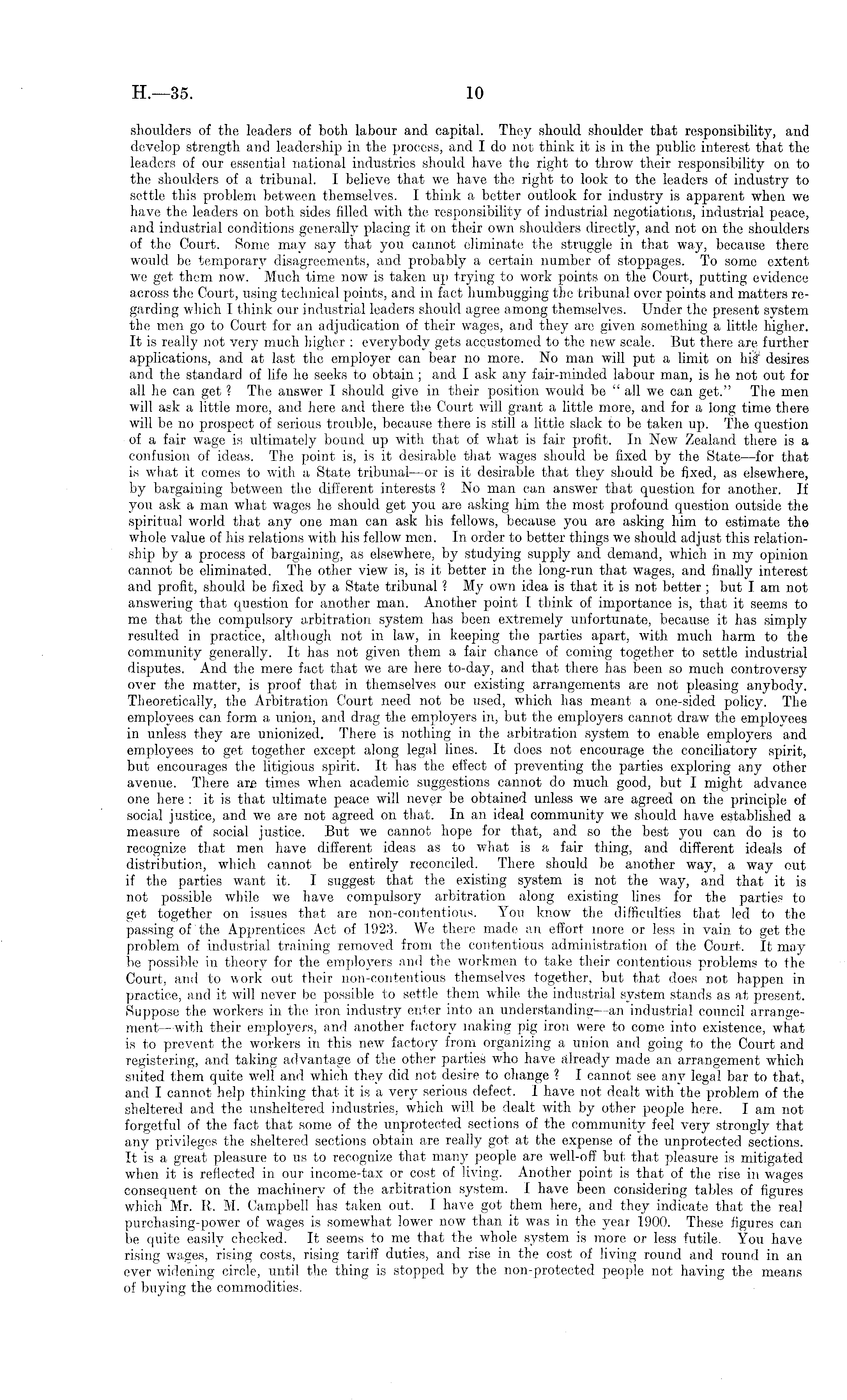 shoulders of the leaders of both labour and capital. They should shoulder that responsibility, and develop strength and leadership in the process, and I do not think it is in the public interest that the leaders of our essential national industries should have the right to throw their responsibility on to the shoulders of a tribunal. I believe that we have the right to look to the leaders of industry to settle this problem between themselves. I think a better outlook for industry is apparent when we have the leaders on both sides filled with the responsibility of industrial negotiations, industrial peace, and industrial conditions generally placing it on their own shoulders directly, and not 011 the shoulders of the Court. Some may say that you cannot eliminate the struggle in that way, because there would be temporary disagreements, and probably a certain number of stoppages. To some extent we get them now. Much time now is taken up trying to work points on the Court, putting evidence across the Court, using technical points, and in fact humbugging the tribunal over points and matters regarding which I think our industrial leaders should agree among themselves. Under the present system the men go to Court for an adjudication of their wages, and they are given something a little higher. It is really not very much higher : everybody gets accustomed to the new scale. But there are further applications, and at last the employer can bear 110 more. No man will put a limit on hiff desires and the standard of life lie seeks to obtain ; and I ask any fair-minded labour man, is he not out for all he can get ? The answer I should give in their position would be " all we can get." The men will ask a little more, and here and there the Court will grant a little more, and for a long time there will be no prospect of serious trouble, because there is still a little slack to be taken up. The question of a fair wage is ultimately bound up with that of what is fair profit. In New Zealand there is a confusion of ideas. The point is, is it desirable that wages should be fixed by the State—for that is what it comes to with a State tribunal —or is it desirable that they should be fixed, as elsewhere, by bargaining between the different interests ? No man can answer that question for another. If you ask a man what wages he should get you are asking him the most profound question outside the spiritual world that any one man can ask his fellows, because you are asking him to estimate the whole value of his relations with his fellow men. In order to better things we should adjust this relationship by a process of bargaining, as elsewhere, by studying supply and demand, which in my opinion cannot be eliminated. The other view is, is it better in the long-run that wages, and finally interest and profit, should be fixed by a State tribunal ? My own idea is that it is not better ; but lam not answering that question for another man. Another point I think of importance is, that it seems to me that the compulsory arbitration system lias been extremely unfortunate, because it has simply resulted in practice, although not in law, in keeping the parties apart, with much harm to the community generally. It has not given them a fair chance of coming together to settle industrial disputes. And the mere fact that we are here to-day, and that there has been so much controversy over the matter, is proof that in themselves our existing arrangements are not pleasing anybody. Theoretically, the Arbitration Court need not be used, which has meant a one-sided policy. The employees can form a union, and drag the employers in, but the employers cannot draw the employees in unless they are unionized. There is nothing in the arbitration system to enable employers and employees to get together except along legal lines. It does not encourage the conciliatory spirit, but encourages the litigious spirit. It has the effect of preventing the parties exploring any other avenue. There are times when academic suggestions cannot do much good, but I might advance one here : it is that ultimate peace will never be obtained unless we are agreed on the principle of social justice, and we are not agreed on that. In an ideal community we should have established a measure of social justice. But we cannot hope for that, and so the best you can do is to recognize that men have different ideas as to what is a fair thing, and different ideals of distribution, which cannot be entirely reconciled. There should be another way, a way out if the parties want it. I suggest that the existing system is not the way, and that it is not possible while we have compulsory arbitration along existing lines for the parties to get together on issues that are non-contentious. You know the difficulties that led to the passing of the Apprentices Act of 1923. We there made an effort more or less in vain to get the problem of industrial training removed from the contentious administration of the Court. It may be possible in theory for the employers and the workmen to take their contentious problems to the Court, and to work out their non-contentious themselves together, but that does not happen in practice, and it will never be possible to settle them while the industrial system stands as at present. Suppose the workers in the iron industry enter into an understanding —an industrial council arrangement. —with their employers, and another factory making pig iron were to come into existence, what is to prevent the workers in this new factory from organizing a union and going to the Court and registering, and taking advantage of the other parties who have already made an arrangement which suited them quite well and which they did not desire to change ? I cannot see any legal bar to that, and I cannot help thinking that it is a very serious defect. I have not dealt with the problem of the sheltered and the unsheltered industries, which will be dealt with by other people her