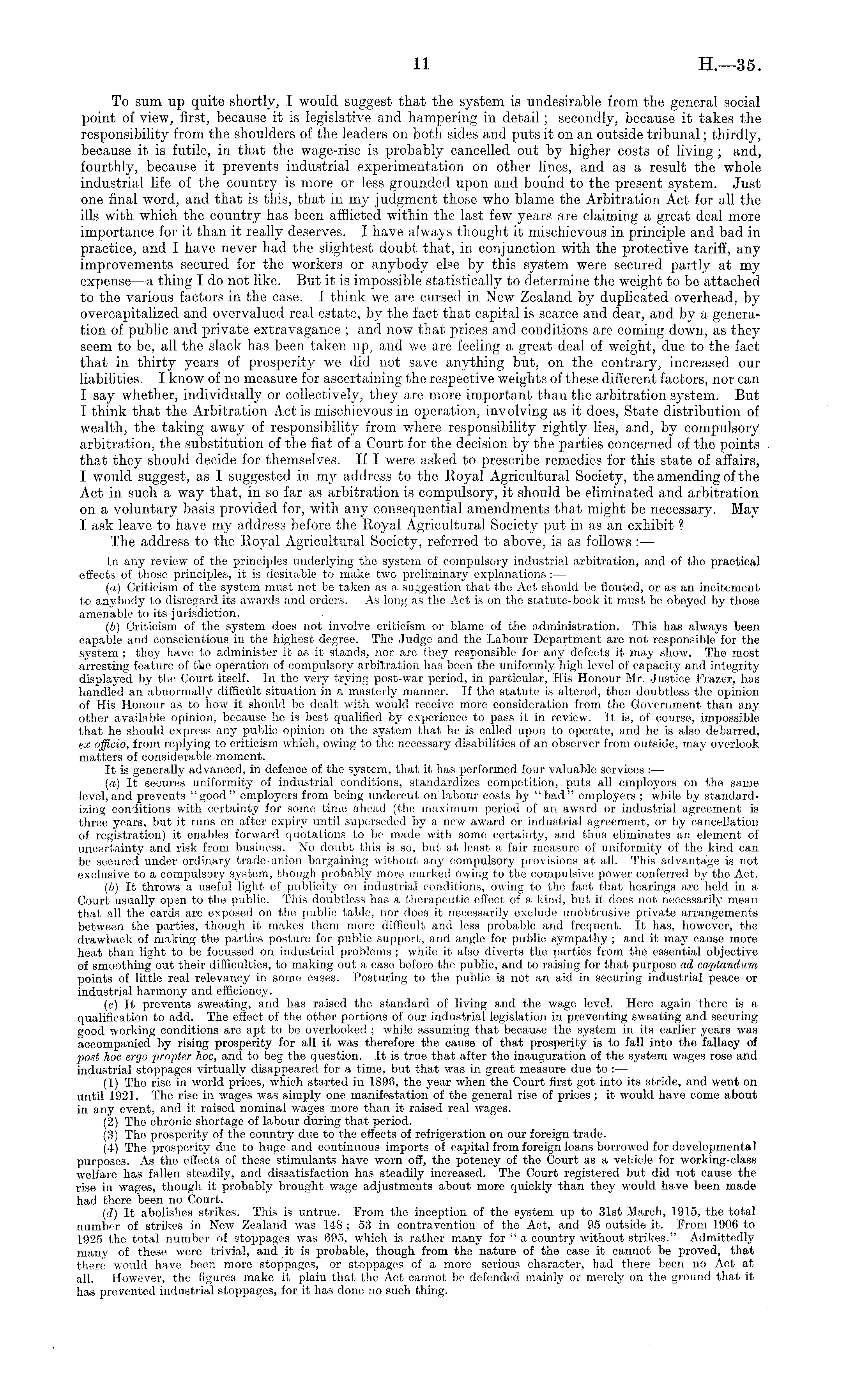 To sum up quite shortly, I would suggest that the system is undesirable from the general social point of view, first, because it is legislative and hampering in detail; secondly, because it takes the responsibility from the shoulders of the leaders 011 both sides and puts it on an outside tribunal; thirdly, because it is futile, in that the wage-rise is probably cancelled out by higher costs of living ; and, fourthly, because it prevents industrial experimentation on other lines, and as a result the whole industrial life of the country is more or less grounded upon and bound to the present system. Just one final word, and that is this, that in my judgment those who blame the Arbitration Act for all the ills with, which the country has been afflicted within the last few years are claiming a great deal more importance for it than it really deserves. I have always thought it mischievous in principle and bad in practice, and I have never had the slightest doubt that, in conjunction with the protective tariff, any improvements secured for the workers or anybody else by this system were secured partly at my expense —a thing Ido not like. But it is impossible statistically to determine the weight to be attached to the various factors in the case. I think we are cursed in New Zealand by duplicated overhead, by overcapitalized and overvalued real estate, by the fact that capital is scarce and dear, and by a generation of public and private extravagance ; and now that prices and conditions are coming down, as they seem to be, all the slack has been taken up, and we are feeling a great deal of weight, due to the fact that in thirty years of prosperity we did not save anything but, on the contrary, increased our liabilities. I know of no measure for ascertaining the respective weights of these different factors, nor can I say whether, individually or collectively, they are more important than the arbitration system. But I think that the Arbitration Act is mischievous in operation, involving as it does, State distribution of wealth, the taking away of responsibility from where responsibility rightly lies, and, by compulsory arbitration, the substitution of the fiat of a Court for the decision by the parties concerned of the points that they should decide for themselves. Tf I were asked to prescribe remedies for this state of affairs, I would suggest, as I suggested in my address to the Royal Agricultural Society, the amending of the Act in such a way that, in so far as arbitration is compulsory, it should be eliminated and arbitration on a voluntary basis provided for, with any consequential amendments that might be necessary. May I ask leave to have my address before the Royal Agricultural Society put in as an exhibit ? The address to the Royal Agricultural Society, referred to above, is as follows : — In any review of the principles underlying the system of compulsory industrial arbitration, and of the practical effects of those principles, it is desirable to make two preliminary explanations : — (а) Criticism of the system must not be taken as a suggestion that the Act should be flouted, or as an incitement to anybody to disregard its awards and orders. As long as the Act is on the statute-book it must be obeyed by those amenable to its jurisdiction. (б) Criticism of the system does not involve criticism or blame of the administration. This has always been capable and conscientious in the highest degree. The Judge and the Labour Department are not responsible for the system ; they have to administer it as it stands, nor are they responsible for any defects it may show. The most arresting feature of the operation of compulsory arbitration has been the uniformly high level of capacity and integrity displayed by the Court itself, in the very trying post-war period, in particular, His Honour Mr. Justice Frazer, has handled an abnormally difficult situation in a masterly manner, if the statute is altered, then doubtless the opinion of His Honour as to how it should be dealt with would receive more consideration from the Government than any other available opinion, because he is best qualified by experience to pass it in review. It is, of course, impossible that he should express any public opinion on the system that he is called upon to operate, and he is also debarred, ex officio, from replying to criticism which, owing to the necessary disabilities of an observer from outside, may overlook matters of considerable moment. It is generally advanced, in defence of the system, that it has performed four valuable services : — (a) It secures uniformity of industrial conditions, standardizes competition, puts all 011 the same level,and prevents "good" employers from being undercut on labour costs by "bad" employers ; while by standardizing conditions with certainty for some time ahead (the maximum period of an award or industrial agreement is three years, but it runs on after expiry until superseded by a new award or industrial agreement, or by cancellation of registration) it enables forward quotations to be made with some certainty, and thus eliminates an element of uncertainty and risk from business. No doubt this is so, but at least a fair measure of uniformity of the kind can be secured under ordinary trade-union bargaining without any compulsory provisions at all. This advantage is not exclusive to a compulsory system, though probably more marked owing to the compulsive power conferred by the Act. (b) It throws a useful light of publicity on industrial conditions, owing to the fact that hearings are held in a Court usually open to the public. This doubtless has a therapeutic effect of a kind, but it does not necessarily mean that all the cards are exposed on the public table, nor does it necessarily exclude unobtrusive private arrangements between the parties, though it makes them more difficult and less probable and frequent. It has, however, the drawback of making the parties posture for pu