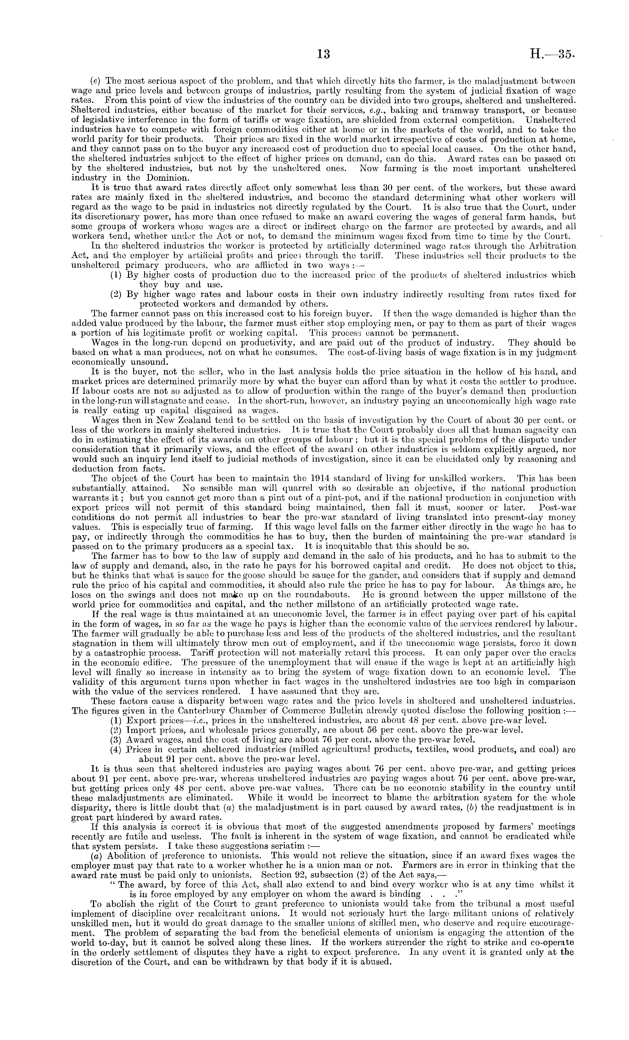 (e) The most serious aspect of the problem, and that which directly hits the farmer, is the maladjustment between wage and price levels and between groups of industries, partly resulting from the system of judicial fixation of wage rates. From this point of view the industries of the country can be divided into two groups, sheltered and unsheltered. Sheltered industries, either because of the market for their services, e.g., baking and tramway transport, or because of legislative interference in the form of tariffs or wage fixation, are shielded from external competition. Unsheltered industries have to compete with foreign commodities either at home or in the markets of the world, and to take the world parity for their products. Their prices are fixed in the world market irrespective of costs of production at home, and they cannot pass on to the buyer any increased cost of production due to special local causes. On the other hand, the sheltered industries subject to the effect of higher prices on demand, can do this. Award rates can be passed on by the sheltered industries, but not by the unsheltered ones. Now farming is the most important unsheltered industry in the Dominion. It is true that award rates directly affect only somewhat less than 30 per cent, of the workers, but these award rates are mainly fixed in the sheltered industries, and become the standard determining what other workers will regard as the wage to be paid in industries not directly regulated by the Court. It is also true that the Court, under its discretionary power, has more than once refused to make an award covering the wages of general farm hands, but some groups of workers whose wages are a direct or indirect charge on the farmer are protected by awards, and all workers tend, whether under the Act or not, to demand the minimum wages fixed from time to time by the Court. In the sheltered industries the worker is protected by artificially determined wage rates through the Arbitration Act, and the employer by artificial profits and prices through the tariff. These industries sell their products to the unsheltered primary producers, who are afflicted in two ways : — (1) By higher costs of production due to the increased price of the products of sheltered industries which they buy and use. (2) By higher wage rates and labour costs in their own industry indirectly resulting from rates fixed for protected workers and demanded by others. The farmer cannot pass on this increased cost to his foreign buyer. If then the wage demanded is higher than the added value produced by the labour, the farmer must either stop employing men, or pay to them as part of their wages a portion of his legitimate profit or working capital. This process cannot be permanent. Wages in the long-run depend on productivity, and are paid out of the product of industry. They should, be based on what a man produces, not on what he consumes. The cost-of-living basis of wage fixation is in my judgment economically unsound. It is the buyer, not the seller, who in the last analysis holds the price situation in the hollow of his hand, and market prices are determined primarily more by what the buyer can afford than by what it costs the settler to produce. If labour costs are not so adjusted as to allow of production within the range of the buyer's demand then production in the long-run will stagnate and cease, in the short-run, however, an industry paying an uneconomieally high wage rate is really eating up capital disguised as wages. Wages then in New Zealand tend to be settled on the basis of investigation by the Court of about 30 per cent, or less of the workers in mainly sheltered industries. It is true that the Court probably does all that human sagacity can do in estimating the effect of its awards on other groups of labour ; but it is the special problems of the dispute under consideration that it primarily views, and the effect of the award on other industries is seldom explicitly argued, nor would such an inquiry lend itself to judicial methods of investigation, since it can be elucidated only by reasoning and deduction from facts. The object of the Court has been to maintain the 1914 standard of living for unskilled workers. This has been substantially, attained. No sensible man will quarrel with so desirable an objective, if the national production warrants it; but you cannot get more than a pint out of a pint-pot, and if the national production in conjunction with export prices will not permit of this standard being maintained, then fall it must, sooner or later. Post-war conditions do not permit all industries to bear the pre-war standard of living translated into present-day money values. This is especially true of farming. If this wage level falls on the farmer either directly in the wage he has to pay, or indirectly through the commodities he has to buy, then the burden of maintaining the pre-war standard is passed on to the primary producers as a special tax. It is inequitable that this should be so. The farmer has to bow to the law of supply and demand in the sale of his products, and he has to submit to the law of supply and demand, also, in the rate he pays for his borrowed capital and credit. He does not object to this, but he thinks that what is sauce for the goose should be sauce for the gander, and considers that if supply and demand rule the price of his capital and commodities, it should also rule the price he has to pay for labour. As things are, he loses on the swings and does not make up on the roundabouts. He is ground between the upper millstone of the world price for commodities and capital, and the nether millstone of an artificially protected wage rate. If the real wage is thus maintained at an uneconomic level, the farmer is in effect paying over part of his capital in the form of wages, in so far as the wage he pays is higher than the economic value of the services rendered by labour. The farmer will gradually be able
