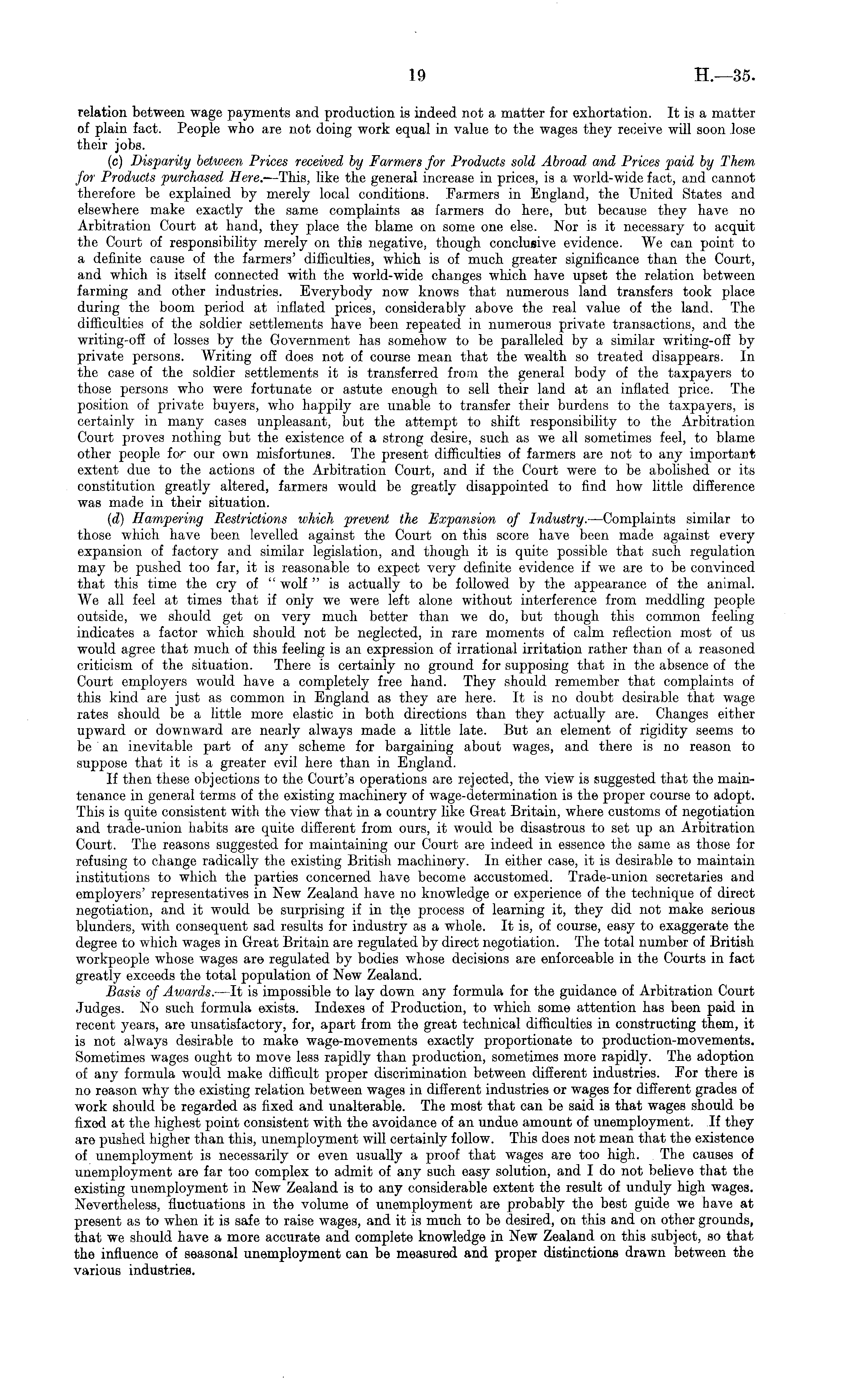 relation between wage payments and production is indeed not a matter for exhortation. It is a matter of plain fact. People who are not doing work equal in value to the wages they receive will soon lose their jobs. (c) Disparity between Prices received by Farmers for Products sold Abroad and Prices paid by Them for Products purchased Here.-—This, like the general increase in prices, is a world-wide fact, and cannot therefore be explained by merely local conditions. Farmers in England, the United States and elsewhere make exactly the same complaints as farmers do here, but because they have no Arbitration Court at hand, they place the blame on some one else. Nor is it necessary to acquit the Court of responsibility merely on this negative, though conclusive evidence. We can point to a definite cause of the farmers' difficulties, which is of much greater significance than the Court, and which is itself connected with the world-wide changes which have upset the relation between farming and other industries. Everybody now knows that numerous land transfers took place during the boom period at inflated prices, considerably above the real value of the land. The difficulties of the soldier settlements have been repeated in numerous private transactions, and the writing-off of losses by the Government has somehow to be paralleled by a similar writing-off by private persons. Writing off does not of course mean that the wealth so treated disappears. In the case of the soldier settlements it is transferred from the general body of the taxpayers to those persons who were fortunate or astute enough to sell their land at an inflated price. The position of private buyers, who happily are unable to transfer their burdens to the taxpayers, is certainly in many cases unpleasant, but the attempt to shift responsibility to the Arbitration Court proves nothing but the existence of a strong desire, such as we all sometimes feel, to blame other people for our own misfortunes. The present difficulties of farmers are not to any important extent due to the actions of the Arbitration Court, and if the Court were to be abolished or its constitution greatly altered, farmers would be greatly disappointed to find how little difference was made in their situation. (d) Hampering Restrictions which prevent the Expansion of Industry. —Complaints similar to those which have been levelled against the Court on this score have been made against every expansion of factory and similar legislation, and though it is quite possible that such regulation may be pushed too far, it is reasonable to expect very definite evidence if we are to be convinced that this time the cry of " wolf " is actually to be followed by the appearance of the animal. We all feel at times that if only we were left alone without interference from meddling people outside, we should get on very much better than we do, but though this common feeling indicates a factor which should not be neglected, in rare moments of calm reflection most of us would agree that much of this feeling is an expression of irrational irritation rather than of a reasoned criticism of the situation. There is certainly no ground for supposing that in the absence of the Court employers would have a completely free hand. They should remember that complaints of this kind are just as common in England as they are here. It is no doubt desirable that wage rates should be a little more elastic in both directions than they actually are. Changes either upward or downward are nearly always made a little late. But an element of rigidity seems to be an inevitable part of any scheme for bargaining about wages, and there is no reason to suppose that it is a greater evil here than in England. If then these objections to the Court's operations are rejected, the view is suggested that the maintenance in general terms of the existing machinery of wage-determination is the proper course to adopt. This is quite consistent with the view that in a country like Great Britain, where customs of negotiation and trade-union habits are quite different from ours, it would be disastrous to set up an Arbitration Court. The reasons suggested for maintaining our Court are indeed in essence the same as those for refusing to change radically the existing British machinery. In either case, it is desirable to maintain institutions to which the parties concerned have become accustomed. Trade-union secretaries and employers' representatives in New Zealand have no knowledge or experience of the technique of direct negotiation, and it would be surprising if in the process of learning it, they did not make serious blunders, with consequent sad results for industry as a whole. It is, of course, easy to exaggerate the degree to which wages in Great Britain are regulated by direct negotiation. The total number of British workpeople whose wages are regulated by bodies whose decisions are enforceable in the Courts in fact greatly exceeds the total population of New Zealand. Basis of Awards. —It is impossible to lay down any formula for the guidance of Arbitration Court Judges. No such formula exists. Indexes of Production, to which some attention has been paid in recent years, are unsatisfactory, for, apart from the great technical difficulties in constructing them, it is not always desirable to make wage-movements exactly proportionate to production-movements. Sometimes wages ought to move less rapidly than production, sometimes more rapidly. The adoption of any formula would make difficult proper discrimination between different industries. For there is no reason why the existing relation between wages in different industries or wages for different grades of work should be regarded as fixed and unalterable. The most that can be said is that wages should be fixed at the highest point consistent with the avoidance of an undue amount of unemployment. If they are pushed higher than this, unemployment will certainly follow. This 