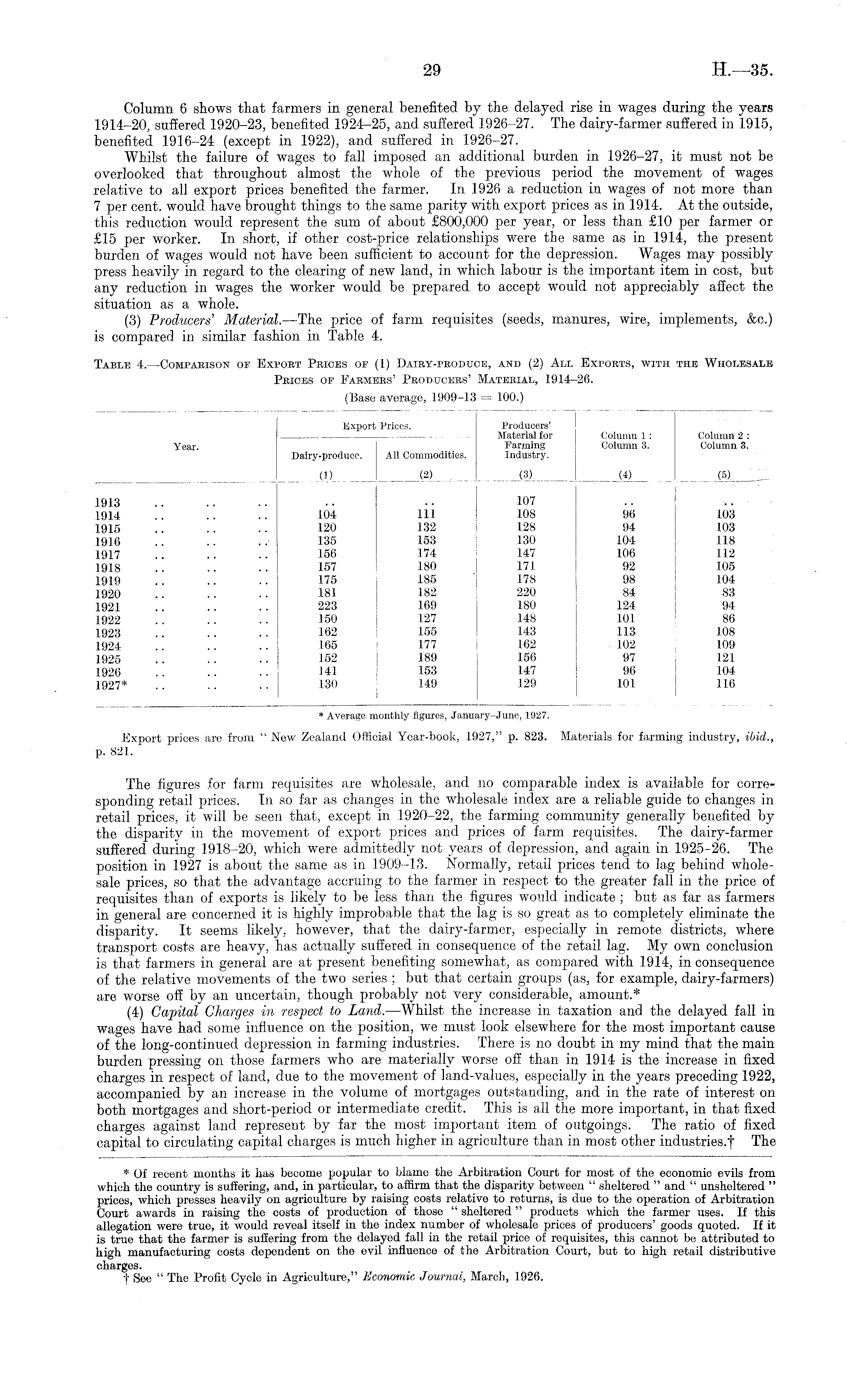 Export prices are from " New Zealand Official Year-book, 1927," p. 823. Materials for farming industry, ibid,., p. 821. The figures for farm requisites are wholesale, and no comparable index is available for corresponding retail prices. In so far as changes in the wholesale index are a reliable guide to changes in retail prices, it will be seen that, except in 1920-22, the farming community generally benefited by the disparity in the movement of export prices and prices of farm requisites. The dairy-farmer suffered during 1918-20, which were admittedly not years of depression, and again in 1925-26. The position in 1927 is about the same as in 1909-13. Normally, retail prices tend to lag behind wholesale prices, so that the advantage accruing to the farmer in respect to the greater fall in the price of requisites than of exports is likely to be less than the figures would indicate ; but as far as farmers in general are concerned it is highly improbable that the lag is so great as to completely eliminate the disparity. It seems likely, however, that the dairy-farmer, especially in remote districts, where transport costs are heavy, has actually suffered in consequence of the retail lag. My own conclusion is that farmers in general are at present benefiting somewhat, as compared with 1914, in consequence of the relative movements of the two series ; but that certain groups (as, for example, dairy-farmers) are worse off by an uncertain, though probably not very considerable, amount.* (4) Capital Charges in respect to Land. —Whilst the increase in taxation and the delayed fall in wages have had some influence on the position, we must look elsewhere for the most important cause of the long-continued depression in farming industries. There is no doubt in my mind that the main burden pressing on those farmers who are materially worse off than in 1914 is the increase in fixed charges in respect of land, due to the movement of land-values, especially in the years preceding 1922, accompanied by an increase in the volume of mortgages outstanding, and in the rate of interest on both mortgages and short-period or intermediate credit. This is all the more important, in that fixed charges against land represent by far the most important item of outgoings. The ratio of fixed capital to circulating capital charges is much higher in agriculture than in most other industries.! The