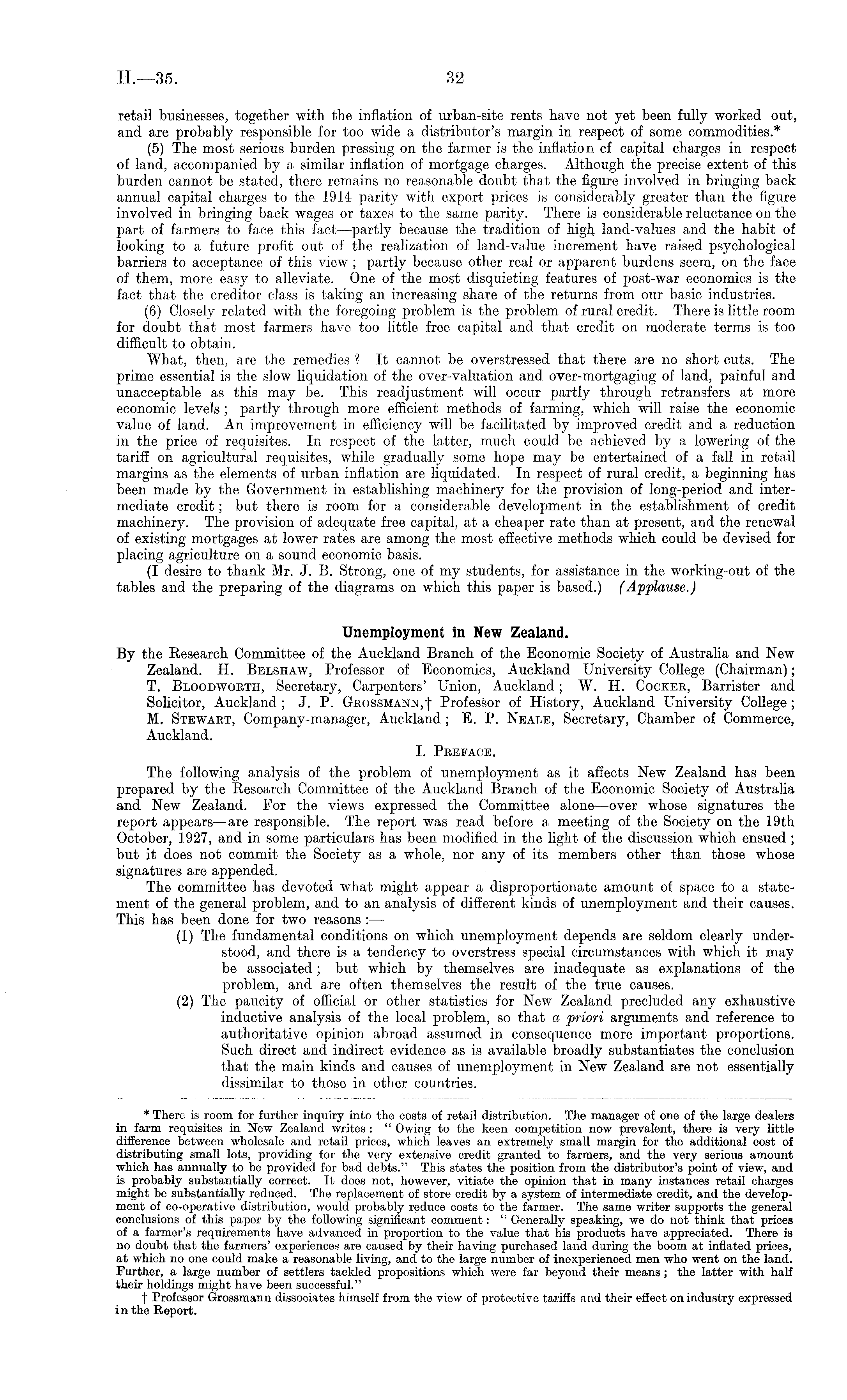 retail businesses, together with the inflation of urban-site rents have not yet been fully worked out, and are probably responsible for too wide a distributor's margin in respect of some commodities.* (5) The most serious burden pressing on the farmer is the inflation cf capital charges in respect of land, accompanied by a similar inflation of mortgage charges. Although the precise extent of this burden cannot be stated, there remains no reasonable doubt that the figure involved in bringing back annual capital charges to the 1914 parity with export prices is considerably greater than the figure involved in bringing back wages or taxes to the same parity. There is considerable reluctance on the part of farmers to face this fact —partly because the tradition of high land-values and the habit of looking to a future profit out of the realization of land-value increment have raised psychological barriers to acceptance of this view ; partly because other real or apparent burdens seem, on the face of them, more easy to alleviate. One of the most disquieting features of post-war economics is the fact that the creditor class is taking an increasing share of the returns from our basic industries. (6) Closely related with the foregoing problem is the problem of rural credit. There is little room for doubt that- most farmers have too little free capital and that credit on moderate terms is too difficult to obtain. What, then, are the remedies ? It cannot be overstressed that there are no short cuts. The prime essential is the slow liquidation of the over-valuation and over-mortgaging of land, painful and unacceptable as this may be. This readjustment will occur partly through retransfers at more economic levels ; partly through more efficient methods of farming, which will raise the economic value of land. An improvement in efficiency will be facilitated by improved credit and a reduction in the price of requisites. In respect of the latter, much could be achieved by a lowering of the tariff on agricultural requisites, while gradually some hope may be entertained of a fall in retail margins as the elements of urban inflation are liquidated. In respect of rural credit, a beginning has been made by the Government in establishing machinery for the provision of long-period and intermediate credit; but there is room for a considerable development in the establishment of credit machinery. The provision of adequate free capital, at a cheaper rate than at present, and the renewal of existing mortgages at lower rates are among the most effective methods which could be devised for placing agriculture on a sound economic basis. (I desire to thank Mr. J. B. Strong, one of my students, for assistance in the working-out of the tables and the preparing of the diagrams on which this paper is based.) (Applause.) Unemployment in New Zealand. By the Research Committee of the Auckland Branch of the Economic Society of Australia and New Zealand. H. Belshaw, Professor of Economics, Auckland University College (Chairman); T. Bloodworth, Secretary, Carpenters' Union, Auckland; W. H. Cocker, Barrister and Solicitor, Auckland ; J. P. Grossmann, j Professor of History, Auckland University College ; M. Stewart, Company-manager, Auckland; E. P. Neale, Secretary, Chamber of Commerce, Auckland. I. Preface. The following analysis of the problem of unemployment as it affects New Zealand has been prepared by the Research Committee of the Auckland Branch of the Economic Society of Australia and New Zealand. For the views expressed the Committee alone —over whose signatures the report appears —are responsible. The report was read before a meeting of the Society on the 19th October, 1927, and in some particulars has been modified in the light of the discussion which ensued ; but it does not commit the Society as a whole, nor any of its members other than those whose signatures are appended. The committee has devoted what might appear a disproportionate amount of space to a statement of the general problem, and to an analysis of different kinds of unemployment and their causes. This has been done for two reasons :— (1) The fundamental conditions on which unemployment depends are seldom clearly understood, and there is a tendency to overstress special circumstances with which it may be associated; but which by themselves are inadequate as explanations of the problem, and are often themselves the result of the true causes. (2) The paucity of official or other statistics for New Zealand precluded any exhaustive inductive analysis of the local problem, so that a priori arguments and reference to authoritative opinion abroad assumed in consequence more important proportions. Such direct and indirect evidence as is available broadly substantiates the conclusion that the main kinds and causes of unemployment in New Zealand are not essentially dissimilar to those in other countries.