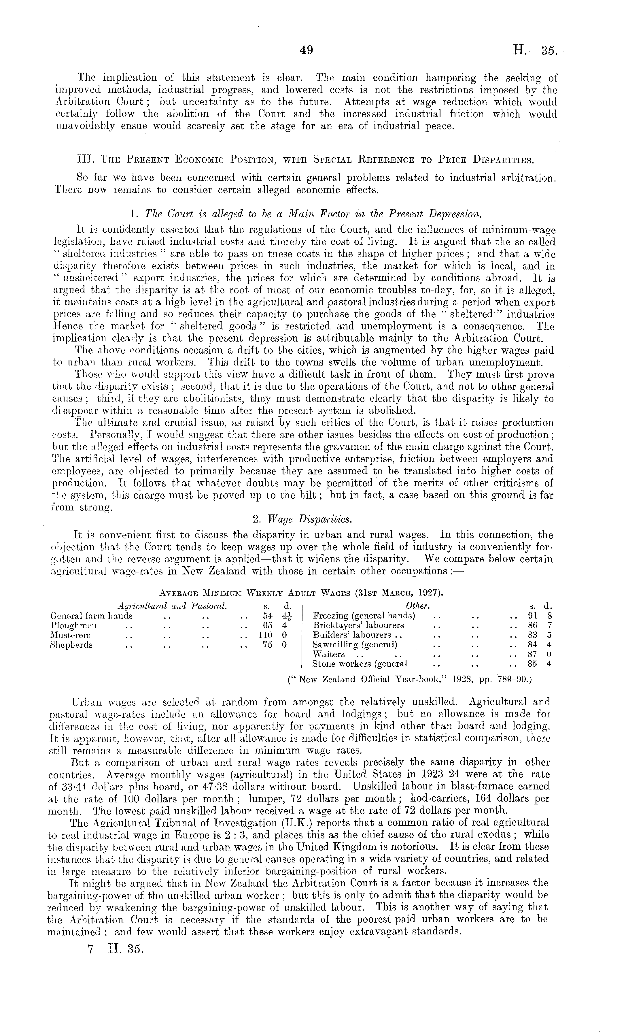 The implication of this statement is clear. The main condition hampering the seeking of improved methods, industrial progress, and lowered costs is not the restrictions imposed by the Arbitration Court; but uncertainty as to the future. Attempts at wage reduction which would certainly follow the abolition of the Court and the increased industrial friction which would unavoidably ensue would scarcely set the stage for an era of industrial peace. 111. The Present Economic Position, with Special Reference to Price Disparities. So far we have been concerned with certain general problems related to industrial arbitration. There now remains to consider certain alleged economic effects. 1. The Court is alleged to be a Main Factor in the Present Depression. It is confidently asserted that the regulations of the Court, and the influences of minimum-wage legislation, have raised industrial costs and thereby the cost of living. It is argued that the so-called " sheltered industries " are able to pass on these costs in the shape of higher prices ; and that a wide disparity therefore exists between prices in such industries, the market for which is local, and in " unsheltered " export industries, the prices for which are determined by conditions abroad. It is argued that the disparity is at the root of most of our economic troubles to-day, for, so it is alleged, it maintains costs at a high level in the agricultural and pastoral industries during a period when export prices are falling and so reduces their capacity to purchase the goods of the " sheltered " industries Hence the market for " sheltered goods " is restricted and unemployment is a consequence. The implication clearly is that the present depression is attributable mainly to the Arbitration Court. The above conditions occasion a drift to the cities, which is augmented by the higher wages paid to urban than rural workers. This drift to the towns swells the volume of urban unemployment. Those who would support this view have a difficult task in front of them. They must first prove that the disparity exists ; second, that it is due to the operations of the Court, and not to other general causes ; third, if they are abolitionists, they must demonstrate clearly that the disparity is likely to disappear within a reasonable time after the present system is abolished. The ultimate and crucial issue, as raised by such critics of the Court, is that it raises production costs. Personally, I would suggest that there are other issues besides the effects on cost of production; but the alleged effects on industrial costs represents the gravamen of the main charge against the Court. The artificial level of wages, interferences with productive enterprise, friction between employers and employees, are objected to primarily because they are assumed to be translated into higher costs of production. It follows that whatever doubts may be permitted of the merits of other criticisms of the system, this charge must be proved up to the hilt; but in fact, a case based on this ground is far from strong. 2. Wage Disparities. It is convenient first to discuss the disparity in urban and rural wages. In this connection-, the objection that the Court tends to keep wages up over the whole field of industry is conveniently forgotten and the reverse argument is applied —that it widens the disparity. We compare below certain agricultural wage-rates in New Zealand with those in certain other occupations : — Average Minimum Weekly Adult Wages (31st March, 1927). Agricultural and Pastoral. s. d. Other. s. d. General farm hands .. .. .. 54 4-| Freezing (general hands) .. .. .. 91 8 Ploughmen .. .. .. .. 65 4 Bricklayers' labourers .. .. 86 7 Musterers .. .. .. 110 0 Builders'labourers .. .. .. 83 5 Shepherds .. .. .. .. 75 0 Sawmilling (general) .. .. 84 4 Waiters .. .. .. .. 87 0 Stone workers (general .. .. 85 4 (" New Zealand Official Year-book," 1928, pp. 789-90.) Urban wages are selected at random from amongst the relatively unskilled. Agricultural and pastoral wage-rates include an allowance for board and lodgings ; but no allowance is made for differences in the cost of living, nor apparently for payments in kind other than board and lodging. It is apparent, however, that, after all allowance is made for difficulties in statistical comparison, there still remains a measurable difference in minimum wage rates. But a comparison of urban and rural wage rates reveals precisely the same disparity in other countries. Average monthly wages (agricultural) in the United States in 1923-24 were at the rate of 33-41 dollars plus board, or 47'38 dollars without board. Unskilled labour in blast-furnace earned at the rate of 100 dollars per month ; lumper, 72 dollars per month ; hod-carriers, 164 dollars per month. The lowest paid unskilled labour received a wage at the rate of 72 dollars per month. The Agricultural Tribunal of Investigation (U.K.) reports that a common ratio of real agricultural to real industrial wage in Europe is 2 : 3, and places this as the chief cause of the rural exodus ; while the disparity between rural and urban wages in the United Kingdom is notorious. It is clear from these instances that the disparity is due to general causes operating in a wide variety of countries, and related in large measure to the relatively inferior bargaining-position of rural workers. It might be argued that in New Zealand the Arbitration Court is a factor because it increases the bargaining-power of the unskilled urban worker ; but this is only to admit that the disparity would be reduced by weakening the bargaining-power of unskilled labour. This is another way of saying that the Arbitration Court is necessary if the standards of the poorest-paid urban workers are to be maintained ; and few would assert that these workers enjoy extravagant standards.