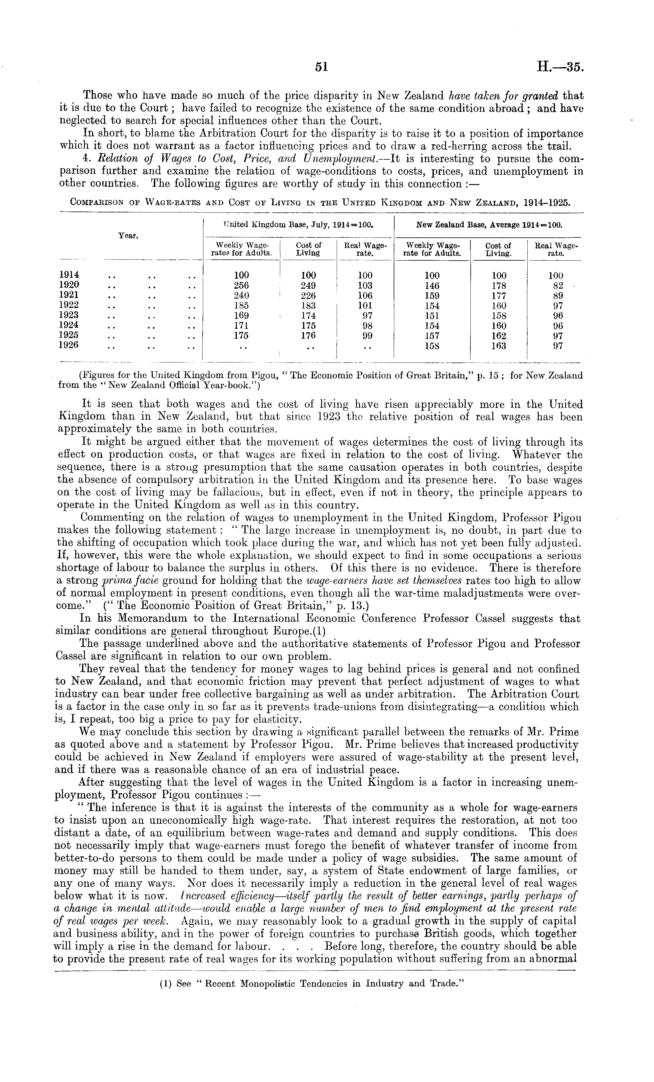 (Figures for the United Kingdom from Pigou, " The Economic Position of Great Britaiu," p. 15 ; for New Zealand from the "New Zealand Official Year-book.") It is seen that both, wages and the cost of living have risen appreciably more in the United Kingdom than in New Zealand, but that since 1923 the relative position of real wages has been approximately the same in both countries. It might be argued either that the movement of wages determines the cost of living through its effect on production costs, or that wages are fixed in relation to the cost of living. Whatever the sequence, there is a strong presumption that the same causation operates in both countries, despite the absence of compulsory arbitration in the United Kingdom and its presence here. To base wages on the cost of living may be fallacious, but in effect, even if not in theory, the principle appears to operate in the United Kingdom as well as in this country. Commenting on the relation of wages to unemployment in the United Kingdom, Professor Pigou makes the following statement: " The large increase in unemployment is, no doubt, in part due to the shifting of occupation which took place during the war, and which has not yet been fully adjusted. If, however, this were the whole explanation, we should expect to find in some occupations a serious shortage of labour to balance the surplus in others. Of this there is no evidence. There is therefore a strong prima facie ground for holding that the wage-earners have set themselves rates too high to allow of normal employment in present conditions, even though all the war-time maladjustments were overcome." (" The Economic Position of Great Britain," p. 13.) In his Memorandum to the International Economic Conference Professor Cassel suggests that similar conditions are general throughout Europe.(l) The passage underlined above and the authoritative statements of Professor Pigou and Professor Cassel are significant in relation to our own problem. They reveal that the tendency for money wages to lag behind prices is general and not confined to New Zealand, and that economic friction may prevent that perfect adjustment of wages to what industry can bear under free collective bargaining as well as under arbitration. The Arbitration Court is a factor in the case only in so far as it prevents trade-unions from disintegrating—a condition which is, I repeat, too big a price to pay for elasticity. We may conclude this section by drawing a significant parallel between the remarks of Mr. Prime as quoted above and a statement by Professor Pigou. Mr. Prime believes that increased productivity could be achieved in New Zealand if employers were assured of wage-stability at the present level, and if there was a reasonable chance of an era of industrial peace. After suggesting that the level of wages in the United Kingdom is a factor in increasing unemployment, Professor Pigou continues : — " The inference is that it is against the interests of the community as a whole for wage-earners to insist upon an uneconomically high wage-rate. That interest requires the restoration, at not too distant a date, of an equilibrium between wage-rates and demand and supply conditions. This does not necessarily imply that wage-earners must forego the benefit of whatever transfer of income from better-to-do persons to them could be made under a policy of wage subsidies. The same amount of money may still be handed to them under, say, a system of State endowment of large families, or any one of many ways. Nor does it necessarily imply a reduction in the general level of real wages below what it is now. Increased efficiency—itself partly the result of better earnings, partly perhaps of a change in mental attitude —would enable a large number of men to find employment at the present rate of real ivages per week. Again, we may reasonably look to a gradual growth in the supply of capital and business ability, and in the power of foreign countries to purchase British goods, which together will imply a rise in the demand for labour. . . . Before long, therefore, the country should be able to provide the present rate of real wages for its working population without suffering from an abnormal