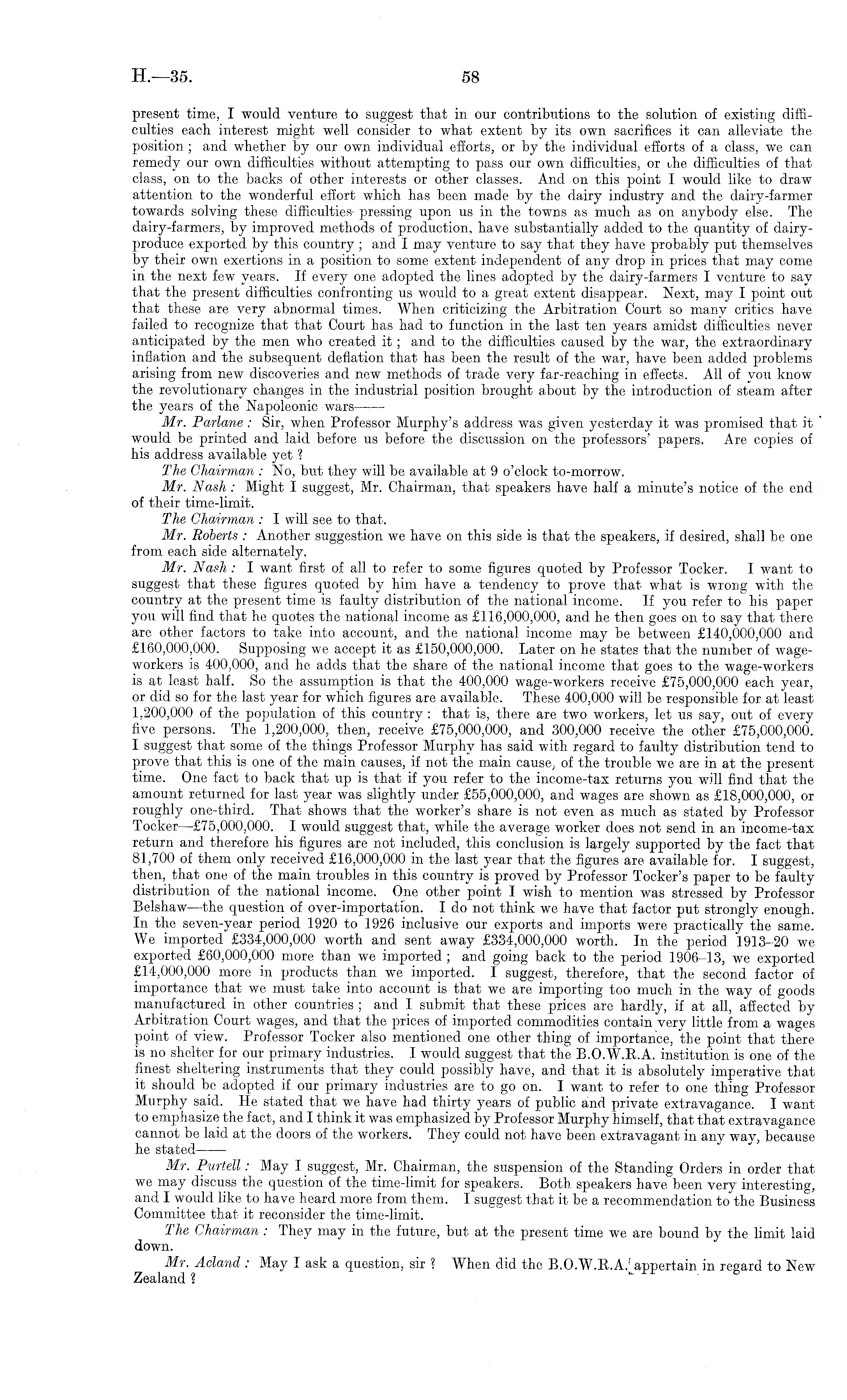 present time, I would venture to suggest that in our contributions to the solution of existing difficulties each interest might well consider to what extent by its own sacrifices it can alleviate the position ; and whether by our own individual efforts, or by the individual efforts of a class, we can remedy our own difficulties without attempting to pass our own difficulties, or uhe difficulties of that class, on to the backs of other interests or other classes. And on this point I would like to draw attention to the wonderful effort which has been made by the dairy industry and the dairy-farmer towards solving these difficulties' pressing upon us in the towns as much as on anybody else. The dairy-farmers, by improved methods of production, have substantially added to the quantity of dairyproduce exported by this country ; and I may venture to say that they have probably put themselves by their own exertions in a position to some extent independent of any drop in prices that may come in the next few years. If every one adopted the lines adopted by the dairy-farmers I venture to say that the present difficulties confronting us would to a great extent disappear. Next, may I point out that these are very abnormal times. When criticizing the Arbitration Court so many critics have failed to recognize that that Court has had to function in the last ten years amidst difficulties never anticipated by the men who created it ; and to the difficulties caused by the war, the extraordinary inflation and the subsequent deflation that has been the result of the war, have been added problems arising from new discoveries and new methods of trade very far-reaching in effects. All of you know the revolutionary changes in the industrial position brought about by the introduction of steam after the years of the Napoleonic wars Mr. Parlane : Sir, when Professor Murphy's address was given yesterday it was promised that it would be printed and laid before us before the discussion on the professors' papers. Are copies of his address available yet ? The Chairman : No, but they will be available at 9 o'clock to-morrow. Mr. Nash : Might I suggest, Mr. Chairman, that speakers have half a minute's notice of the end of their time-limit. The Chairman : I will see to that. Mr. Roberts : Another suggestion we have on this side is that the speakers, if desired, shall be one from each side alternately. Mr. Nash : I want first of all to refer to some figures quoted by Professor Tocker. I want to suggest that these figures quoted by him have a tendency to prove that what is wrong with the country at the present time is faulty distribution of the national income. If you refer to his paper you will find that he quotes the national income as £116,000,000, and he then goes on to say that there are other factors to take into account, and the national income may be between £140,000,000 and £160,000,000. Supposing we accept it as £150,000,000. Later on he states that the number of wageworkers is 400,000, and he adds that the share of the national income that goes to the wage-workers is at least half. So the assumption is that the 400,000 wage-workers receive £75,000,000 each year, or did so for the last year for which figures are available. These 400,000 will be responsible for at least 1,200,000 of the population of this country : that is, there are two workers, let us say, out of every five persons. The 1,200,000, then, receive £75,000,000, and 300,000 receive the other £75,000,000. I suggest that some of the things Professor Murphy has said with regard to faulty distribution tend to prove that this is one of the main causes, if not the main cause, of the trouble we are in. at the present time. One fact to back that up is that if you refer to the income-tax returns you will find that the amount returned for last year was slightly under £55,000,000, and wages are shown as £18,000,000, or roughly one-third. That shows that the worker's share is not even as much as stated by Professor Tocker —£75,000,000. I would suggest that, while the average worker does not send in an income-tax return and therefore his figures are not included, this conclusion is largely supported by the fact that 81,700 of them only received £16,000,000 in the last year that the figures are available for. I suggest, then, that one of the main troubles in this country is proved by Professor Tocker's paper to be faulty distribution of the national income. One other point I wish to mention was stressed by Professor Belshaw—the question of over-importation. Ido not think we have that factor put strongly enough. In the seven-year period 1920 to 1926 inclusive our exports and imports were practically the same. We imported £334,000,000 worth and sent away £334,000,000 worth. In the period 1913-20 we exported £60,000,000 more than we imported ; and going back to the period 1906-13, we exported £14,000,000 more in products than we imported. I suggest, therefore, that the second factor of importance that we must take into account is that we are importing too much in the way of goods manufactured in other countries ; and I submit that these prices are hardly, if at all, affected by Arbitration Court wages, and that the prices of imported commodities contain very little from a wages point of view. Professor Tocker also mentioned one other thing of importance, the point that there is no shelter for our primary industries. I would suggest that the 8.0.W.R.A. institution is one of the finest sheltering instruments that they could possibly have, and that it is absolutely imperative that it should be adopted if our primary industries are to go on. I want to refer to one thing Professor Murphy said. He stated that we have had thirty years of public and private extravagance. I wantto emphasize the fact, and I think it was emphasized by Professor Murphy himself, that that extravagance cannot be laid at the doors of the workers. They could not have been extravaga