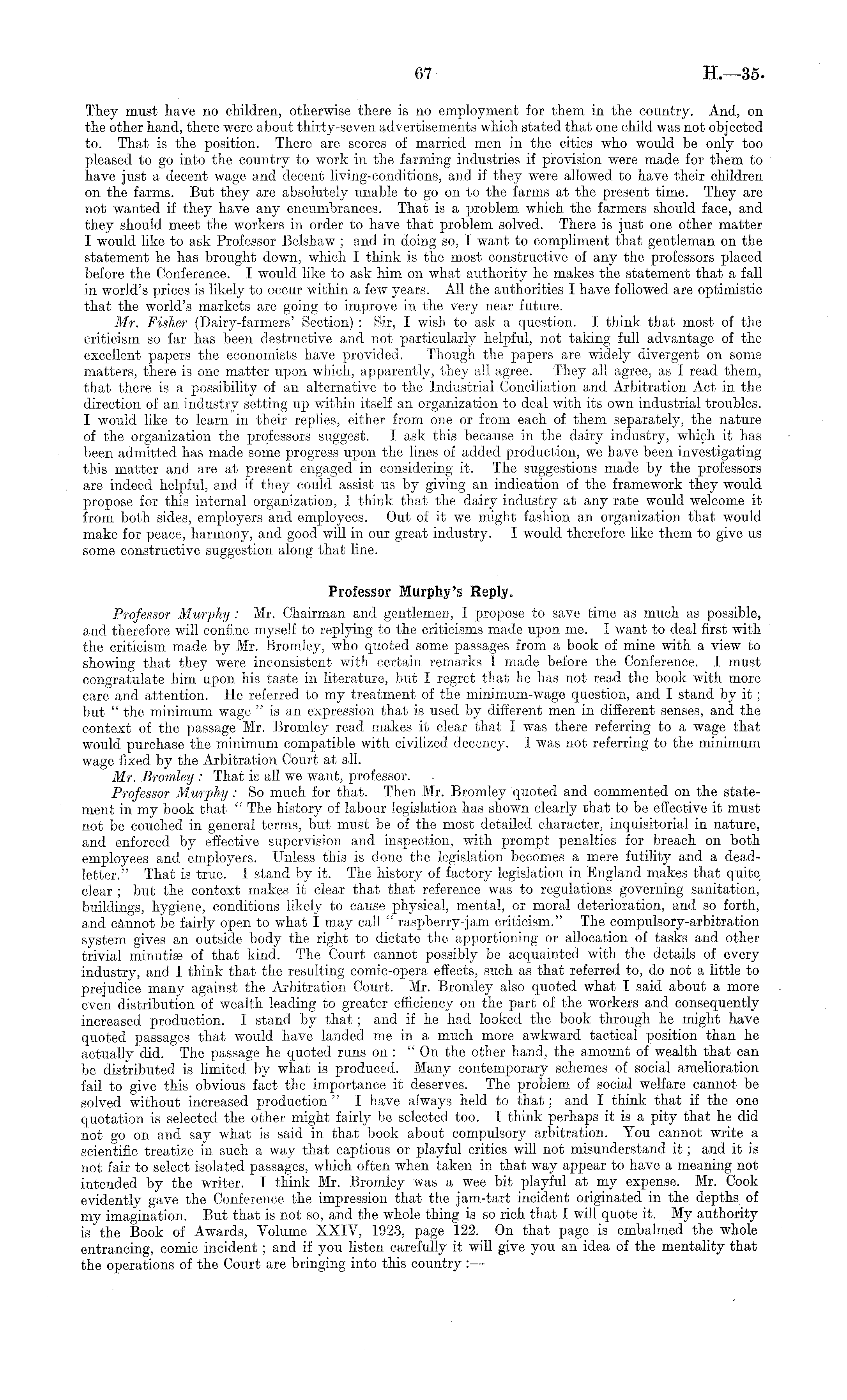 They must have no children, otherwise there is 110 employment for them in the country. And, on the other hand, there were about thirty-seven advertisements which stated that one child was not objected to. That is the position. There are scores of married men in the cities who would be only too pleased to go into the country to work in the farming industries if provision were made for them to have just a decent wage and decent living-conditions, and if they were allowed to have their children on the farms. But they are absolutely unable to go on to the farms at the present time. They are not wanted if they have any encumbrances. That is a problem which the farmers should face, and they should meet the workers in order to have that problem solved. There is just one other matter I would like to ask Professor Belshaw ; and in doing so, I want to compliment that gentleman on the statement he has brought down, which I think is the most constructive of any the professors placed before the Conference. I would like to ask him on what authority he makes the statement that a fall in world's prices is likely to occur within a few years. All the authorities I have followed are optimistic that the world's markets are going to improve in the very near future. Mr. Fisher (Dairy-farmers' Section) : Sir, I wish to ask a question. I think that most of the criticism so far has been destructive and not particularly helpful, not taking full advantage of the excellent papers the economists have provided. Though the papers are widely divergent on some matters, there is one matter upon which, apparently, they all agree. They all agree, as I read them, that there is a possibility of an alternative to the Industrial Conciliation and Arbitration Act in the direction of an industry setting up within itself an organization to deal with its own industrial troubles. I would like to learn in their replies, either from one or from each of them separately, the nature of the organization the professors suggest. I ask this because in the dairy industry, which it has been admitted has made some progress upon the lines of added production, we have been investigating this matter and are at present engaged in considering it. The suggestions made by the professors are indeed helpful, and if they could assist us by giving an indication of the framework they would propose for this internal organization, I think that the dairy industry at any rate would welcome it from both sides, employers and employees. Out of it we might fashion an organization that would make for peace, harmony, and good will in our great industry. I would therefore like them to give us some constructive suggestion along that line. Professor Murphy's Reply. Professor Murphy : Mr. Chairman and gentlemen, I propose to save time as much as possible, and therefore will confine myself to replying to the criticisms made upon me. I want to deal first with the criticism made by Mr. Bromley, who quoted some passages from a book of mine with a view to showing that they were inconsistent with certain remarks I made before the Conference. I must congratulate bim upon his taste in literature, but I regret that he has not read the book with more care and attention. He referred to my treatment of the minimum-wage question, and I stand by it; but " the minimum wage " is an expression that is used by different men in different senses, and the context of the passage Mr. Bromley read makes it clear that I was there referring to a wage that would purchase the minimum compatible with civilized decency. I was not referring to the minimum wage fixed by the Arbitration Court at all. Mr. Bromley : That is all we want, professor. Professor Murphy : So much for that. Then Mr. Bromley quoted and commented on the statement in my book that " The history of labour legislation has shown clearly that to be effective it must not be couched in general terms, but must be of the most detailed character, inquisitorial in nature, and enforced by effective supervision and inspection, with prompt penalties for breach on both employees and employers. Unless this is done the legislation becomes a mere futility and a deadletter." That is true. I stand by it. The history of factory legislation in England makes that quite clear ; but the context makes it clear that that reference was to regulations governing sanitation, buildings, hygiene, conditions likely to cause physical, mental, or moral deterioration, and so forth, and cannot be fairly open to what I may call " raspberrv-jam criticism." The compulsory-arbitration system gives an outside body the right to dictate the apportioning or allocation of tasks and other trivial minutiae of that kind. The Court, cannot possibly be acquainted with the details of every industry, and I think that the resulting comic-opera effects, such as that referred to, do not a little to prejudice many against the Arbitration Court. Mr. Bromley also quoted what I said about a more even distribution of wealth leading to greater efficiency on the part of the workers and consequently increased production. I stand by that; and if he had looked the book through he might have quoted passages that would have landed me in a much more awkward tactical position than he actually did. The passage he quoted runs on : "On the other hand, the amount of wealth that can be distributed is limited by what is produced. Many contemporary schemes of social amelioration fail to give this obvious fact the importance it deserves. The problem of social welfare cannot be solved without increased production " I have always held to that; and I think that if the one quotation is selected the other might fairly be selected too. I think perhaps it is a pity that he did not go on and say what is said in that book about compulsory arbitration. You cannot write a scientific treatize in such a way that captious or playful critics will not misunderstand it; and it is not fair to select isolated passages, which o