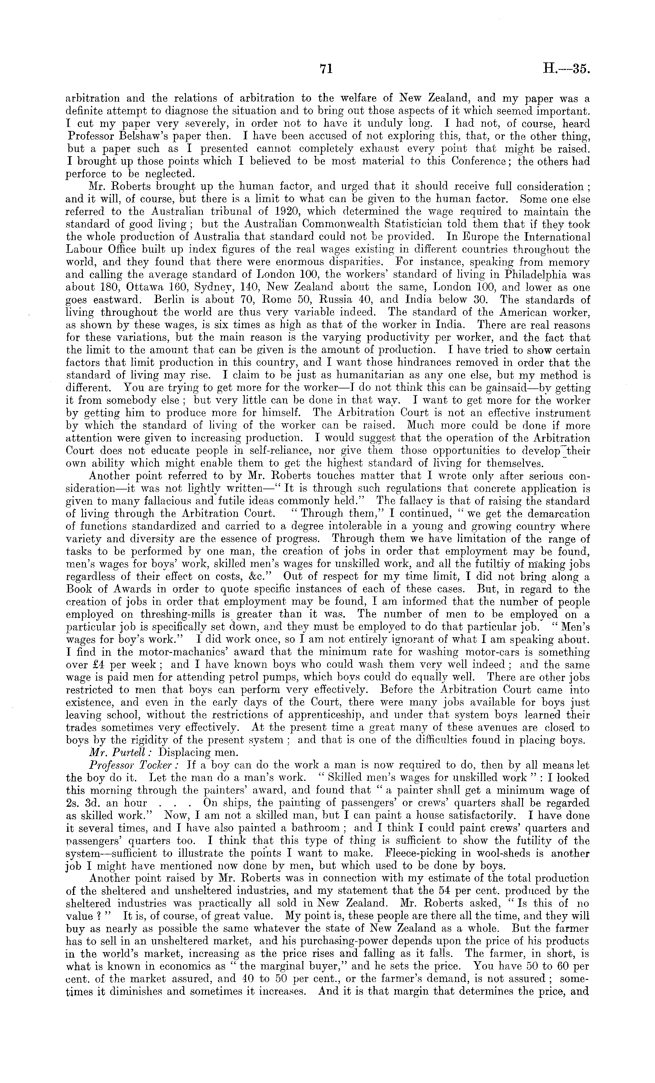 arbitration and the relations of arbitration to the welfare of New Zealand, and my paper was a definite attempt to diagnose the situation and to bring out those aspects of it which seemed important. I cut my paper very severely, in order not to have it unduly long. I had not, of course, heard Professor Belshaw's paper then. I have been accused of not exploring this, that, or the other thing, but a paper such as I presented cannot completely exhaust every point that might be raised. I brought up those points which I believed to be most material to this Conference; the others had perforce to be neglected. Mr. Roberts brought up the human factor, and urged that it should receive full consideration ; and it will, of course, but there is a limit to what can be given to the human factor. Some one else referred to the Australian tribunal of 1920, which determined the wage required to maintain the standard of good living ; but the Australian Commonwealth Statistician told them that if they took the whole production of Australia that standard could not be provided. In Europe the International Labour Office built up index figures of the real wages existing in different countries throughout the world, and they found that there were enormous disparities. For instance, speaking from memory and calling the average standard of London 100, the workers' standard of living in Philadelphia was about 180, Ottawa 160, Sydney, 140, New Zealand about the same, London 100, and lower as one goes eastward. Berlin is about 70, Rome 50, Russia 40, and India below 30. The standards of living throughout the world are thus very variable indeed. The standard of the American worker, as shown by these wages, is six times as high as that of the worker in India. There are real reasons for these variations, but the main reason is the varying productivity per worker, and the fact that the limit to the amount that can be given is the amount of production. I have tried to show certain factors that limit production in this country, and I want those hindrances removed in order that the standard of living may rise. I claim to be just as humanitarian as any one else, but my method is different. You are trying to get more for the worker —I do not think this can be gainsaid—by getting it from somebody else ; but very little can be done in that way. I want to get more for the worker by getting him to produce more for himself. The Arbitration Court is not an effective instrument by which the standard of living of the worker can be raised. Much more could be done if more attention were given to increasing production. I would suggest that the operation of the Arbitration Court does not educate people in self-reliance, nor give them those opportunities to develop "their own ability which might enable them to get the highest standard of living for themselves. Another point referred to by Mr. Roberts touches matter that I wrote only after serious consideration —it was not lightly written —" It is through such regulations that concrete application is given to many fallacious and futile ideas commonly held." The fallacy is that of raising the standard of living through the Arbitration Court. " Through them," I continued, "we get the demarcation of functions standardized and carried to a degree intolerable in a young and growing country where variety and diversity are the essence of progress. Through them we have limitation of the range of tasks to be performed by one man, the creation of jobs in order that employment may be found, men's wages for boys' work, skilled men's wages for unskilled work, and all the futiltiy of making jobs regardless of their effect on costs, &c." Out of respect for my time limit, I did not bring along a Book of Awards in order to quote specific instances of each of these cases. But, in regard to the creation of jobs in order that employment may be found, I am informed that the number of people employed on threshing-mills is greater than it was. The number of men to be employed on a particular job is specifically set down, and they must be employed to do that particular job. " Men's wages for boy's work." I did work once, so lam not entirely ignorant of what lam speaking about. I find in the motor-machanics' award that the minimum rate for washing motor-cars is something over £4 per week ; and I have known boys who could wash them very well indeed ; and the same wage is paid men for attending petrol pumps, which boys could do equally well. There are other jobs restricted to men that boys can perform very effectively. Before the Arbitration Court came into existence, and even in the early days of the Court, there were many jobs available for boys just leaving school, without the restrictions of apprenticeship, and under that system boys learned their trades sometimes very effectively. At the present time a great many of these avenues are closed to boys by the rigidity of the present system ; and that is one of the difficulties found in placing boys. Mr. Purtell: Displacing men. Professor Tocker : If a boy can do the work a man is now required to do, then by all means let the boy do it. Let the man do a man's work. " Skilled men's wages for unskilled work ": I looked this morning through the painters' award, and found that " a painter shall get a minimum wage of 2s. 3d. an hour ... On ships, the painting of passengers' or crews' quarters shall be regarded as skilled work." Now, lam not a skilled man, but I can paint a house satisfactorily. I have done it several times, and I have also painted a bathroom ; and I think I could paint crews' quarters and passengers' quarters too. I think that this type of thing is sufficient to show the futility of the system —sufficient to illustrate the points I want to make. Fleece-picking in wool-sheds is another job I might have mentioned now done by men, but which used to be done by boys. Another point raised by Mr. Roberts was in connection with my estimate of the total