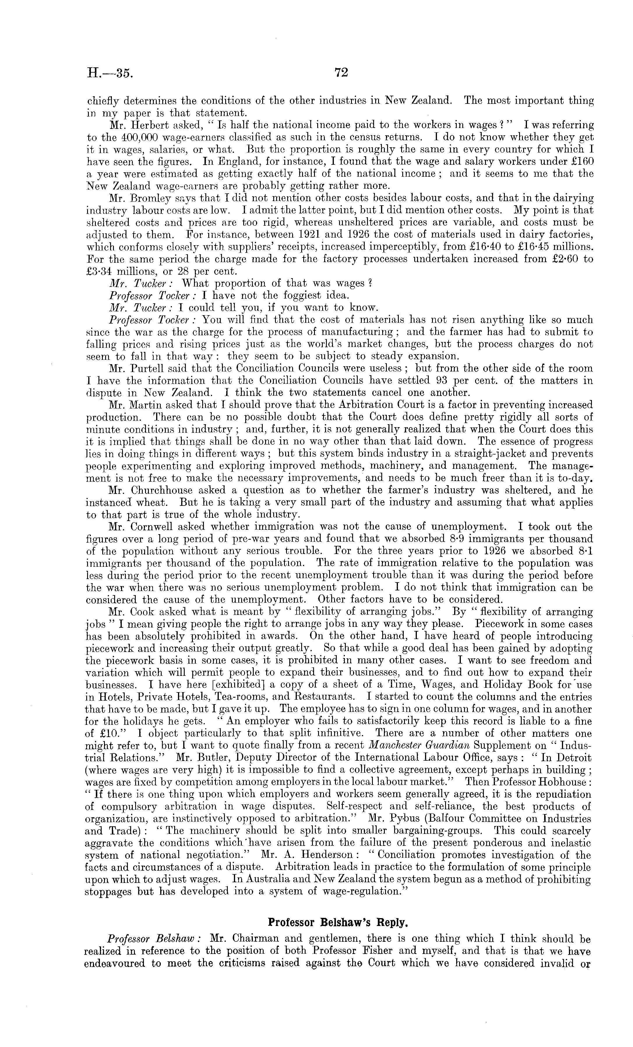 chiefly determines the conditions of the other industries in New Zealand. The most important thing in my paper is that statement. Mr. Herbert asked, "Is half the national income paid to the workers in wages ? " I was referring to the 400,000 wage-earners classified as such in the census returns. Ido not know whether they get it in wages, salaries, or what. But the proportion is roughly the same in every country for which I have seen the figures. In England, for instance, I found that the wage and salary workers under £160 a year were estimated as getting exactly half of the national income ; and it seems to me that the New Zealand wage-earners are probably getting rather more. Mr. Bromley says that I did not mention other costs besides labour costs, and that in the dairying industry labour costs are low. I admit the latter point, but I did mention other costs. My point is that sheltered costs and prices are too rigid, whereas unsheltered prices are variable, and costs must be adjusted to them. For instance, between 1921 and 1926 the cost of materials used in dairy factories, which conforms closely with suppliers' receipts, increased imperceptibly, from £16-40 to £1645 millions. For the same period the charge made for the factory processes undertaken increased from £2-60 to £3-34 millions, or 28 per cent. Mr. Tucker: What proportion of that was wages ? Professor Tocker : I have not the foggiest idea. Mr. Tucker : I could tell you, if you want to know. Professor Tocker : You will find that the cost of materials has not risen anything like so much since the war as the charge for the process of manufacturing ; and the farmer has had to submit to falling prices and rising prices just as the world's market changes, but the process charges do not seem to fall in that way : they seem to be subject to steady expansion. Mr. Purtell said that the Conciliation Councils were useless ; but from the other side of the room I have the information that the Conciliation Councils have settled 93 per cent, of the matters in dispute in New Zealand. I think the two statements cancel one another. Mr. Martin asked that I should prove that the Arbitration Court is a factor in preventing increased production. There can be no possible doubt that the Court does define pretty rigidly all sorts of minute conditions in industry ; and, farther, it is not generally realized that when the Court does this it is implied that things shall be done in no way other than that laid down. The essence of progress lies in doing things in different ways ; but this system binds industry in a straight-jacket and prevents people experimenting and exploring improved methods, machinery, and management. The management is not free to make the necessary improvements, and needs to be much freer than it is to-day. Mr. Churchhouse asked a question as to whether the farmer's industry was sheltered, and he instanced wheat. But he is taking a very small part of the industry and assuming that what applies to that part is true of the whole industry. Mr. Cornwell asked whether immigration was not the cause of unemployment. I took out the figures over a long period of pre-war years and found that we absorbed 8-9 immigrants per thousand of the population without any serious trouble. For the three years prior to 1926 we absorbed 8-1 immigrants per thousand of the population. The rate of immigration relative to the population was less during the period prior to the recent unemployment trouble than it was during the period before the war when there was no serious unemployment problem. Ido not think that immigration can be considered the cause of the unemployment. Other factors have to be considered. Mr. Cook asked what is meant by " flexibility of arranging jobs." By " flexibility of arranging jobs " I mean giving people the right to arrange jobs in any way they please. Piecework in some cases has been absolutely prohibited in awards. On the other hand, I have heard of people introducing piecework and increasing their output greatly. So that while a good deal has been gained by adopting the piecework basis in some cases, it is prohibited in many other cases. I want to see freedom and variation which will permit people to expand their businesses, and to find out how to expand their businesses. I have here [exhibited] a copy of a sheet of a Time, Wages, and Holiday Book for use in Hotels, Private Hotels, Tea-rooms, and Restaurants. I started to count the columns and the entries that have to be made, but I gave it up. The employee has to sign in one column for wages, and in another for the holidays he gets. "An employer who fails to satisfactorily keep this record is liable to a fine of £10." I object particularly to that split infinitive. There are a number of other matters one might refer to, but I want to quote finally from a recent Manchester Guardian Supplement on " Industrial Relations." Mr. Butler, Deputy Director of the International Labour Office, says : "In Detroit (where wages are very high) it is impossible to find a collective agreement, except perhaps in building ; wages are fixed by competition among employers in the local labour market." Then Professor Hobhouse : " If there is one thing upon which employers and workers seem generally agreed, it is the repudiation of compulsory arbitration in wage disputes. Self-respect and self-reliance, the best products of organization, are instinctively opposed to arbitration." Mr. Py-bus (Balfour Committee on Industries and Trade) : " The machinery should be split into smaller bargaining-groups. This could scarcely aggravate the conditions which'have arisen from the failure of the present ponderous and inelastic system of national negotiation." Mr. A. Henderson : " Conciliation promotes investigation of the facts and circumstances of a dispute. Arbitration leads in practice to the formulation of some principle upon which to adjust wages. In Australia and New Zealand the system begun as a method of p