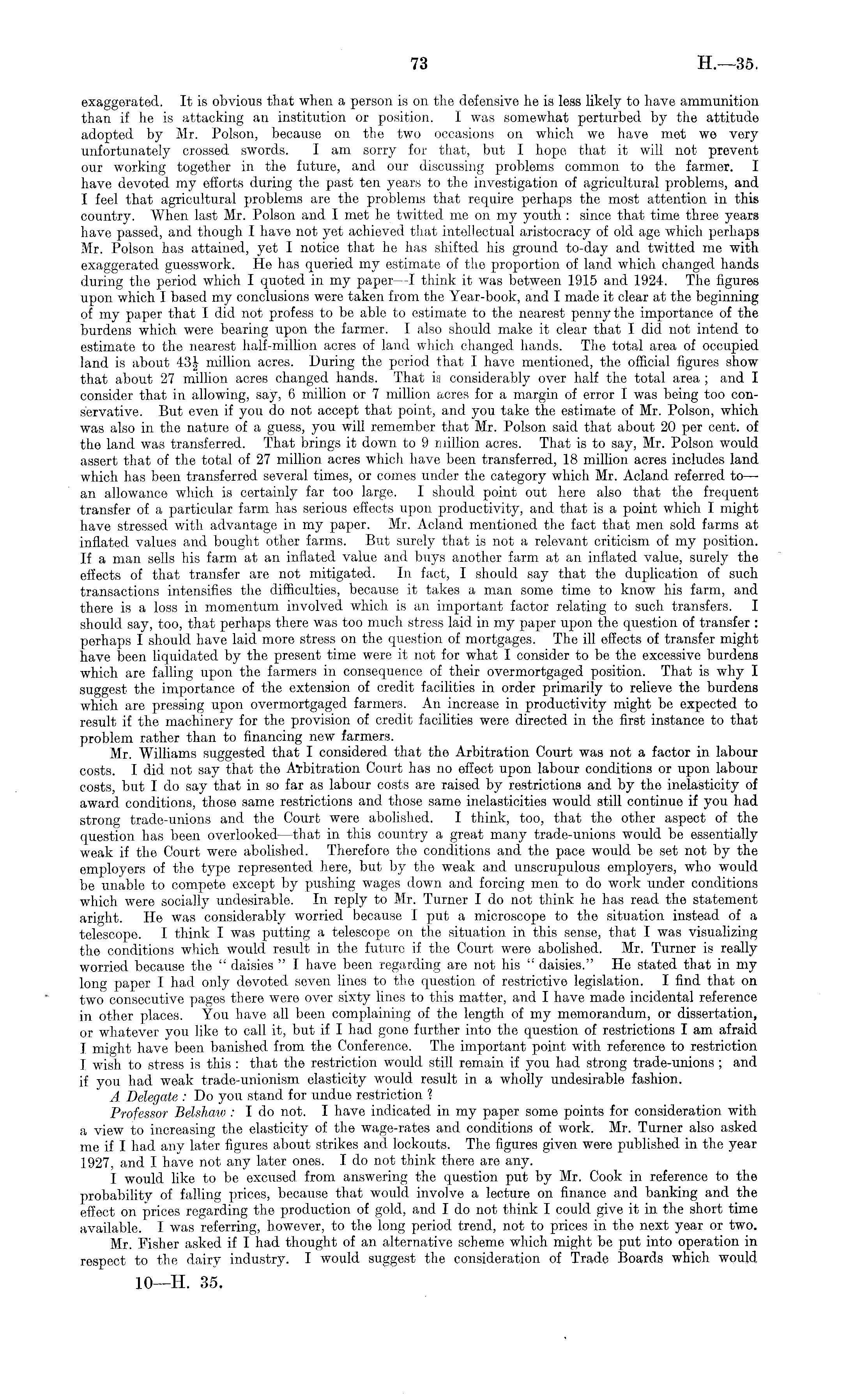 exaggerated. It is obvious that when a person is on the defensive he is less likely to have ammunition than if he is attacking an institution or position. I was somewhat perturbed by the attitude adopted by Mr. Poison, because on the two occasions on which we have met we very unfortunately crossed swords. I am sorry for that, but I hope that it will not prevent our working together in the future, and our discussing problems common to the farmer. I have devoted my efforts during the past ten years to the investigation of agricultural problems, and I feel that agricultural problems are the problems that require perhaps the most attention in this country. When last Mr. Poison and I met he twitted me on my youth : since that time three years have passed, and though I have not yet achieved that intellectual aristocracy of old age which perhaps Mr. Poison has attained, yet I notice that he has shifted his ground to-day and twitted me with exaggerated guesswork. He has queried my estimate of the proportion of land which changed hands during the period which I quoted in my paper —I think it was between 1915 and 1924. The figures upon which I based my conclusions were taken from the Year-book, and I made it clear at the beginning of my paper that I did not profess to be able to estimate to the nearest penny the importance of the burdens which were bearing upon the farmer. I also should make it clear that I did not intend to estimate to the nearest half-million acres of land which changed hands. The total area of occupied land is about million acres. During the period that I have mentioned, the official figures show that about 27 million acres changed hands. That ia considerably over half the total area ; and I consider that in allowing, say, 6 million or 7 million acres for a margin of error I was being too conservative. But even if you do not accept that point, and you take the estimate of Mr. Poison, which was also in the nature of a guess, you will remember that Mr. Poison said that about 20 per cent, of the land was transferred. That brings it down to 9 million acres. That is to say, Mr. Poison would assert that of the total of 27 million acres which have been transferred, 18 million acres includes land which has been transferred several times, or comes under the category which Mr. Acland referred to—• an allowance which is certainly far too large. I should point out here also that the frequent transfer of a particular farm has serious effects upon productivity, and that is a point which I might have stressed with advantage in my paper. Mr. Acland mentioned the fact that men sold farms at inflated values and bought other farms. But surely that is not a relevant criticism of my position. If a man sells his farm at an inflated value and buys another farm at an inflated value, surely the effects of that transfer are not mitigated. In fact, I should say that the duplication of such transactions intensifies the difficulties, because it takes a man some time to know his farm, and there is a loss in momentum involved which is an important factor relating to such transfers. I should say, too, that perhaps there was too much stress laid, in my paper upon the question of transfer : perhaps I should have laid more stress on the question of mortgages. The ill effects of transfer might have been liquidated by the present time were it not for what I consider to be the excessive burdens which are falling upon the farmers in consequence of their overmortgaged position. That is why I suggest the importance of the extension of credit facilities in order primarily to relieve the burdens which are pressing upon overmortgaged farmers. An increase in productivity might be expected to result if the machinery for the provision of credit facilities were directed in the first instance to that problem rather than to financing new farmers. Mr. Williams suggested that I considered that the Arbitration Court was not a factor in labour costs. I did not say that the Arbitration Court has no effect upon labour conditions or upon labour costs, but I do say that in so far as labour costs are raised by restrictions and by the inelasticity of award conditions, those same restrictions and those same inelasticities would still continue if you had strong trade-unions and the Court were abolished. I think, too, that the other aspect of the question has been overlooked —that in this country a great many trade-unions would be essentially weak if the Court were abolished. Therefore the conditions and the pace would be set not by the employers of the type represented here, but by the weak and unscrupulous employers, who would be unable to compete except by pushing wages down and forcing men to do work under conditions which were socially undesirable. In reply to Mr. Turner Ido not think he has read the statement aright. He was considerably worried because I put a microscope to the situation instead of a telescope. I think I was putting a telescope on the situation in this sense, that I was visualizing the conditions which would result in the future if the Court were abolished. Mr. Turner is really worried because the " daisies " I have been regarding are not his " daisies." He stated that in my long paper I had only devoted seven lines to the question of restrictive legislation. I find that on two consecutive pages there were over sixty lines to this matter, and I have made incidental reference in other places. You have all been complaining of the length of my memorandum, or dissertation, or whatever you like to call it, but if I had gone further into the question of restrictions I am afraid I might have been banished from the Conference. The important point with reference to restriction I wish to stress is this : that the restriction would still remain if you had strong trade-unions ; and if you had weak trade-unionism elasticity would result in a wholly undesirable fashion. A Delegate : Do you stand for undue restriction ? Pro