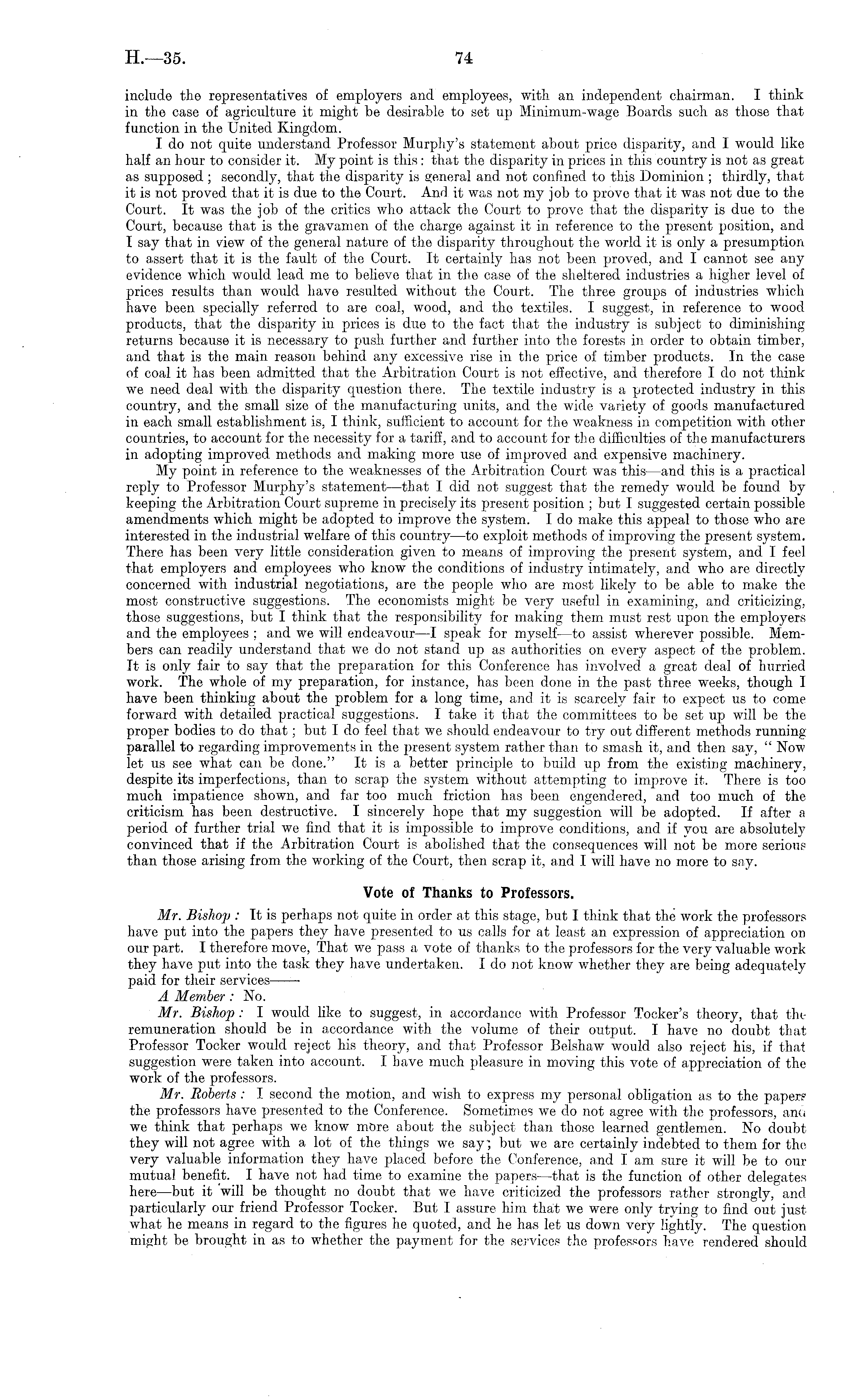 include the representatives of employers and employees, with, an independent chairman. I think in the case of agriculture it might be desirable to set up Minimum-wage Boards such as those that function in the United Kingdom. I do not quite understand Professor Murphy's statement about price disparity, and I would like half an hour to consider it. My point is this : that the disparity in prices in this country is not as great as supposed ; secondly, that the disparity is general and not confined to this Dominion ; thirdly, that it is not proved that it is due to the Court. And it was not my job to prove that it was not due to the Court. It was the job of the critics who attack the Court to prove that the disparity is due to the Court, because that is the gravamen of the charge against it in reference to the present position, and I say that in view of the general nature of the disparity throughout the world it is only a presumption to assert that it is the fault of the Court. It certainly has not been proved, and I cannot see any evidence which would lead me to believe that in the case of the sheltered industries a higher level of prices results than would have resulted without the Court. The three groups of industries which have been specially referred to are coal, wood, and the textiles. I suggest, in reference to wood products, that the disparity in prices is due to the fact that the industry is subject to diminishing returns because it is necessary to push further and further into the forests in order to obtain timber, and that is the main reason behind any excessive rise in the price of timber products. In the case of coal it has been admitted that the Arbitration Court is not effective, and therefore I do not think we need deal with the disparity question there. The textile industry is a protected industry in this country, and the small size of the manufacturing units, and the wide variety of goods manufactured in each small establishment is, I think, sufficient to account for the weakness in competition with other countries, to account for the necessity for a tariff, and to account for the difficulties of the manufacturers in adopting improved methods and making more use of improved and expensive machinery. My point in reference to the weaknesses of the Arbitration Court was this—and this is a practical reply to Professor Murphy's statement —that I did not suggest that the remedy would be found by keeping the Arbitration Court supreme in precisely its present position ; but I suggested certain possible amendments which might be adopted to improve the system. Ido make this appeal to those who are interested in the industrial welfare of this country —to exploit methods of improving the present system. There has been very little consideration given to means of improving the present system, and I feel that employers and employees who know the conditions of industry intimately, and who are directly concerned with industrial negotiations, are the people who are most likely to be able to make the most constructive suggestions. The economists might be very useful in examining, and criticizing, those suggestions, but I think that the responsibility for making them must rest upon the employers and the employees ; and we will endeavour —I speak for myself—to assist wherever possible. Members can readily understand that we do not stand up as authorities on every aspect of the problem. It is only fair to say that the preparation for this Conference has involved a great deal of hurried work. The whole of my preparation, for instance, has been done in the past three weeks, though I have been thinking about the problem for a long time, and it is scarcely fair to expect us to come forward with detailed practical suggestions. I take it that the committees to be set up will be the proper bodies to do that; but Ido feel that we should endeavour to try out different methods running parallel to regarding improvements in the present system rather than to smash it, and then say, " Now let us see what can be done." It is a better principle to build up from the existing machinery, despite its imperfections, than to scrap the system without attempting to improve it. There is too much impatience shown, and far too much friction has been engendered, and too much of the criticism has been destructive. I sincerely hope that my suggestion will be adopted. If after a period of further trial we find that it is impossible to improve conditions, and if you are absolutely convinced that if the Arbitration Court is abolished that the consequences will not be more serious than those arising from the working of the Court, then scrap it, and I will have no more to say. Vote of Thanks to Professors. Mr. Bishop: It is perhaps not quite in order at this stage, but I think that the work the professors have put into the papers they have presented to us calls for at least an expression of appreciation on our part. I therefore move, That we pass a vote of thanks to the professors for the very valuable work they have put into the task they have undertaken. Ido not know whether they are being adequately paid for their services—— A Member : No. Mr. Bishop : I would like to suggest, in accordance with Professor Tocker's theory, that the remuneration should be in accordance with the volume of their output. I have no doubt that Professor Tocker would reject his theory, and that Professor Belshaw would also reject his, if that suggestion were taken into account. I have much pleasure in moving this vote of appreciation of the work of the professors. Mr. Roberts : I second the motion, and wish to express my personal obligation as to the paper? the professors have presented to the Conference. Sometimes we do not agree with the professors, anu we think that perhaps we know rnbre about the subject than those learned gentlemen. No doubt they will not agree with a lot of the things we say- but we are certainly indebted to them fo