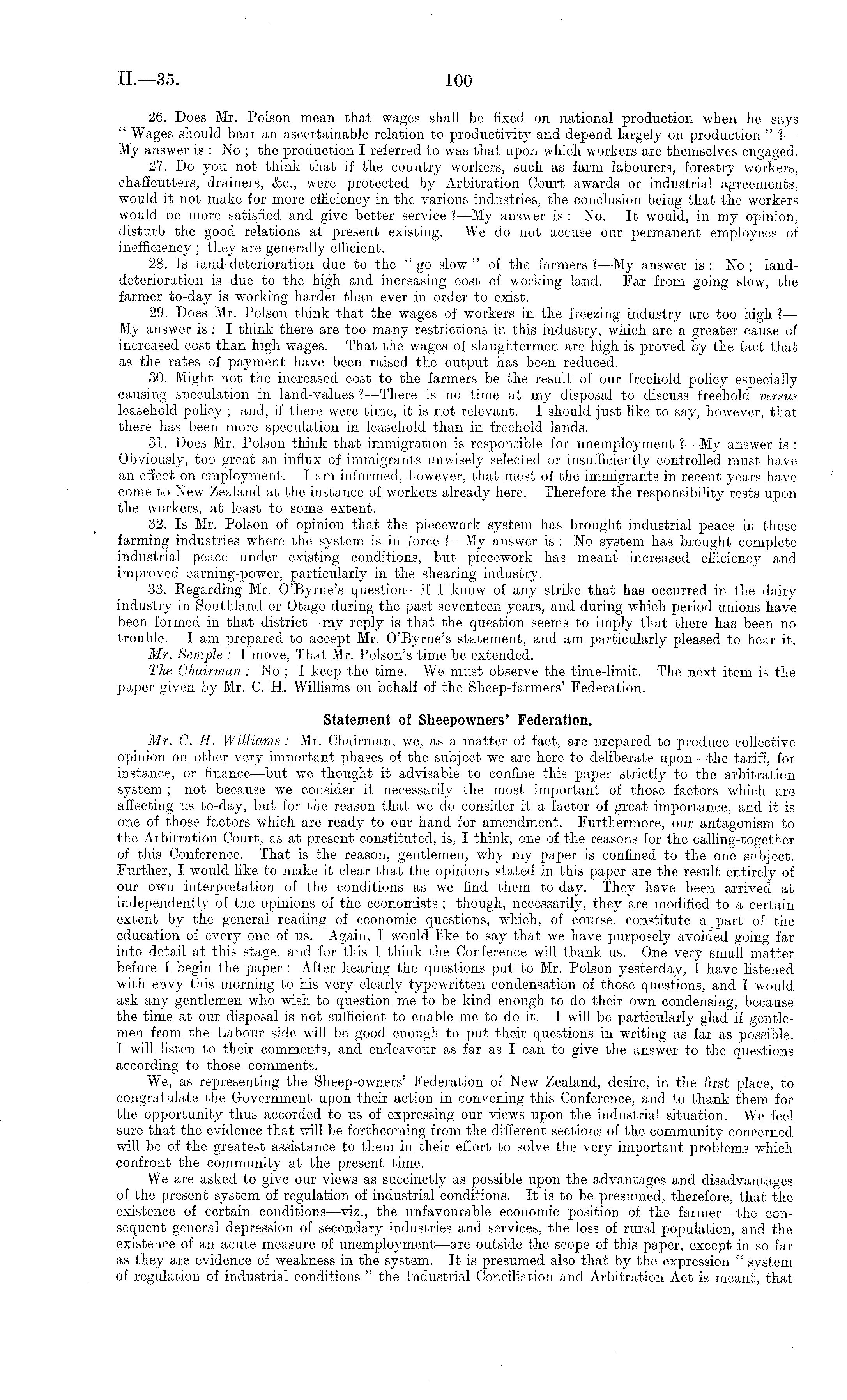 26. Does Mr. Poison mean that wages stall be fixed on national production when he says " Wages should bear an ascertainable relation to productivity and depend largely on production " ?— My answer is : No ; the production I referred to was that upon which workers are themselves engaged. 27. Do you not think that if the country workers, such as farm labourers, forestry workers, chaffcutters, drainers, &c., were protected by Arbitration Court awards or industrial agreements, would it not make for more efficiency in the various industries, the conclusion being that the workers would be more satisfied and give better service ?—My answer is : No. It would, in my opinion, disturb the good relations at present existing. We do not accuse our permanent employees of inefficiency ; they are generally efficient. 28. Is land-deterioration due to the "go slow " of the farmers ?—My answer is : No ; landdeterioration is due to the high and increasing cost of working land. Far from going slow, the farmer to-day is working harder than ever in order to exist. 29. Does Mr. Poison think that the wages of workers in the freezing industry are too high ? — My answer is : I think there are too many restrictions in this industry, which are a greater cause of increased cost than high wages. That the wages of slaughtermen are high is proved by the fact that as the rates of payment have been raised the output has been reduced. 30. Might not the increased cost.to the farmers be the result of our freehold policy especially causing speculation in land-values ?—There is no time at my disposal to discuss freehold versus leasehold policy ; and, if there were time, it is not relevant. I should just like to say, however, that there has been more speculation in leasehold than in freehold lands. 31. Does Mr. Poison think that immigration is responsible for unemployment ? —My answer is : Obviously, too great an influx of immigrants unwisely selected or insufficiently controlled must have an effect on employment. lam informed, however, that most of the immigrants in recent years have come to New Zealand at the instance of workers already here. Therefore the responsibility rests upon the workers, at least to some extent. 32. Is Mr. Poison of opinion that the piecework system has brought industrial peace in those farming industries where the system is in force ? —My answer is : No system has brought complete industrial peace under existing conditions, but piecework has meant increased efficiency and improved earning-power, particularly in the shearing industry. 33. Regarding Mr. o'Byrne's question—if I know of any strike that has occurred in the dairy industry in Southland or Otago during the past seventeen years, and during which period unions have been formed in that district—my reply is that the question seems to imply that there has been no trouble. lam prepared to accept Mr. O'Byrne's statement, and am particularly pleased to hear it. Mr. Semple : I move, That Mr. Poison's time be extended. The Chairman : No ; I keep the time. We must observe the time-limit. The next item is the paper given by Mr. C. H. Williams on behalf of the Sheep-farmers' Federation. Statement of Sheepowners' Federation. Mr. 0. H. Williams : Mr. Chairman, we, as a matter of fact, are prepared to produce collective opinion on other very important phases of the subject we are here to deliberate upon—the tariff, for instance, or finance—but we thought it advisable to confine this paper strictly to the arbitration system ; not because we consider it necessarily the most important of those factors which are affecting us to-day, but for the reason that we do consider it a factor of great importance, and it is one of those factors which are ready to our hand for amendment. Furthermore, our antagonism to the Arbitration Court, as at present constituted, is, I think, one of the reasons for the calling-together of this Conference. That is the reason, gentlemen, why my paper is confined to the one subject. Further, I would like to make it clear that the opinions stated in this paper are the result entirely of our own interpretation of the conditions as we find them to-day. They have been arrived at independently of the opinions of the economists ; though, necessarily, they are modified to a certain extent by the general reading of economic questions, which, of course, constitute a _ part of the education of every one of us. Again, I would like to say that we have purposely avoided going far into detail at this stage, and for this I think the Conference will thank us. One very small matter before I begin the paper : After hearing the questions put to Mr. Poison yesterday, I have listened with envy this morning to his very clearly typewritten condensation of those questions, and I would ask any gentlemen who wish to question me to be kind enough to do their own condensing, because the time at our disposal is not sufficient to enable me to do it. I will be particularly glad if gentlemen from the Labour side will be good enough to put their questions in writing as far as possible. I will listen to their comments, and endeavour as far as I can to give the answer to the questions according to those comments. We, as representing the Sheep-owners' Federation of New Zealand, desire, in the first place, to congratulate the Government upon their action in convening this Conference, and to thank them, for the opportunity thus accorded to us of expressing our views upon the industrial situation. We feel sure that the evidence that will be forthcoming from the different sections of the community concerned will be of the greatest assistance to them in their effort to solve the very important problems which confront the community at the present time. We are asked to give our views as succinctly as possible upon the advantages and disadvantages of the present system of regulation of industrial conditions. It is to be presumed, therefore, that the existence of