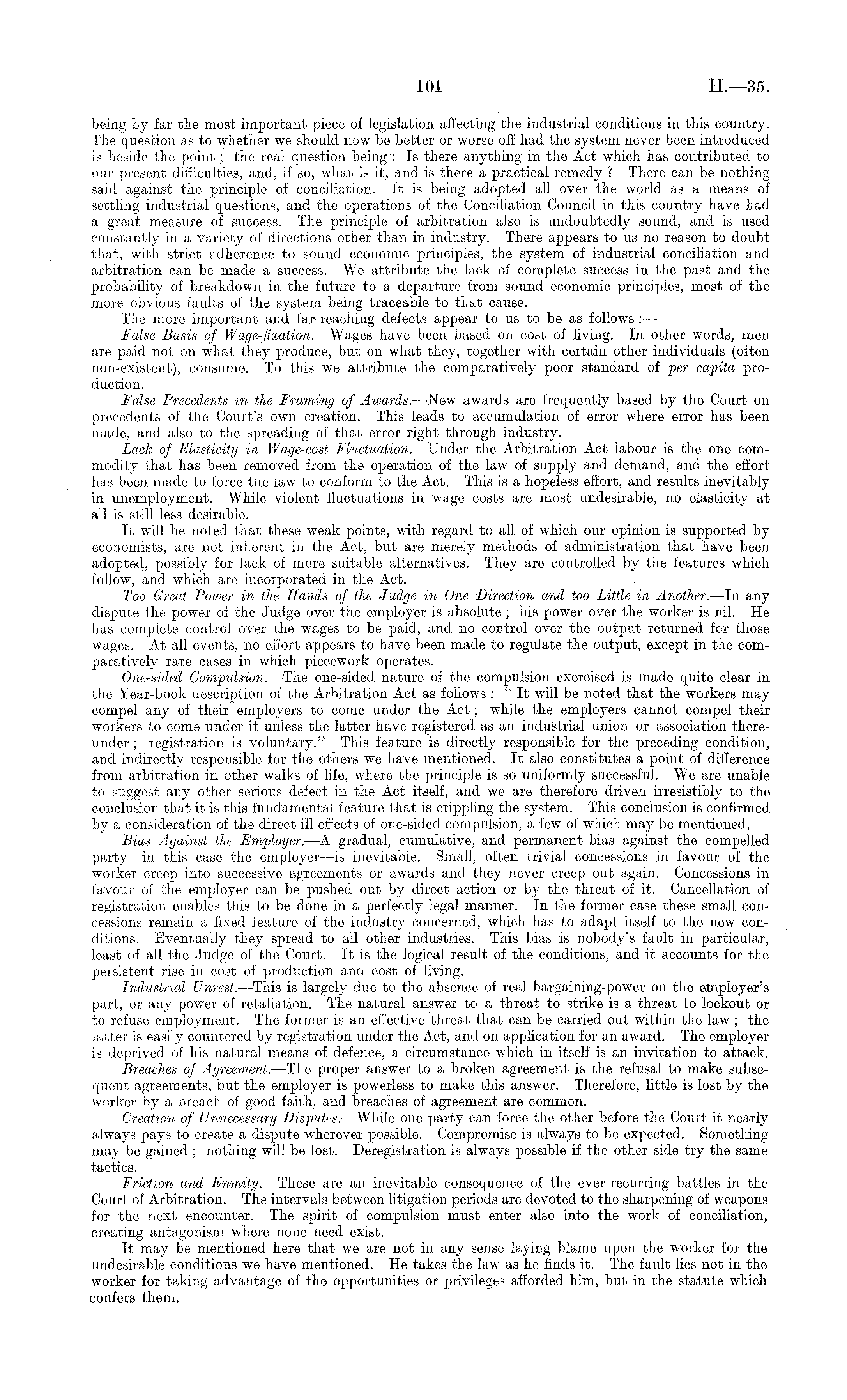 being by far tie most important piece of legislation affecting the industrial conditions in this country. The question as to whether we should now be better or worse off had the system never been introduced is beside the point; the real question being : Is there anything in the Act which has contributed to our present difficulties, and, if so, what is it, and is there a practical remedy ? There can be nothing said against the principle of conciliation. It is being adopted all over the world as a means of settling industrial questions, and the operations of the Conciliation Council in this country have had a great measure of success. The principle of arbitration also is undoubtedly sound, and is used constantly in a variety of directions other than in industry. There appears to us no reason to doubt that, with strict adherence to sound economic principles, the system of industrial conciliation and arbitration can be made a success. We attribute the lack of complete success in the past and the probability of breakdown in the future to a departure from sound economic principles, most of the more obvious faults of the system being traceable to that cause. The more important and far-reaching defects appear to us to be as follows : — False Basis of Wage-fixation. —Wages have been based on cost of living. In other words, men are paid not on what they produce, but on what they, together with certain other individuals (often non-existent), consume. To this we attribute the comparatively poor standard of per capita production. False Precedents in the Framing of Awards. —New awards are frequently based by the Court 011 precedents of the Court's own creation. This leads to accumulation of error where error has been made, and also to the spreading of that error right through industry. Lack of Elasticity in Wage-cost Fluctuation. —Under the Arbitration Act labour is the one commodity that has been removed from the operation of the law of supply and demand, and the effort has been made to force the law to conform to the Act. This is a hopeless effort, and results inevitably in unemployment. While violent fluctuations in wage costs are most undesirable, no elasticity at all is still less desirable. It will be noted that these weak points, with regard to all of which our opinion is supported by economists, are not inherent in the Act, but are merely methods of administration that have been adopted, possibly for lack of more suitable alternatives. They are controlled by the features which follow, and which are incorporated in the Act. Too Great Power in the Hands of the Judge in One Direction and too Little in Another. —In any dispute the power of the Judge over the employer is absolute ; his power over the worker is nil. He has complete control over the wages to be paid, and no control over the output returned for those wages. At all events, no effort appears to have been made to regulate the output, except in the comparatively rare cases in which piecework operates. One-sided Compulsion. —The one-sided nature of the compulsion exercised is made quite clear in the Year-book description of the Arbitration Act as follows : "It will be noted that the workers may compel any of their employers to come under the Act; while the employers cannot compel their workers to come under it unless the latter have registered as an industrial union or association thereunder ; registration is voluntary." This feature is directly responsible for the preceding condition, and indirectly responsible for the others we have mentioned. It also constitutes a point of difference from arbitration in other walks of life, where, the principle is so uniformly successful. We are unable to suggest any other serious defect in the Act itself, and we are therefore driven irresistibly to the conclusion that it is this fundamental feature that is crippling the system. This conclusion is confirmed by a consideration of the direct ill effects of one-sided compulsion, a few of which may be mentioned. Bias Against the Employer. —A gradual, cumulative, and permanent bias against the compelled party —in this case the employer —is inevitable. Small, often trivial concessions in favour of the worker creep into successive agreements or awards and they never creep out again. Concessions in favour of the employer can be pushed out by direct action or by the threat of it. Cancellation of registration enables this to be done in a perfectly legal manner. In the former case these small concessions remain a fixed feature of the industry concerned, which has to adapt itself to the new conditions. Eventually they spread to all other industries. This bias is nobody's fault in particular, least of all the Judge of the Court. It is the logical result of the conditions, and it accounts for the persistent rise in cost of production and cost of living. Industrial Unrest. —This is largely due to the absence of real bargaining-power on the employer's part, or any power of retaliation. The natural answer to a threat to strike is a threat to lockout or to refuse employment. The former is an effective threat that can be carried out within the law ; the latter is easily countered by registration under the Act, and on application for an award. The employer is deprived of his natural means of defence, a circumstance which in itself is an invitation to attack. Breaches of Agreement.—The proper answer to a broken agreement is the refusal to make subsequent agreements, but the employer is powerless to make this answer. Therefore, little is lost by the worker by a breach of good faith, and breaches of agreement are common. Creation of Unnecessary Disputes. —While one party can force the other before the Court it nearly always pays to create a dispute wherever possible. Compromise is always to be expected. Something may be gained ; nothing will be lost. Deregistration is always possible if the other side try the same tactics. Friction and Enmity. —These