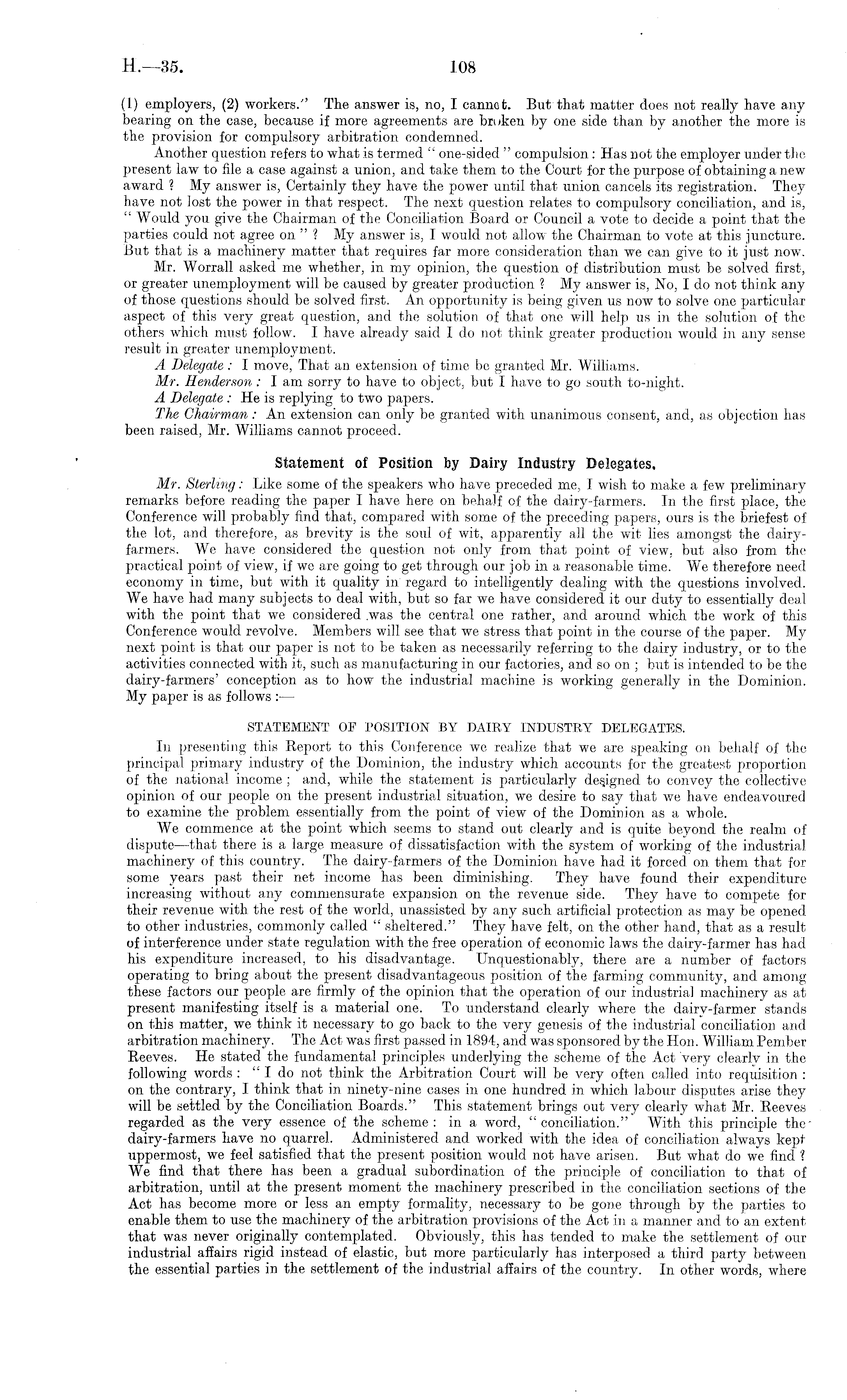 (1) employers, (2) workers/' The answer is, no, I cannot. But that matter does not really have any bearing on the case, because if more agreements are broken by one side than by another the more is the provision for compulsory arbitration condemned. Another question refers to what is termed " one-sided " compulsion : Has not the employer under the present law to file a case against a union, and take them to the Court for the purpose of obtaining a new award ? My answer is, Certainly they have the power until that union cancels its registration. They have not lost the power in that respect. The next question relates to compulsory conciliation, and is, " Would you give the Chairman of the Conciliation Board or Council a vote to decide a point that the parties could not agree on " ? My answer is, I would not allow the Chairman to vote at this juncture. But that is a machinery matter that requires far more consideration than we can give to it just now. Mr. Worrall asked me whether, in my opinion, the question of distribution must be solved first, or greater unemployment will be caused by greater production ? My answer is, No, Ido not think any of those questions should be solved first. An opportunity is being given us now to solve one particular aspect of this very great question, and the solution of that one will help us in the solution of the others which must follow. I have already said Ido not think greater production would in any sense result in greater unemployment. A Delegate : I move, That an extension of time be granted Mr. Williams. Mr. Henderson: lam sorry to have to object, but I have to go south to-night. A Delegate : He is replying to two papers. The Chairman : An extension can only be granted with unanimous consent, and, as objection has been raised, Mr. Williams cannot proceed. Statement of Position by Dairy Industry Delegates, Mr. Sterling: Like some of the speakers who have preceded me, I wish to make a few preliminary remarks before reading the paper I have here on behalf of the dairy-farmers. In the first place, the Conference will probably find that, compared with some of the preceding papers, ours is the briefest of the lot, and therefore, as brevity is the soul of wit, apparently all the wit lies amongst the dairyfarmers. We have considered the question not only from that point of view, but also from the practical point of view, if we are going to get through our job in a reasonable time. We therefore need economy in time, but with it quality in regard to intelligently dealing with the questions involved. We have had many subjects to deal with, but so far we have considered it our duty to essentially deal with the point that we considered was the central one rather, and around which the work of this Conference would revolve. Members will see that we stress that point in the course of the paper. My next point is that our paper is not to be taken as necessarily referring to the dairy industry, or to the activities connected with it, such as manufacturing in our factories, and so on ; but is intended to be the dairy-farmers' conception as to how the industrial machine is working generally in the Dominion. My paper is as follows :— STATEMENT OF POSITION BY DAIRY INDUSTRY DELEGATES. In presenting this Report to this Conference we realize that we are speaking on behalf of the principal primary industry of the Dominion, the industry which accounts for the greatest proportion of the national income ; and, while the statement is particularly designed to convey the collective opinion of our people on the present industrial situation, we desire to say that we have endeavoured to examine the problem essentially from the point of view of the Dominion as a whole. We commence at the point which seems to stand out clearly and is quite beyond the realm of dispute —that there is a large measure of dissatisfaction with the system of working of the industrial machinery of this country. The dairy-farmers of the Dominion have had it forced on them that for some years past their net income has been diminishing. They have found their expenditure increasing without any commensurate expansion on the revenue side. They have to compete for their revenue with the rest of the world, unassisted by any such artificial protection as may be opened to other industries, commonly called " sheltered." They have felt, on the other hand, that as a result of interference under state regulation with the free operation of economic laws the dairy-farmer has had his expenditure increased, to his disadvantage. Unquestionably, there are a number of factors operating to bring about the present disadvantageous position of the farming community, and among these factors our people are firmly of the opinion that the operation of our industrial machinery as at present manifesting itself is a material one. To understand clearly where the dairy-farmer stands on this matter, we think it necessary to go back to the very genesis of the industrial conciliation and arbitration machinery. The Act was first passed in 1894, and was sponsored by the Hon. William Pember Reeves. He stated the fundamental principles underlying the scheme of the Act very clearly in the following words : " I do not think the Arbitration Court will be very often called into requisition : on the contrary, I think that in ninety-nine cases in one hundred in which labour disputes arise they will be settled by the Conciliation Boards." This statement brings out very clearly what Mr. Reeves regarded as the very essence of the scheme : in a word, " conciliation." With this principle the dairy-farmers have no quarrel. Administered and worked with the idea of conciliation always kept uppermost, we feel satisfied that the present position would not have arisen. But what do we find ? We find that there has been a gradual subordination of the principle of conciliation to that of arbitration, until at the present moment the machinery prescribed in the conciliati