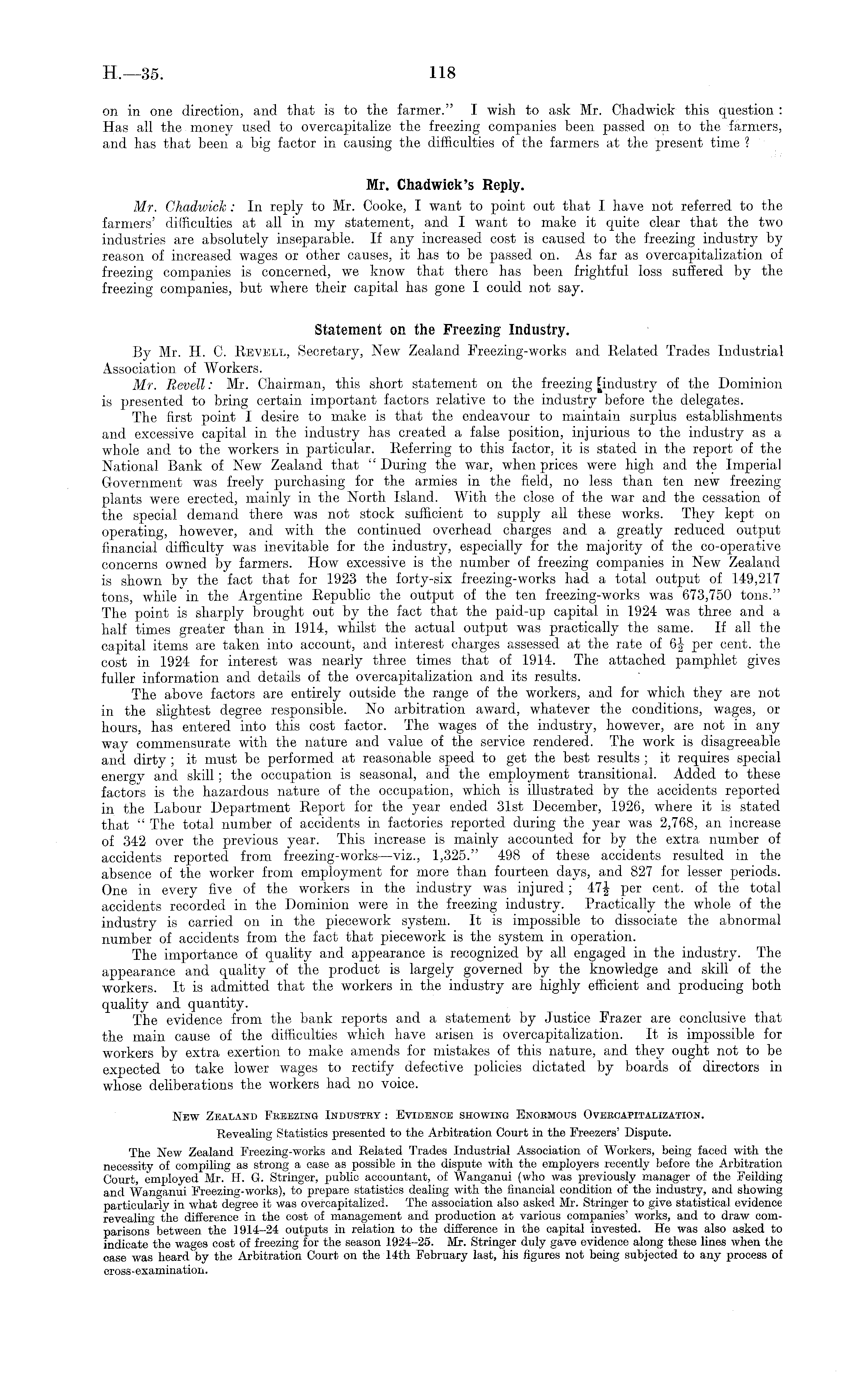 on in one direction, and that is to the farmer." I wish to ask Mr. Chadwick this question : Has all the money used to overcapitalize the freezing companies been passed on to the farmers, and has that been a big factor in causing the difficulties of the farmers at the present time ? Mr. Chadwick's Reply. Mr. Chadwick: In reply to Mr. Cooke, I want to point out that I have not referred to the farmers' difficulties at all in my statement, and I want to make it quite clear that the two industries are absolutely inseparable. If any increased cost is caused to the freezing industry by reason of increased wages or other causes, it has to be passed on. As far as overcapitalization of freezing companies is concerned, we know that there has been frightful loss suffered by the freezing companies, but where their capital has gone I could not say. Statement on the Freezing Industry. By Mr. H. C. Revell, Secretary, New Zealand Freezing-works and Related Trades Industrial Association of Workers. Mr. Revell: Mr. Chairman, this short statement on the freezing [industry of the Dominion is presented to bring certain important factors relative to the industry before the delegates. The first point I desire to make is that the endeavour to maintain surplus establishments and excessive capital in the industry has created a false position, injurious to the industry as a whole and to the workers in particular. Referring to this factor, it is stated in the report of the National Bank of New Zealand that "During the war, when prices were high and the Imperial Government was freely purchasing for the armies in the field, no less than ten new freezing plants were erected, mainly in the North Island. With the close of the war and the cessation of the special demand there was not stock sufficient to supply all these works. They kept on operating, however, and with the continued overhead charges and a greatly reduced output financial difficulty was inevitable for the industry, especially for the majority of the co-operative concerns owned by farmers. How excessive is the number of freezing companies in New Zealand is shown by the fact that for 1923 the forty-six freezing-works had a total output of 149,217 tons, while in the Argentine Republic the output of the ten freezing-works was 673,750 tons." The point is sharply brought out by the fact that the paid-up capital in 1924 was three and a half times greater than in 1914, whilst the actual output was practically the same. If all the capital items are taken into account, and interest charges assessed at the rate of 6J per cent, the cost in 1924 for interest was nearly three times that of 1914. The attached pamphlet gives fuller information and details of the overcapitalization and its results. The above factors are entirely outside the range of the workers, and for which they are not in the slightest degree responsible. No arbitration award, whatever the conditions, wages, or hours, has entered into this cost factor. The wages of the industry, however, are not in any way commensurate with the nature and value of the service rendered. The work is disagreeable and dirty ; it must be performed at reasonable speed to get the best results ; it requires special energy and skill; the occupation is seasonal, and the employment transitional. Added to these factors is the hazardous nature of the occupation, which is illustrated by the accidents reported in the Labour Department Report for the year ended 31st December, 1926, where it is stated that " The total number of accidents in factories reported during the year was 2,768, an increase of 342 over the previous year. This increase is mainly accounted for by the extra number of accidents reported from freezing-works—viz., 1,325." 498 of these accidents resulted in the absence of the worker from employment for more than fourteen days, and 827 for lesser periods. One in every five of the workers in the industry was injured; 47-J per cent, of the total accidents recorded in the Dominion were in the freezing industry. Practically the whole of the industry is carried on in the piecework system. It is impossible to dissociate the abnormal number of accidents from the fact that piecework is the system in operation. The importance of quality and appearance is recognized by all engaged in the industry. The appearance and quality of the product is largely governed by the knowledge and skill of the workers. It is admitted that the workers in the industry are highly efficient and producing both quality and quantity. The evidence from the bank reports and a statement by Justice Frazer are conclusive that the main cause of the difficulties which have arisen is overcapitalization. It is impossible for workers by extra exertion to make amends for mistakes of this nature, and they ought not to be expected to take lower wages to rectify defective policies dictated by boards of directors in whose deliberations the workers had no voice. New Zealand Freezing Industry : Evidence showing Enormous Overcapitalization. Revealing Statistics presented to the Arbitration Court in the Freezers' Dispute. The New Zealand Freezing-works and Related Trades Industrial Association of Workers, being faced with the necessity of compiling as strong a case as possible in the dispute with the employers recently before the Arbitration Court, employed Mr. H. G. Stringer, public accountant, of Wanganui (who was previously manager of the Feilding and Wanganui Freezing-works), to prepare statistics dealing with the financial condition of the industry, and showing particularly in what degree it was overcapitalized. The association also asked Mr. Stringer to give statistical evidence revealino- the difference in the cost of management and production at various companies' works, and to draw comparisons between the 1914-24 outputs in relation to the difference in the capital invested. He was also asked to indicate the wages cost of freezing for the season 1924-25. Mr. String