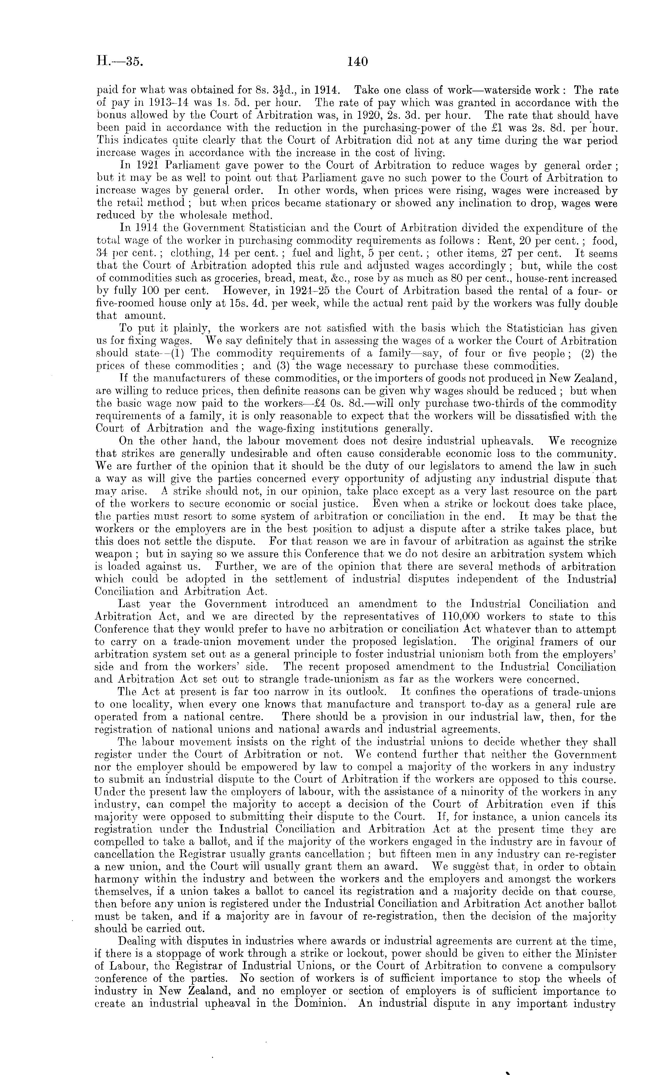 paid for what was obtained for Bs. 3|d., in 1914. Take one class of work—waterside work : The rate of pay in 1913-14 was Is. sd. per hour. The rate of pay which was granted in accordance with the bonus allowed by the Court of Arbitration was, in 1920, 2s. 3d. per hour. The rate that should have been paid in accordance with the reduction in the purchasing-power of the £1 was 2s. Bd. per hour. This indicates quite clearly that the Court of Arbitration did not at any time during the war period increase wages in accordance with the increase in the cost of living-. In 1921 Parliament gave power to the Court of Arbitration to reduce wages by general order ; but it may be as well to point out that Parliament gave no such power to the Court of Arbitration to increase wages by general order. In other words, when prices were rising, wages were increased by the retail method ; but when prices became stationary or showed any inclination to drop, wages were reduced by the wholesale method. In 1914 the Government Statistician and the Court of Arbitration divided the expenditure of the total wage of the worker in purchasing commodity requirements as follows : Rent, 20 per cent. ; food, 34 per cent. ; clothing, 14 per cent. ; fuel and light, 5 per cent. ; other items, 27 per cent. It seems that the Court of Arbitration adopted this rule and adjusted wages accordingly ; but, while the cost of commodities such as groceries, bread, meat, &c., rose by as much as 80 per cent.., house-rent increased by fully 100 per cent. However, in 1924-25 the Court of Arbitration based the rental of a four- or five-roomed house only at 15s. 4d. per week, while the actual rent paid by the workers was fully double that amount. To put it plainly, the workers are not satisfied with the basis which the Statistician has given us for fixing wages. We say definitely that in assessing the wages of a worker the Court of Arbitration should state--(1) The commodity requirements of a family—say, of four or five people; (2) the prices of these commodities ; and (3) the wage necessary to purchase these commodities. If the manufacturers of these commodities, or the importers of goods not produced in New Zealand, are willing to reduce prices, then definite reasons can be given why wages should be reduced ; but when the basic wage now paid to the workers—£4 os. 8d. —will only purchase two-thirds of the commodity requirements of a family, it is only reasonable to expect that the workers will be dissatisfied with the Court of Arbitration and the wage-fixing institutions generally. On the other hand, the labour movement does not desire industrial upheavals. We recognize that strikes are generally undesirable and often cause considerable economic loss to the community. We are further of the opinion that it should be the duty of our legislators to amend the law in such a way as will give the parties concerned ever}'' opportunity of adjusting any industrial dispute that may arise. A strike should not, in our opinion, take place except as a very last resource on the part of the workers to secure economic or social justice. Even when a strike or lockout does take place, the parties must resort to some system of arbitration or conciliation in the end. It may be that the workers or the employers are in the best position to adjust a dispute after a strike takes place, but this does not settle the dispute. For that reason we are in favour of arbitration as against the strike weapon ; but in saying so we assure this Conference that we do not desire an arbitration system which is loaded against us. Further, we are of the opinion that there are several methods of arbitration which could be adopted in the settlement of industrial disputes independent of the Industrial Conciliation and Arbitration Act. Last year the Government introduced an amendment to the Industrial Conciliation and Arbitration Act, and we are directed by the representatives of 110,000 workers to state to this Conference that they would prefer to have no arbitration or conciliation Act whatever than to attempt to carry on a trade-union movement under the proposed legislation. The original framers of our arbitration system set out as a general principle to foster industrial unionism both from the employers' side and from the workers' side. The recent proposed amendment to the Industrial Conciliation and Arbitration Act set out to strangle trade-unionism as far as the workers were concerned. The Act at present is far too narrow in its outlook. It confines the operations of trade-unions to one locality, when every one knows that manufacture and transport to-day as a general rule are operated from a national centre. There should be a provision in our industrial law, then, for the registration of. national unions and national awards and industrial agreements. The labour movement insists on the right of the industrial unions to decide whether they shall register under the Court of Arbitration or not. We contend further that neither the Government nor the employer should be empowered by law to compel a majority of the workers in any industry to submit an industrial dispute to the Court of Arbitration if the workers are opposed to this course. Under the present law the employers of labour, with the assistance of a minority of the workers in any industry, can compel the majority to accept a decision of the Court of Arbitration even if this majority were opposed to submitting their dispute to the Court. If, for instance, a union cancels its registration under the Industrial Conciliation and Arbitration Act at the present time they are compelled to take a ballot, and if the majority of the workers engaged in the industry are in favour of cancellation the Registrar usually grants cancellation ; but fifteen men in any industry can re-register a new union, and the Court will usually grant them an award. We suggest that, in order to obtain harmony within the industry and between the workers an