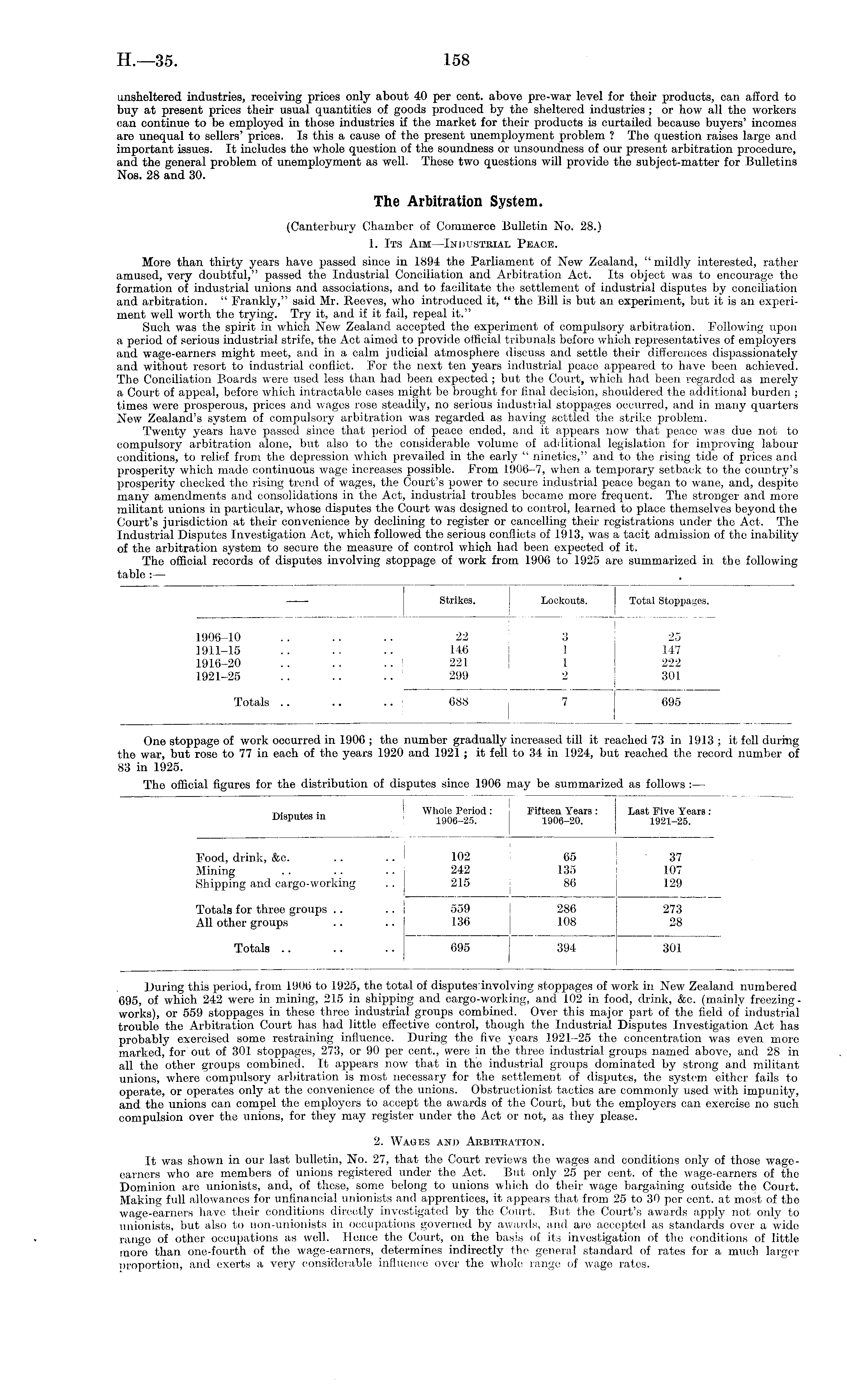 unsheltered industries, receiving prices only about 40 per cent, above pre-war level for their products, can afford to buy at present prices their usual quantities of goods produced by the sheltered industries ; or how all the workers can continue to be employed in those industries if the market for their products is curtailed because buyers' incomes are unequal to sellers' prices. Is this a cause of the present unemployment problem ? The question raises large and important issues. It includes the whole question of the soundness or unsoundness of our present arbitration procedure, and the general problem of unemployment as well. These two questions will provide the subject-matter for Bulletins Nos. 28 and 30. The Arbitration System. (Canterbury Chamber of Commerce Bulletin No. 28.) 1. Its Aim —Industrial Peace. More than thirty years have passed since in 1894 the Parliament of New Zealand, " mildly interested, rather amused, very doubtful," passed the Industrial Conciliation and Arbitration Act. Its object was to encourage the formation of industrial unions and associations, and to facilitate the settlement of industrial disputes by conciliation and arbitration. " Frankly," said Mr. Reeves, who introduced it, " the Bill is but an experiment, but it is an experiment well worth the trying. Try it, and if it fail, repeal it." Such was the spirit in which New Zealand accepted the experiment of compulsory arbitration. Following upon a period of serious industrial strife, the Act aimed to provide official tribunals before which representatives of employers and wage-earners might meet, and in a calm judicial atmosphere discuss and settle their differences dispassionately and without resort to industrial conflict. For the next ten years industrial pcace appeared to have been achieved. The Conciliation Boards were used less than had been expected ; but the Court, which had been regarded as merely a Court of appeal, before which intractable cases might be brought for final decision, shouldered the additional burden ; times were prosperous, prices and wages rose steadily, no serious industrial stoppages occurred, and in many quarters New Zealand's system of compulsory arbitration was regarded as having settled the strike problem. Twenty years have passed since that period of peace ended, and it appears now that peace was due not to compulsory arbitration alone, but also to the considerable volume of additional legislation for improving labour conditions, to relief from the depression which j>revailed in the early " nineties," and to the rising tide of prices and prosperity which made continuous wage increases possible. From 1906-7, when a temporary setback to the country's prosperity checked the rising trend of wages, the Court's power to secure industrial peace began to wane, and, despite many amendments and consolidations in the Act, industrial troubles became more frequent. The stronger and more militant unions in particular, whose disputes the Court was designed to control, learned to place themselves beyond the Court's jurisdiction at their convenience by declining to register or cancelling their registrations under the Act. The Industrial Disputes Investigation Act, which followed the serious conflicts of 1913, was a tacit admission of the inability of the arbitration system to secure the measure of control which had been expected of it. The official records of disputes involving stoppage of work from 1906 to 1925 are summarized in the following table :—