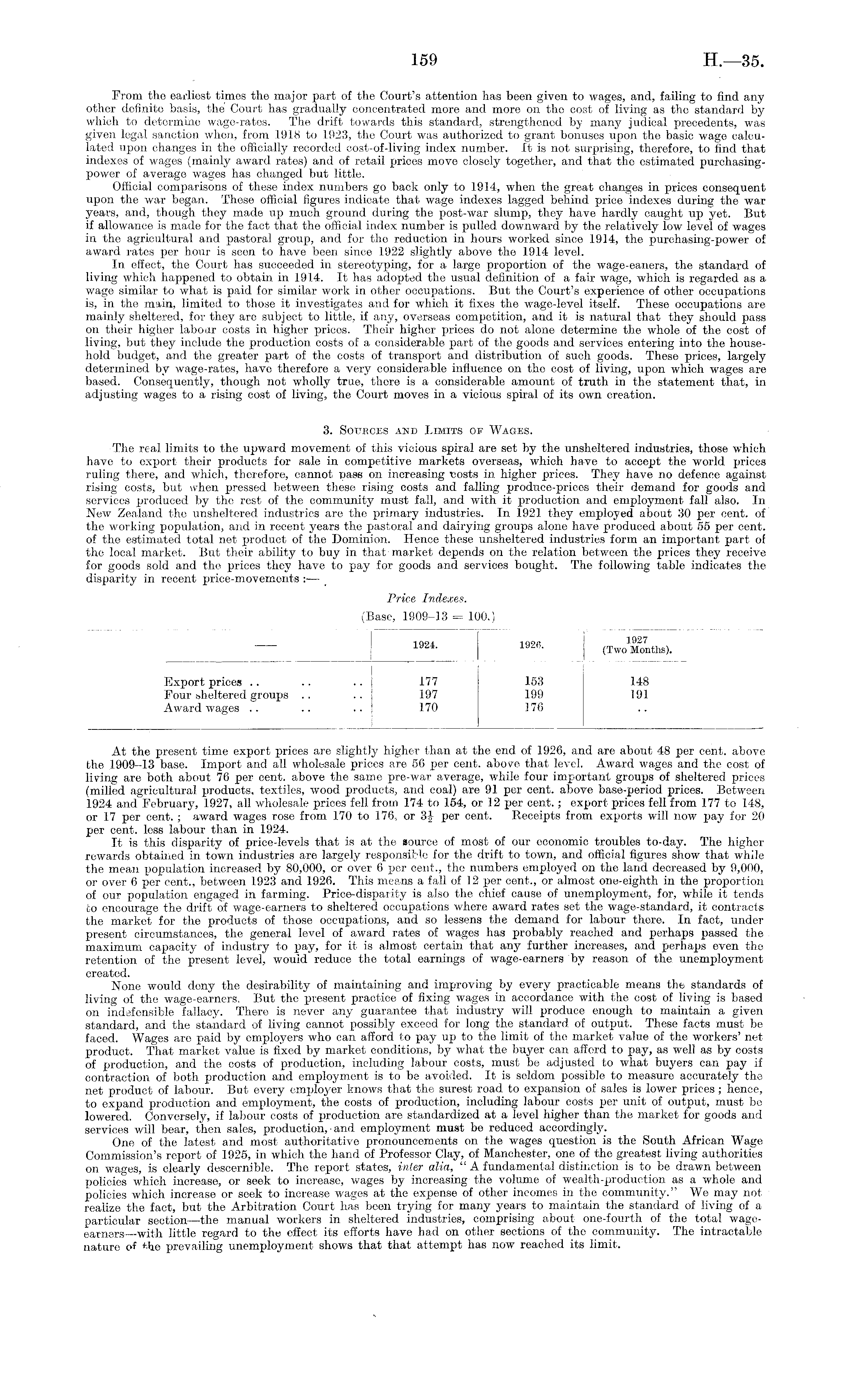 From the earliest times the major part of the Court's attention has been given to wages, and, failing to find any other definite basis, the Court has gradually concentrated more and more on the cost of living as the standard by which.to determine wage-rates. The drift towards this standard, strengthened by many judical precedents, was given legal sanction when, from 1918 to 1923, the Court was authorized to grant bonuses upon the basic wage calculated upon changes in the officially recorded cost-of-living index number. It is not surprising, therefore, to find that indexes of wages (mainly award rates) and of retail prices move closely together, and that the estimated purchasingpower of average wages has changed but little. Official comparisons of these index numbers go back only to 1914, when the great changes in prices consequent upon the war began. These official figures indicate that wage indexes lagged behind price indexes during the war years, and, though they made up much ground during the post-war slump, they have hardly caught up yet. But if allowance is made for the fact that the official index number is pulled downward by the relatively low level of wages in the agricultural and pastoral group, and for the reduction in hours worked since 1914, the purchasing-power of award rates per hour is seen to have been since 1922 slightly above the 1914 level. In effect, the Court has succeeded in stereotyping, for a large proportion of the wage-eaners, the standard of living which happened to obtain in 1914. It has adopted the usual definition of a fair wage, which is regarded as a wage similar to what is paid for similar work in other occupations. But the Court's experience of other occupations is, in the main, limited to those it investigates and for which it fixes the wage-level itself. These occupations are mainly sheltered, for they are subject to little, if any, overseas competition, and it is natural that they should pass on their higher labour costs in higher prices. Their higher prices do not alone determine the whole of the cost of living, but they include the production costs of a considerable part of the goods and services entering into the household budget, and the greater part of the costs of transport and distribution of such goods. These prices, largely determined by wage-rates, have therefore a very considerable influence on the cost of living, upon which wages are based. Consequently, though not wholly true, there is a considerable amount of truth in the statement that, in adjusting wages to a rising cost of living, the Court moves in a vicious spiral of its own creation. 3. SotTKCES AKD LIMITS OF WAGES. The real limits to the upward movement of this vicious spiral are set by the unsheltered industries, those which have to export their products for sale in competitive markets overseas, which have to accept the world prices ruling there, and which, therefore, cannot pass on increasing T.'osts in higher prices. They have no defence against rising costs, but when pressed between these rising costs and falling produce-prices their demand for goods and services produced by the rest of the community must fall, and with it production and employment, fall also. In New Zealand the unsheltered industries are the primary industries. In 1921 they employed about 30 per cent, of the working population, arid in recent years the pastoral and dairying groups alone have produced about 55 per cent, of the estimated total net product of the Dominion. Hence these unsheltered industries form an important part of the local market. But their ability to buy in that market depends on the relation between the prices they receive for goods sold and the prices they have to pay for goods and services bought. The following table indicates the disparity in recent price-movements : —