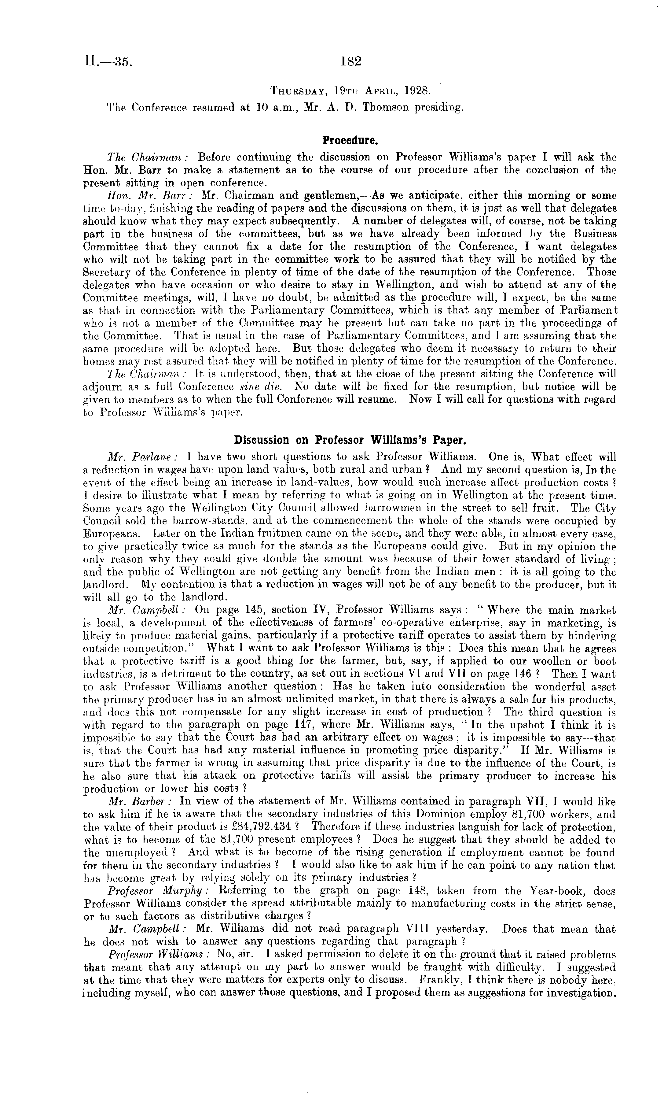 Thursday, 19th April, 1928. The Conference resumed at 10 a.m., Mr. A. D. Thomson presiding. Procedure. The Chairman : Before continuing the discussion on Professor Williams's paper I will ask the Hon. Mr. Barr to make a statement as to the course of our procedure after the conclusion of the present sitting in open conference. Hon. Mr. Barr : Mr. Chairman and gentlemen,—As we anticipate, either this morning or some time to-day, finishing the reading of papers and the discussions on them., it is just as well that delegates should know what they may expect subsequently. A number of delegates will, of course, not be taking part in the business of the committees, but as we have already been informed by the Business Committee that they cannot fix a date for the resumption of the Conference, I want delegates who will not be taking part in the committee work to be assured that they will be notified by the Secretary of the Conference in plenty of time of the date of the resumption of the Conference. Those delegates who have occasion or who desire to stay in Wellington, and wish to attend at any of the Committee meetings, will, I have no doubt, be admitted as the procedure will, I expect, be the same as that in connection with the Parliamentary Committees, which is that any member of Parliament who is not a member of the Committee may be present but can take no part in the proceedings of the Committee. That is usual in the case of Parliamentary Committees, and lam assuming that the same procedure will be adopted here. But those delegates who deem it necessary to return to their homes may rest assured that they will be notified in plenty of time for the resumption of the Conference. The Chairman : It is understood, then, that at the close of the present sitting the Conference will adjourn as a full Conference sine die. No date will be fixed for the resumption, but notice will be given to members as to when the full Conference will resume. Now I will call for questions with regard to Professor Williams's paper. Discussion on Professor Williams's Paper. Mr. Parlane: I have two short questions to ask Professor Williams. One is, What effect will a reduction in wages have upon land-values, both rural and urban ? And my second question is, In the event of the effect being an increase in land-values, how would such increase affect production costs ? I desire to illustrate what I mean by referring to what is going on in Wellington at the present time. Some years ago the Wellington City Council allowed barrowmen in the street to sell fruit. The City Council sold the barrow-stands, and at the commencement the whole of the stands were occupied by Europeans. Later on the Indian fruitmen came on the scene, and they were able, in almost every case, to give practically twice as much for the stands as the Europeans could give. But in my opinion the only reason why they could give double the amount was because of their lower standard of living ; and the public of Wellington are not getting any benefit from the Indian men : it is all going to the landlord. My contention is that a reduction in wages will not be of any benefit to the producer, but it will all go to the landlord. Mr. Campbell: On page 145, section IV, Professor Williams says: "Where the main market is local, a development of the effectiveness of farmers' co-operative enterprise, say in marketing, is likely to produce material gains, particularly if a protective tariff operates to assist them by hindering outside competition." What I want to ask Professor Williams is this : Does this mean that he agrees that a protective tariff is a good thing for the farmer, but, say, if applied to our woollen or boot industries, is a detriment to the country, as set out in sections VI and VII on page 146 ? Then I want to ask Professor Williams another question : Has he taken into consideration the wonderful asset the primary producer has in an almost unlimited market, in that there is always a sale for his products, and does this not compensate for any slight increase in cost of production ? The third question is with regard to the paragraph on page 147, where Mr. Williams says, " In the upshot I think it is impossible to say that the Court has had an arbitrary effect on wages; it is impossible to say —that is, that the Court has had any material influence in promoting price disparity." If Mr. Williams is sure that the farmer is wrong in assuming that price disparity is due to the influence of the Court, is he also sure that his attack on protective tariffs will assist the primary producer to increase his production or lower his costs ? Mr. Barber : In view of the statement of Mr. Williams contained in paragraph VII, I would like to ask him if he is aware that the secondary industries of this Dominion employ 81,700 workers, and the value of their product is £84,792,434 ? Therefore if these industries languish for lack of protection, what is to become of the 81,700 present employees ? Does he suggest that they should be added to the unemployed ? And what is to become of the rising generation if employment cannot be found for them in the secondary industries ? I would also like to ask him if he can point to any nation that has become great by relying solely on its primary industries ? Professor Murphy: Referring to the graph on page 148, taken from the Year-book, does Professor Williams consider the spread attributable mainly to manufacturing costs in the strict sense, or to such factors as distributive charges ? Mr. Campbell: Mr. Williams did not read paragraph VIII yesterday. Does that mean that he does not wish to answer any questions regarding that paragraph ? Professor Williams : No, sir. I asked permission to delete it on the ground that it raised problems that meant that any attempt on my part to answer would be fraught with difficulty. I suggested at the time that they were matters for experts only to discuss. Frankly, I think there is nobody here, includin