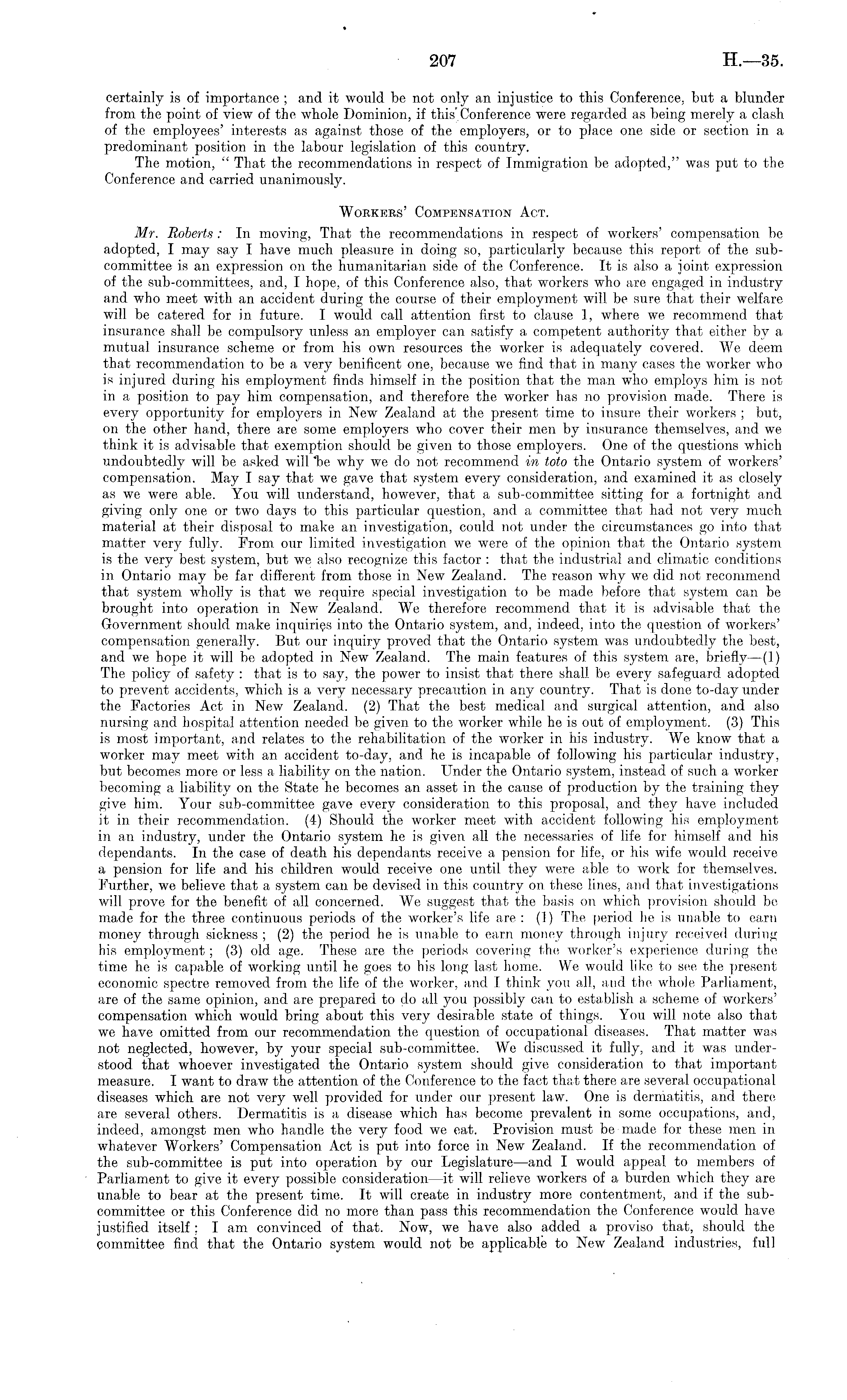certainly is of importance ; and it would be not only an injustice to this Conference, but a blunder from the point of view of the whole Dominion, if this" Conference were regarded as being merely a clash of the employees' interests as against those of the employers, or to place one side or section in a predominant position in the labour legislation of this country. The motion, " That the recommendations in respect of Immigration be adopted," was put to the Conference and carried unanimously. Workers' Compensation Act. Mr. Roberts : In moving, That the recommendations in respect of workers' compensation be adopted, I may say I have much pleasure in doing so, particularly because this report of the subcommittee is an expression 011 the humanitarian side of the Conference. It is also a joint expression of the sub-committees, and, I hope, of this Conference also, that workers who are engaged in industry and who meet with an accident during the course of their employment will be sure that their welfare will be catered for in future. I would call attention first to clause 1, where we recommend that insurance shall be compulsory unless an employer can satisfy a competent authority that either by a mutual insurance scheme or from his own resources the worker is adequately covered. We deem that recommendation to be a very benificent one, because we find that in many cases the worker who is injured during his employment finds himself in the position that the man who employs him is not in a position to pay him compensation, and therefore the worker has no provision made. There is every opportunity for employers in New Zealand at the present time to insure their workers ; but, on the other hand, there are some employers who cover their men by insurance themselves, and we think it is advisable that exemption should be given to those employers. One of the questions which undoubtedly will be asked will "be why we do not recommend in toto the Ontario system of workers' compensation. May I say that we gave that system every consideration, and examined it as closely as we were able. You will understand, however, that a sub-committee sitting for a fortnight and giving only one or two days to this particular question, and a committee that had not very much material at their disposal to make an investigation, could not under the circumstances go into that matter very fully. From our limited investigation we were of the opinion that the Ontario system is the very best system, but we also recognize this factor : that the industrial and climatic conditions in Ontario may be far different from those in New Zealand. The reason why we did not recommend that system wholly is that we require special investigation to be made before that system can be brought into operation in New Zealand. We therefore recommend that it is advisable that the Government should make inquiries into the Ontario system, and, indeed, into the question of workers' compensation generally. But our inquiry proved that the Ontario system was undoubtedly the best, and we hope it will be adopted in New Zealand. The main features of this system are, briefly —(1) The policy of safety : that is to say, the power to insist that there shall be every safeguard adopted to prevent accidents, which is a very necessary precaution in any country. That is done to-day under the Factories Act in New Zealand. (2) That the best medical and surgical attention, and also nursing and hospital attention needed be given to the worker while he is out of employment. (3) This is most important, and relates to the rehabilitation of the worker in his industry. We know that a worker may meet with an accident to-day, and he is incapable of following his particular industry, but becomes more or less a liability on the nation. Under the Ontario system, instead of such a worker becoming a liability on the State he becomes an asset in the cause of production by the training they give him. Your sub-committee gave every consideration to this proposal, and they have included it in their recommendation. (4) Should the worker meet with accident following his employment in an industry, under the Ontario system he is given all the necessaries of life for himself and his dependants. In the case of death his dependants receive a pension for life, or his wife would receive a pension for life and his children would receive one until they were able to work for themselves. Further, we believe that a system can be devised in this country on these lines, and that investigations will prove for the benefit of all concerned. We suggest that the basis on which provision should be made for the three continuous periods of the worker's life are : (1) The period he is unable to earn money through sickness ; (2) the period he is unable to earn money through injury received during his employment; (3) old age. These are the periods covering the worker's experience during the time he is capable of working until he goes to his long last home. We would like to see the present economic spectre removed from the life of the worker, and I think you all, and the whole Parliament, are of the same opinion, and are prepared to do all you possibly can to establish a scheme of workers' compensation which would bring about this very desirable state of things. You will note also that we have omitted from our recommendation the question of occupational diseases. That matter was not neglected, however, by your special sub-committee. We discussed it fully, and it was understood that whoever investigated the Ontario system should give consideration to that important measure. I want to draw the attention of the Conference to the fact that there are several occupational diseases which are not very well provided for under our present law. One is dermatitis, and there are several others. Dermatitis is a disease which has become prevalent in some occupations, and, indeed, amongst men who handle the very food we eat. Provision