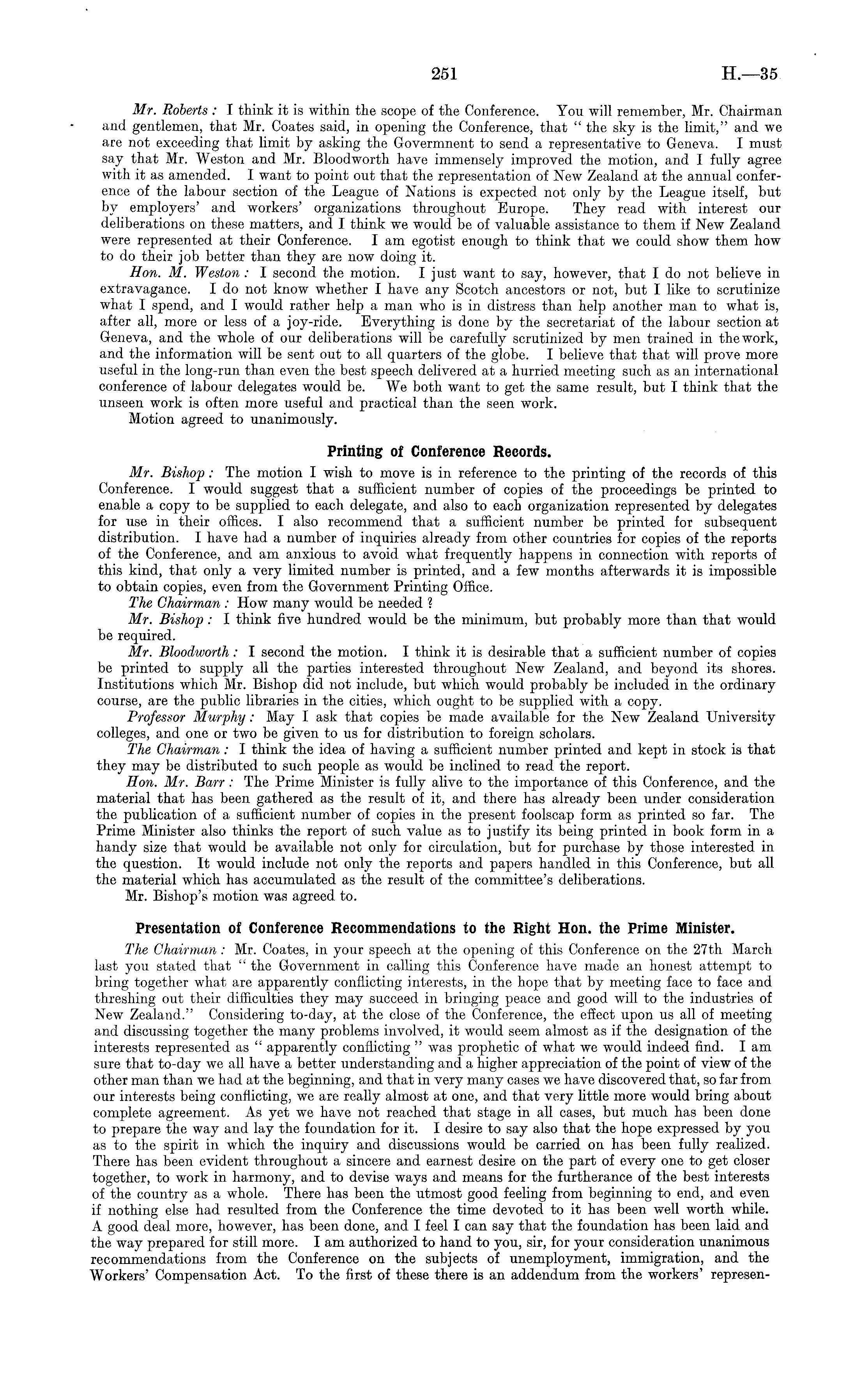 Mr. Roberts : I think it is within the scope of the Conference. You will remember, Mr. Chairman and gentlemen, that Mr. Coates said, in opening the Conference, that " the sky is the limit," and we are not exceeding that limit by asking the Government to send a representative to Geneva. I must say that Mr. Weston and Mr. Bloodworth have immensely improved the motion, and I fully agree with it as amended. I want to point out that the representation of New Zealand at the annual conference of the labour section of the League of Nations is expected not only by the League itself, but by employers' and workers' organizations throughout Europe. They read with interest our deliberations on these matters, and I think we would be of valuable assistance to them if New Zealand were represented at their Conference. lam egotist enough to think that we could show them how to do their job better than they are now doing it. Hon. M. Weston : I second the motion. I just want to say, however, that Ido not believe in extravagance. Ido not know whether I have any Scotch ancestors or not, but I like to scrutinize what I spend, and I would rather help a man who is in distress than help another man to what is, after all, more or less of a joy-ride. Everything is done by the secretariat of the labour section at Geneva, and the whole of our deliberations will be carefully scrutinized by men trained in the work, and the information will be sent out to all quarters of the globe. I believe that that will prove more useful in the long-run than even the best speech delivered at a hurried meeting such as an international conference of labour delegates would be. We both want to get the same result, but I think that the unseen work is often more useful and practical than the seen work. Motion agreed to unanimously. Printing of Conference Records. Mr. Bishop : The motion I wish to move is in reference to the printing of the records of this Conference. I would suggest that a sufficient number of copies of the proceedings be printed to enable a copy to be supplied to each delegate, and also to each organization represented by delegates for use in their offices. I also recommend that a sufficient number be printed for subsequent distribution. I have had a number of inquiries already from other countries for copies of the reports of the Conference, and am anxious to avoid what frequently happens in connection with reports of this kind, that only a very limited number is printed, and a few months afterwards it is impossible to obtain copies, even from the Government Printing Office. The Chairman : How many would be needed ? Mr. Bishop : I think five hundred would be the minimum, but probably more than that would be required. Mr. Bloodworth: I second the motion. I think it is desirable that a sufficient number of copies be printed to supply all the parties interested throughout New Zealand, and beyond its shores. Institutions which Mr. Bishop did not include, but which would probably be included in the ordinary course, are the public libraries in the cities, which ought to be supplied with a copy. Professor Murphy : May I ask that copies be made available for the New Zealand University colleges, and one or two be given to us for distribution to foreign scholars. The Chairman : I think the idea of having a sufficient number printed and kept in stock is that they may be distributed to such people as would be inclined to read the report. Hon. Mr. Barr : The Prime Minister is fully alive to the importance of this Conference, and the material that has been gathered as the result of it, and there has already been under consideration the publication of a sufficient number of copies in the present foolscap form as printed so far. The Prime Minister also thinks the report of such value as to justify its being printed in book form in a handy size that would be available not only for circulation, but for purchase by those interested in the question. It would include not only the reports and papers handled in this Conference, but all the material which has accumulated as the result of the committee's deliberations. Mr. Bishop's motion was agreed to. Presentation of Conference Recommendations to the Right Hon. the Prime Minister. The Chairman : Mr. Coates, in your speech at the opening of this Conference on the 27th March last you stated that " the Government in calling this Conference have made an honest attempt to bring together what are apparently conflicting interests, in the hope that by meeting face to face and threshing out their difficulties they may succeed in bringing peace and good will to the industries of New Zealand." Considering to-day, at the close of the Conference, the effect upon us all of meeting and discussing together the many problems involved, it would seem almost as if the designation of the interests represented as " apparently conflicting " was prophetic of what we would indeed find. lam sure that to-day we all have a better understanding and a higher appreciation of the point of view of the other man than we had at the beginning, and that in very many cases we have discovered that, so far from our interests being conflicting, we are really almost at one, and that very little more would bring about complete agreement. As yet we have not reached that stage in all cases, but much has been done to prepare the way and lay the foundation for it. I desire to say also that the hope expressed by you as to the spirit in which the inquiry and discussions would be carried on has been fully realized. There has been evident throughout a sincere and earnest desire on the part of every one to get closer together, to work in harmony, and to devise ways and means for the furtherance of the best interests of the country as a whole. There has been the utmost good feeling from beginning to end, and even if nothing else had resulted from the Conference the time devoted to it has been well worth while. A good deal more, however, has been