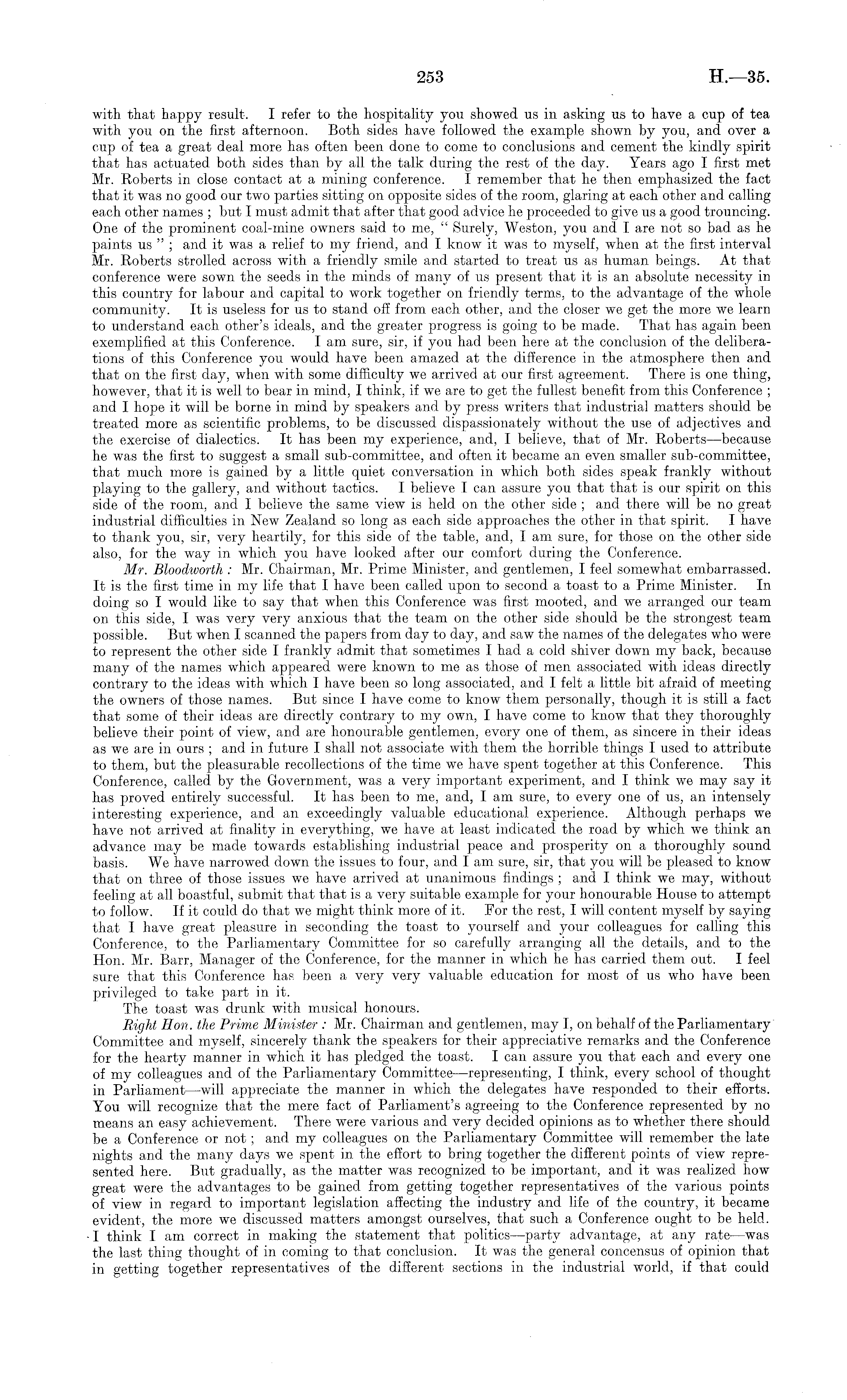 with that happy result. I refer to the hospitality you showed us in asking us to have a cup of tea with you on the first afternoon. Both sides have followed the example shown by you, and over a cup of tea a great deal more has often been done to come to conclusions and cement the kindly spirit that has actuated both sides than by all the talk during the rest of the day. Years ago I first met Mr. Roberts in close contact at a mining conference. I remember that he then emphasized the fact that it was no good our two parties sitting on opposite sides of the room, glaring at each other and calling each other names ; but I must admit that after that good advice he proceeded to give us a good trouncing. One of the prominent coal-mine owners said to me, " Surely, Weston, you and I are not so bad as he paints us " ; and it was a relief to my friend, and I know it was to myself, when at the first interval Mr. Roberts strolled across with a friendly smile and started to treat us as human beings. At that conference were sown the seeds in the minds of many of us present that it is an absolute necessity in this country for labour and capital to work together on friendly terms, to the advantage of the whole community. It is useless for us to stand off from each other, and the closer we get the more we learn to understand each other's ideals, and the greater progress is going to be made. That has again been exemplified at this Conference. lam sure, sir, if you had been here at the conclusion of the deliberations of this Conference you would have been amazed at the difference in the atmosphere then and that on the first day, when with some difficulty we arrived at our first agreement. There is one thing, however, that it is well to bear in mind, I think, if we are to get the fullest benefit from this Conference ; and I hope it will be borne in mind by speakers and by press writers that industrial matters should be treated more as scientific problems, to be discussed dispassionately without the use of adjectives and the exercise of dialectics. It has been my experience, and, I believe, that of Mr. Roberts —because he was the first to suggest a small sub-committee, and often it became an even smaller sub-committee, that much more is gained by a little quiet conversation in which both sides speak frankly without playing to the gallery, and without tactics. I believe I can assure you that that is our spirit on this side of the room, and I believe the same view is held on the other side ; and there will be no great industrial difficulties in New Zealand so long as each side approaches the other in that spirit. I have to thank you, sir, very heartily, for this side of the table, and, I am sure, for those on the other side also, for the way in which you have looked after our comfort during the Conference. Mr. Blooclworth : Mr. Chairman, Mr. Prime Minister, and gentlemen, I feel somewhat embarrassed. It is the first time in my life that I have been called upon to second a toast to a Prime Minister. In doing so I would like to say that when this Conference was first mooted, and we arranged our team on this side, I was very very anxious that the team on the other side should be the strongest team possible. But when I scanned the papers from day to day, and saw the names of the delegates who were to represent the other side I frankly admit that sometimes I had a cold shiver down my back, because many of the names which appeared were known to me as those of men associated with ideas directly contrary to the ideas with which I have been so long associated, and I felt a little bit afraid of meeting the owners of those names. But since I have come to know them personally, though it is still a fact that some of their ideas are directly contrary to my own, I have come to know that they thoroughly believe their point of view, and are honourable gentlemen, every one of them, as sincere in their ideas as we are in ours ; and in future I shall not associate with them the horrible things I used to attribute to them, but the pleasurable recollections of the time we have spent together at this Conference. This Conference, called by the Government, was a very important experiment, and I think we may say it has proved entirely successful. It has been to me, and, lam sure, to every one of us, an intensely interesting experience, and an exceedingly valuable educational experience. Although perhaps we have not arrived at finality in everything, we have at least indicated the road by which we think an advance may be made towards establishing industrial peace and prosperity on a thoroughly sound basis. We have narrowed down the issues to four,, and lam sure, sir, that you will be pleased to know that on three of those issues we have arrived at unanimous findings ; and I think we may, without feeling at all boastful, submit that that is a very suitable example for your honourable House to attempt to follow. If it could do that we might think more of it. For the rest, I will content myself by saying that I have great pleasure in seconding the toast to yourself and your colleagues for calling this Conference, to the Parliamentary Committee for so carefully arranging all the details, and to the Hon. Mr. Barr, Manager of the Conference, for the manner in which he has carried them out. I feel sure that this Conference has been a very very valuable education for most of us who have been privileged to take part in it. The toast was drunk with musical honours. Right Hon. the Prime Minister : Mr. Chairman and gentlemen, may I, on behalf of the Parliamentary Committee and myself, sincerely thank the speakers for their appreciative remarks and the Conference for the hearty manner in which it has pledged the toast. I can assure you that each and every one of my colleagues and of the Parliamentary Committee —representing, I think, every school of thought in Parliament—will appreciate the manner in which the delegates have responded to their 