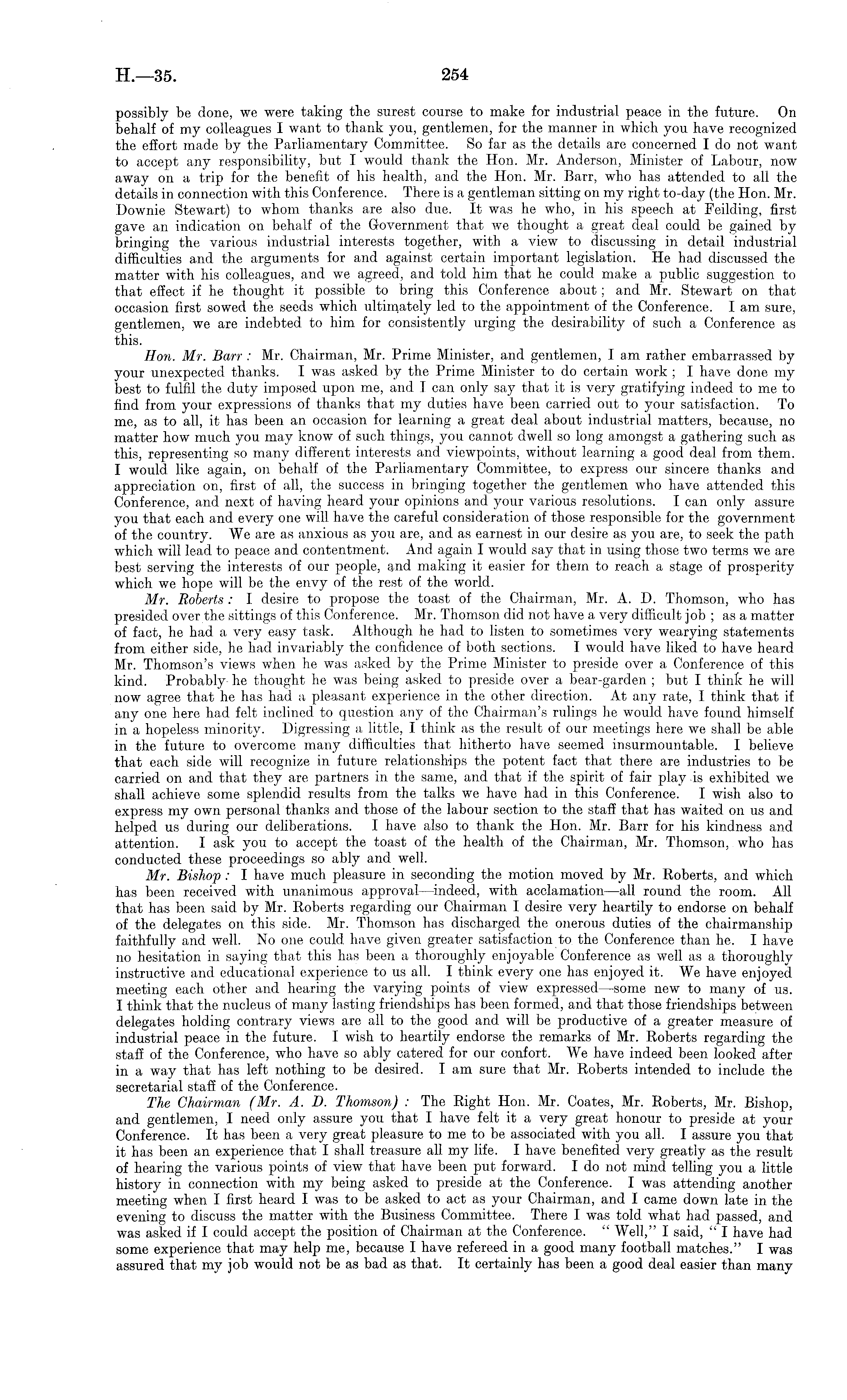 possibly be done, we were taking the surest course to make for industrial peace in the future. On behalf of my colleagues I want to thank you, gentlemen, for the manner in which you have recognized the effort made by the Parliamentary Committee. So far as the details are concerned Ido not want to accept any responsibility, but I would thank the Hon. Mr. Anderson, Minister of Labour, now away on a trip for the benefit of his health, and the Hon. Mr. Barr, who has attended to all the details in connection with this Conference. There is a gentleman sitting on my right to-day (the Hon. Mr. Downie Stewart) to whom thanks are also due. It was he who, in his speech at Feilding, first gave an indication on behalf of the Government that we thought a great deal could be gained by bringing the various industrial interests together, with a view to discussing in detail industrial difficulties and the arguments for and against certain important legislation. He had discussed the matter with his colleagues, and we agreed, and told him that he could make a public suggestion to that effect if he thought it possible to bring this Conference about; and Mr. Stewart on that occasion first sowed the seeds which ultimately led to the appointment of the Conference. lam sure, gentlemen, we are indebted to him for consistently urging the desirability of such a Conference as this. Hon. Mr. Barr : Mr. Chairman, Mr. Prime Minister, and gentlemen, I am rather embarrassed by your unexpected thanks. I was asked by the Prime Minister to do certain work ; I have done my best to fulfil the duty imposed upon me, and I can only say that it is very gratifying indeed to me to find from your expressions of thanks that my duties have been carried out to your satisfaction. To me, as to all, it has been an occasion for learning a great deal about industrial matters, because, no matter how much you may know of such things, you cannot dwell so long amongst a gathering such as this, representing so many different interests and viewpoints, without learning a good deal from them. I would like again, 011 behalf of the Parliamentary Committee, to express our sincere thanks and appreciation on, first of all, the success in bringing together the gentlemen who have attended this Conference, and next of having heard your opinions and your various resolutions. I can only assure you that each and every one will have the careful consideration of those responsible for the government of the country. We are as anxious as you are, and as earnest in our desire as you are, to seek the path which will lead to peace and contentment. And again I would say that in using those two terms we are best serving the interests of our people, and making it easier for them to reach a stage of prosperity which we hope will be the envy of the rest of the world. Mr. Roberts : I desire to propose the toast of the Chairman, Mr. A. D. Thomson, who has presided over the sittings of this Conference. Mr. Thomson did not have a very difficult job ; as a matter of fact, he had a very easy task. Although he had to listen to sometimes very wearying statements from either side, he had invariably the confidence of both sections. I would have liked to have heard Mr. Thomson's views when he was asked by the Prime Minister to preside over a Conference of this kind. Probably- he thought he was being asked to preside over a bear-garden ; but I think he will now agree that he has had a pleasant experience in the other direction. At any rate, I think that if any one here had felt inclined to question any of the Chairman's rulings he would have found himself in a hopeless minority. Digressing a little, I think as the result of our meetings here we shall be able in the future to overcome many difficulties that hitherto have seemed insurmountable. I believe that each side will recognize in future relationships the potent fact that there are industries to be carried on and that they are partners in the same, and that if the spirit of fair play is exhibited we shall achieve some splendid results from the talks we have had in this Conference. I wish also to express my own personal thanks and those of the labour section to the staff that has waited on us and helped us during our deliberations. I have also to thank the Hon. Mr. Barr for his kindness and attention. I ask you to accept the toast of the health of the Chairman, Mr. Thomson, who has conducted these proceedings so ably and well. Mr. Bishop : I have much pleasure in seconding the motion moved by Mr. Roberts, and which has been received with unanimous approval—indeed, with acclamation —all round the room. All that has been said by Mr. Roberts regarding our Chairman I desire very heartily to endorse on behalf of the delegates on this side. Mr. Thomson has discharged the onerous duties of the chairmanship faithfully and well. No one could have given greater satisfaction to the Conference than he. I have no hesitation in saying that this has been a thoroughly enjoyable Conference as well as a thoroughly instructive and educational experience to us all. I think every one has enjoyed it. We have enjoyed meeting each other and hearing the varying points of view expressed—some new to many of us. I think that the nucleus of many lasting friendships has been formed, and that those friendships between delegates holding contrary views are all to the good and will be productive of a greater measure of industrial peace in the future. I wish to heartily endorse the remarks of Mr. Roberts regarding the staff of the Conference, who have so ably catered for our confort. We have indeed been looked after in a way that has left nothing to be desired. lam sure that Mr. Roberts intended to include the secretarial staff of the Conference. The Chairman (Mr. A. D. Thomson) : The Right Hon. Mr. Coates, Mr. Roberts, Mr. Bishop, and gentlemen, I need only assure you that I have felt it a very great honour to preside at your Conference. It has been a very g