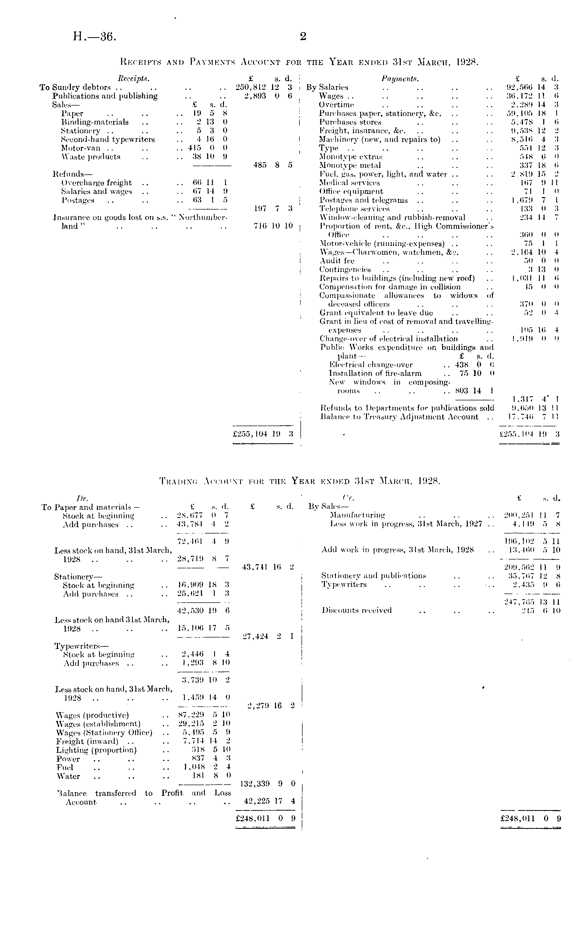 Receipts. £ s. d. Payments. £ s. d. To Sundry debtors .. .. .. .. 250,812 12 3By Salaries .. .. .. .. 92,566 14 3 Publications and publishing .. .. 2,893 0 6 Wages .. .. .. .. .. 36,172 11 6 Sales — £ s. d. Overtime .. .. .. .. 2,289 14 3 Paper .. .. 19 5 8 Purchases paper, stationery, &c. .. .. 59,105 18 1 Binding-materials .. .. 2 13 0 Purchases stores .. .. .. 5,478 1 6 Stationery .. .. .. 5 3 0 Freight, insurance, &c. .. .. .. 9,538 12 2 Second-hand typewriters .. 4 16 0 Machinery (new, and repairs to) .. .. 8,516 4 3 Motor-van .. .. .. 415 0 0 Type .. .. .. .. .. 554 12 3 Waste products .. .. 38 10 9 Monotype extras .. .. .. 548 6 0 485 8 5 Monotype metal .. .. .. 337 18 6 Refunds— Fuel, gas, power, light, and water .. .. 2,819 15 2 Overcharge freight .. .. 66 11 1 Medical services .. .. .. 167 9 11 Salaries and wages .. 67 14 9 Office equipment .. .. .. 71 1 0 Postages .. .. .. 63 1 5 Postages and telegrams .. .. .. 1,679 7 1 197 7 3 Telephone services .. .. .. 133 0 3 Insurance on goods lost on s.s. " Northumber- Window-cleaning and rubbish-removal . . 234 14 7 land " .. .. .. .. 716 10 10 Proportion of rent, &c., High Commissioner's Office .. .. .. .. 360 0 0 Motor-vehicle (running-expenses) .. .. 75 1 1 Wages—Charwomen, watchmen, &o. .. 2,164 10 4 Audit fee .. .. .. .. 50 0 0 Contingencies .. .. .. .. 3 13 0 Repairs to buildings (including new roof) .. 1,031 11 6 Compensation for damage in collision .. 45 0 0 Compassionate allowances to widows of deceased officers .. .. .. 370 0 0 Grant equivalent to leave due .. .. 52 0 4 Grant in lieu of cost of removal and travellingexpenses .. .. .. .. 105 16 4 Change-over of electrical installation .. 1,919 0 0 Public Works expenditure on buildings and plant— £ s. d. Electrical change-over ~ 438 0 0 Installation of fire-alarm .. 75 10 0 New windows in composingrooms .. .. .. 803 14 1 ■ — 1,317 4' 1 Refunds to Departments for publications sold 9,650 13 11 Balance to Treasury Adjustment Account .. 17,746 7 11 £255,104 19 3 - £255,104 19 3 Trading Account for the Year ended 31st March, 1928. I)r. Cr. £s. d. To Paper and materials — £s.d.£s. d. By Sales— Stock at beginning .. 28,677 0 7 Manufacturing .. .. .. 200,251 11 7 Add purchases .. .. 43,784 4 2 Less work in progress, 31st March, 1927 .. 4,149 5 8 72,461 4 9 196,102 5 11 Less stock on hand, 31st March, Add work in progress, 31st March, 1928 .. 13,460 510 1928 .. .. .. 28,719 87 — 43,741 16 2 209,562 11 9 Stationery— Stationery and publications .. .. 35,767 12 8 Stock at beginning .. 16,909 18 3 Typewriters .. .. .. 2,435 9 6 Add purchases .. .. 25,621 1 3 247,765 13 11 42,530 19 6 Discounts received .. .. .. 245 6 10 Less stock on hand 31st March, 1928 .. .. .. 15,106 17 5 ■ 27,424 2 1 Typewriters— Stock at beginning .. 2,446 1 4 Add purchases .. .. 1,293 810 3,739 10 2 Less stock on hand, 31st March, ' 1928 .. .. .. 1,459 14 0 • 2,279 16 2 Wages (productive) .. 87,229 510 Wages (establishment) .. 29,215 210 Wages (Stationery Office) .. 5,495 5 9 Freight (inward) .. .. 7,714 14 2 Lighting (proportion) .. 818 510 Power .. .. . • 837 4 3 Fuel .. .. .. 1,048 2 4 Water .. .. .. 181 8 0 132,339 9 0 3alance transferred to Profit and Loss Account .. .. .. .. 42,225 17 4 £248,011 0 9 £248,011 0 9