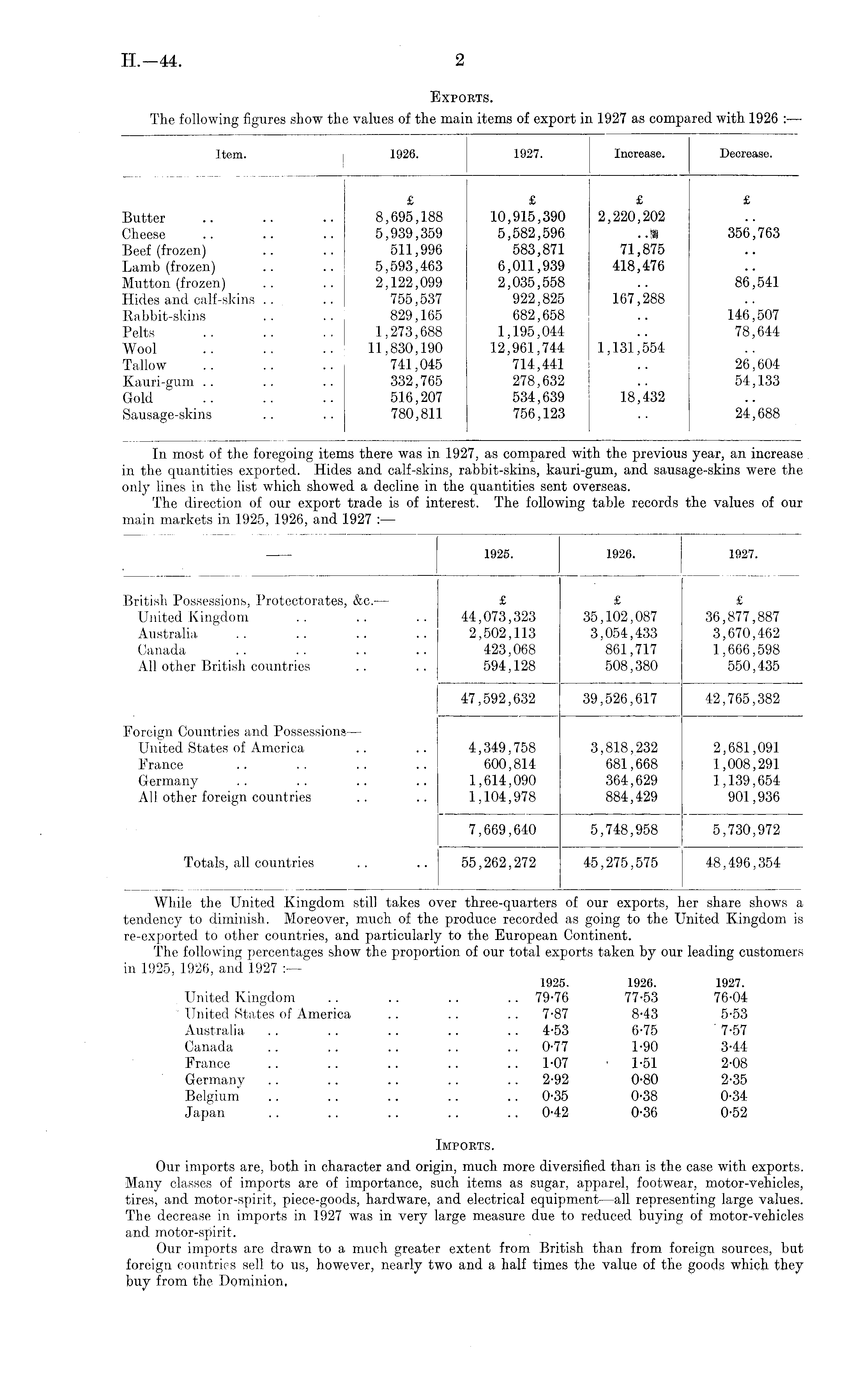 While the United Kingdom still takes over three-quarters of our exports, her share shows a tendency to diminish. Moreover, much of the produce recorded as going to the United Kingdom is re-exported to other countries, and particularly to the European Continent. The following percentages show the proportion of our total exports taken by our leading customers in 1925, 1926, and 1927 lQ9fi 1Q97 United Kingdom .. .. .. .. 79-76 77~53 76-04 United States of America .. .. .. 7-87 8-43 5-53 Australia .. .. .. .. .. 4-53 6-75 7-57 Canada .. .. .. .. .. 0-77 1-90 3-44 France .. .. .. .. .. 1-07 - 1-51 2-08 Germany .. .. .. .. .. 2-92 0-80 2-35 Belgium .. .. .. .. .. 0-35 0-38 0-34 Japan .. .. .. .. .. 0-42 0-36 0-52 Imports. Our imports are, both in character and origin, much more diversified than is the case with exports. Many classes of imports are of importance, such items as sugar, apparel, footwear, motor-vehicles, tires, and motor-spirit, piece-goods, hardware, and electrical equipment —all representing large values. The decrease in imports in 1927 was in very large measure due to reduced buying of motor-vehicles and motor-spirit. Our imports are drawn to a much greater extent from British than from foreign sources, but foreign countries sell to us, however, nearly two and a half times the value of the goods which they buy from the Dominion.