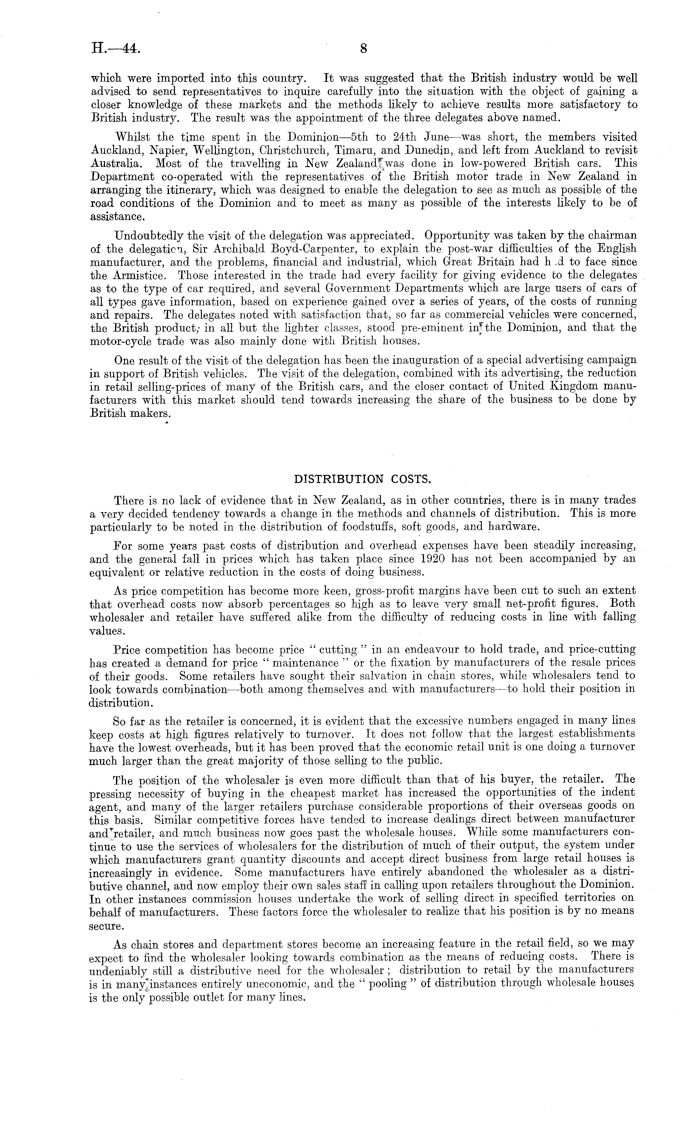 which were imported into this country. It was suggested that the British industry would be well advised to send representatives to inquire carefully into the situation with the object of gaining a closer knowledge of these markets and the methods likely to achieve results more satisfactory to British industry. The result was the appointment of the three delegates above named. Whilst the time spent in the Dominion —sth to 24th June —was short, the members visited Auckland, Napier, Wellington, Christchurch, Timaru, and Dunedin, and left from Auckland to revisit Australia. Most of the travelling in New ZealandTwas done in low-powered British cars. This Department co-operated with the representatives of the British motor trade in New Zealand in arranging the itinerary, which was designed to enable the delegation to see as much as possible of the road conditions of the Dominion and to meet as many as possible of the interests likely to be of assistance. Undoubtedly the visit of the delegation was appreciated. Opportunity was taken by the chairman of the delegation, Sir Archibald Boyd-Carpenter, to explain the post-war difficulties of the English manufacturer, and the problems, financial and industrial, which Great Britain had h .d to face since the Armistice. Those interested in the trade had every facility for giving evidence to the delegates as to the type of car required, and several Government Departments which are large users of cars of all types gave information, based on experience gained over a series of years, of the costs of running and repairs. The delegates noted with satisfaction that, so far as commercial vehicles were concerned, the British product,- in all but the lighter classes, stood pre-eminent in?the Dominion, and that the motor-cycle trade was also mainly done with British houses. One result of the visit of the delegation has been the inauguration of a special advertising campaign in support of British vehicles. The visit of the delegation, combined with its advertising, the reduction in retail selling-prices of many of the British cars, and the closer contact of United Kingdom manufacturers with this market should tend towards increasing the share of the business to be done by British makers. DISTRIBUTION COSTS. There is no lack of evidence that in New Zealand, as in other countries, there is in many trades a very decided tendency towards a change in the methods and channels of distribution. This is more particularly to be noted in the distribution of foodstuffs, soft goods, and hardware. For some years past costs of distribution and overhead expenses have been steadily increasing, and the general fall in prices which has taken place since 1920 has not been accompanied by an equivalent or relative reduction in the costs of doing business. As price competition has become more keen, gross-profit margins have been cut to such an extent that overhead costs now absorb percentages so high as to leave very small net-profit figures. Both wholesaler and retailer have suffered alike from the difficulty of reducing costs in line with falling values. Price competition has become price " cutting " in an endeavour to hold trade, and price-cutting has created a demand for price " maintenance " or the fixation by manufacturers of the resale prices of their goods. Some retailers have sought their salvation in chain stores, while wholesalers tend to look towards combination —both among themselves and with manufacturers —to hold their position in distribution. So far as the retailer is concerned, it is evident that the excessive numbers engaged in many lines keep costs at high figures relatively to turnover. It does not follow that the largest establishments have the lowest overheads, but it has been proved that the economic retail unit is one doing a turnover much larger than the great majority of those selling to the public. The position of the wholesaler is even more difficult than that of his buyer, the retailer. The pressing necessity of buying in the cheapest market has increased the opportunities of the indent agent, and many of the larger retailers purchase considerable proportions of their overseas goods on this basis. Similar competitive forces have tended to increase dealings direct between manufacturer and'retailer, and much business now goes past the wholesale houses. While some manufacturers continue to use the services of wholesalers for the distribution of much of their output, the system under which manufacturers grant quantity discounts and accept direct business from large retail houses is increasingly in evidence. Some manufacturers have entirely abandoned the wholesaler as a distributive channel, and now employ their own sales staff in calling upon retailers throughout the Dominion. In other instances commission houses undertake the work of selling direct in specified territories on behalf of manufacturers. These factors force the wholesaler to realize that his position is by no means secure. As chain stores and department stores become an increasing feature in the retail field, so we may expect to find the wholesaler looking towards combination as the means of reducing costs. There is undeniably still a distributive need for the wholesaler ; distribution to retail by the manufacturers is in nianyj instances entirely uneconomic, and the " pooling " of distribution through wholesale houses is the only possible outlet for many lines.