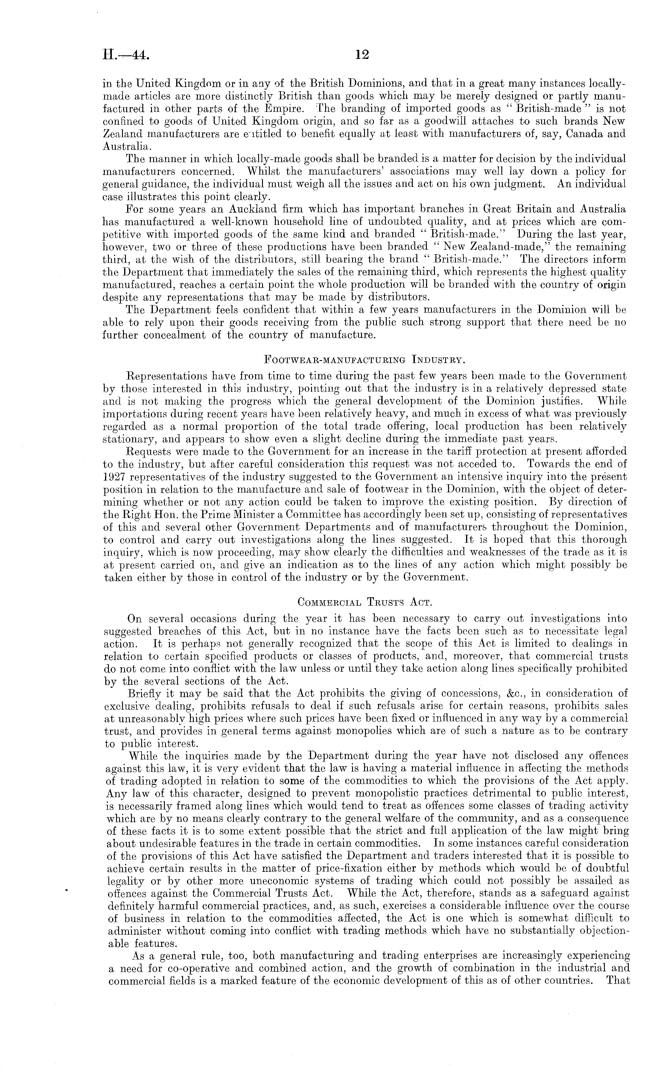 in the United Kingdom or in any of the British Dominions, and that in a great many instances locallymade articles are more distinctly British than goods which may be merely designed or partly manufactured in other parts of the Empire. The branding of imported goods as " British-made "is not confined to goods of United Kingdom origin, and so far as a goodwill attaches to such brands New Zealand manufacturers are entitled to benefit equally at least with manufacturers of, say, Canada and Australia. The manner in which locally-made goods shall be branded is a matter for decision by the individual manufacturers concerned. Whilst the manufacturers' associations may well lay down a policy for general guidance, the individual must weigh all the issues and act on his own judgment. An individual case illustrates this point clearly. For some years an Auckland firm which has important branches in Great Britain and Australia has manufactured a well-known household line of undoubted quality, and at prices which are competitive with imported goods of the same kind and branded " British-made." During the last year, however, two or three of these productions have been branded " New Zealand-made," the remaining third, at the wish of the distributors, still bearing the brand " British-made." The directors inform the Department that immediately the sales of the remaining third, which represents the highest quality manufactured, reaches a certain point the whole production will be branded with the country of origin despite any representations that may be made by distributors. The Department feels confident that within a few years manufacturers in the Dominion will be able to rely upon their goods receiving from the public such strong support that there need be no further concealment of the country of manufacture. Footwear-manufacturing Industry. Representations have from time to time during the past few years been made to the Government by those interested in this industry, pointing out that the industry is in a relatively depressed state and is not making the progress which the general development of the Dominion justifies. While importations during recent years have been relatively heavy, and much in excess of what was previously regarded as a normal proportion of the total trade offering, local production has been relatively stationary, and appears to show even a slight decline during the immediate past years. Requests were made to the Government for an increase in the tariff protection at present afforded to the industry, but after careful consideration this request was not acceded to. Towards the end of 1927 representatives of the industry suggested to the Government an intensive inquiry into the present position in relation to the manufacture and sale of footwear in the Dominion, with the object of determining whether or not any action could be taken to improve the existing position. By direction of the Right Hon. the Prime Minister a Committee has accordingly been set up, consisting of representatives of this and several other Government Departments and of manufacturers throughout the Dominion, to control and carry out investigations along the lines suggested. It is hoped that this thorough inquiry, which is now proceeding, may show clearly the difficulties and weaknesses of the trade as it is at present carried on, and give an indication as to the lines of any action which might possibly be taken either by those in control of the industry or by the Government. Commercial Trusts Act. On several occasions during the year it has been necessary to carry out investigations into suggested breaches of this Act, but in no instance have the facts been such as to necessitate legal action. It is perhaps not generally recognized that the scope of this Act is limited to dealings in relation to certain specified products or classes of products, and, moreover, that commercial trusts do not come into conflict with the law unless or until they take action along lines specifically prohibited by the several sections of the Act. Briefly it may be said that the Act prohibits the giving of concessions, &c., in consideration of exclusive dealing, prohibits refusals to deal if such refusals arise for certain reasons, prohibits sales at unreasonably high prices where such prices have been fixed or influenced in any way by a commercial trust, and provides in general terms against monopolies which are of such a nature as to be contrary to public interest. While the inquiries made by the Department during the year have not disclosed any offences against this law, it is very evident that the law is having a material influence in affecting the methods of trading adopted in relation to some of the commodities to which the provisions of the Act apply. Any law of this character, designed to prevent monopolistic practices detrimental to public interest, is necessarily framed along lines which would tend to treat as offences some classes of trading activity which are by no means clearly contrary to the general welfare of the community, and as a consequence of these facts it is to some extent possible that the strict and full application of the law might bring about undesirable features in the trade in certain commodities. In some instances careful consideration of the provisions of this Act have satisfied the Department and traders interested that it is possible to achieve certain results in the matter of price-fixation either by methods which would be of doubtful legality or by other more uneconomic systems of trading which could not possibly be assailed as offences against the Commercial Trusts Act. While the Act, therefore, stands as a safeguard against definitely harmful commercial practices, and, as such, exercises a considerable influence over the course of business in relation to the commodities affected, the Act is one which is somewhat difficult to administer without coming into conflict with trading methods which have no su