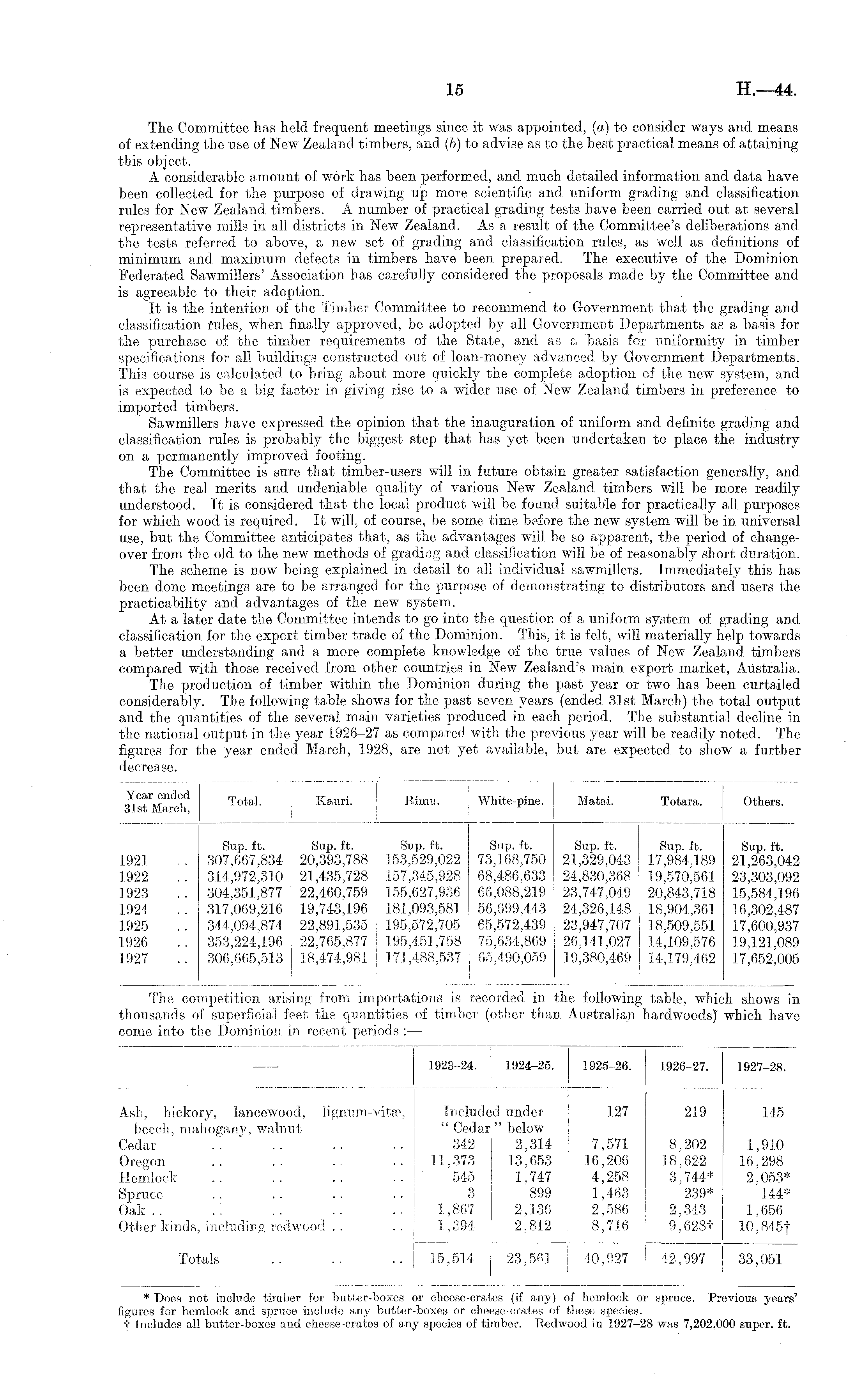 The Committee has held frequent meetings since it was appointed, (a) to consider ways and means of extending the use of New Zealand timbers, and (b) to advise as to the best practical means of attaining this object. A considerable amount of work has been performed, and much detailed information and data have been collected for the purpose of drawing up more scientific and uniform grading and classification rules for New Zealand timbers. A number of practical grading tests have been carried out at several representative mills in all districts in New Zealand. As a result of the Committee's deliberations and the tests referred to above, a new set of grading and classification rules, as well as definitions of minimum and maximum defects in timbers have been prepared. The executive of the Dominion Federated Sawmillers' Association has carefully considered the proposals made by the Committee and is agreeable to their adoption. It is the intention of the Timber Committee to recommend to Government that the grading and classification fules, when finally approved, be adopted by all Government Departments as a basis for the purchase of the timber requirements of the State, and as a basis for uniformity in timber specifications for all buildings constructed out of loan-money advanced by Government Departments. This course is calculated to bring about more quickly the complete adoption of the new system, and is expected to be a big factor in giving rise to a wider use of New Zealand timbers in preference to imported timbers. Sawmillers have expressed the opinion that the inauguration of uniform and definite grading and classification rules is probably the biggest step that has yet been undertaken to place the industry on a permanently improved footing. The Committee is sure that timber-users will in future obtain greater satisfaction genera,lly, and that the real merits and undeniable quality of various New Zealand timbers will be more readily understood. It is considered that the local product will be found suitable for practically all purposes for which wood is required. It will, of course, be some time before the new system will be in universal use, but the Committee anticipates that, as the advantages will be so apparent, the period of changeover from the old to the new methods of grading and classification will be of reasonably short duration. The scheme is now being explained in detail to all individual sawmillers. Immediately this has been done meetings are to be arranged for the purpose of demonstrating to distributors and users the practicability and advantages of the new system. At a later date the Committee intends to go into the question of a uniform system of grading and classification for the export timber trade of the Dominion. This, it is felt, will materially help towards a better understanding and a more complete knowledge of the true values of New Zealand timbers compared with those received from other countries in New Zealand's main export market, Australia. The production of timber within the Dominion during the past year or two has been curtailed considerably. The following table shows for the past seven years (ended 31st March) the total output and the quantities of the several main varieties produced in each period. The substantial decline in the national output in the year 1926-27 as compared with the previous year will be readily noted. The figures for the year ended March, 1928, are not yet available, but are expected to show a further decrease.