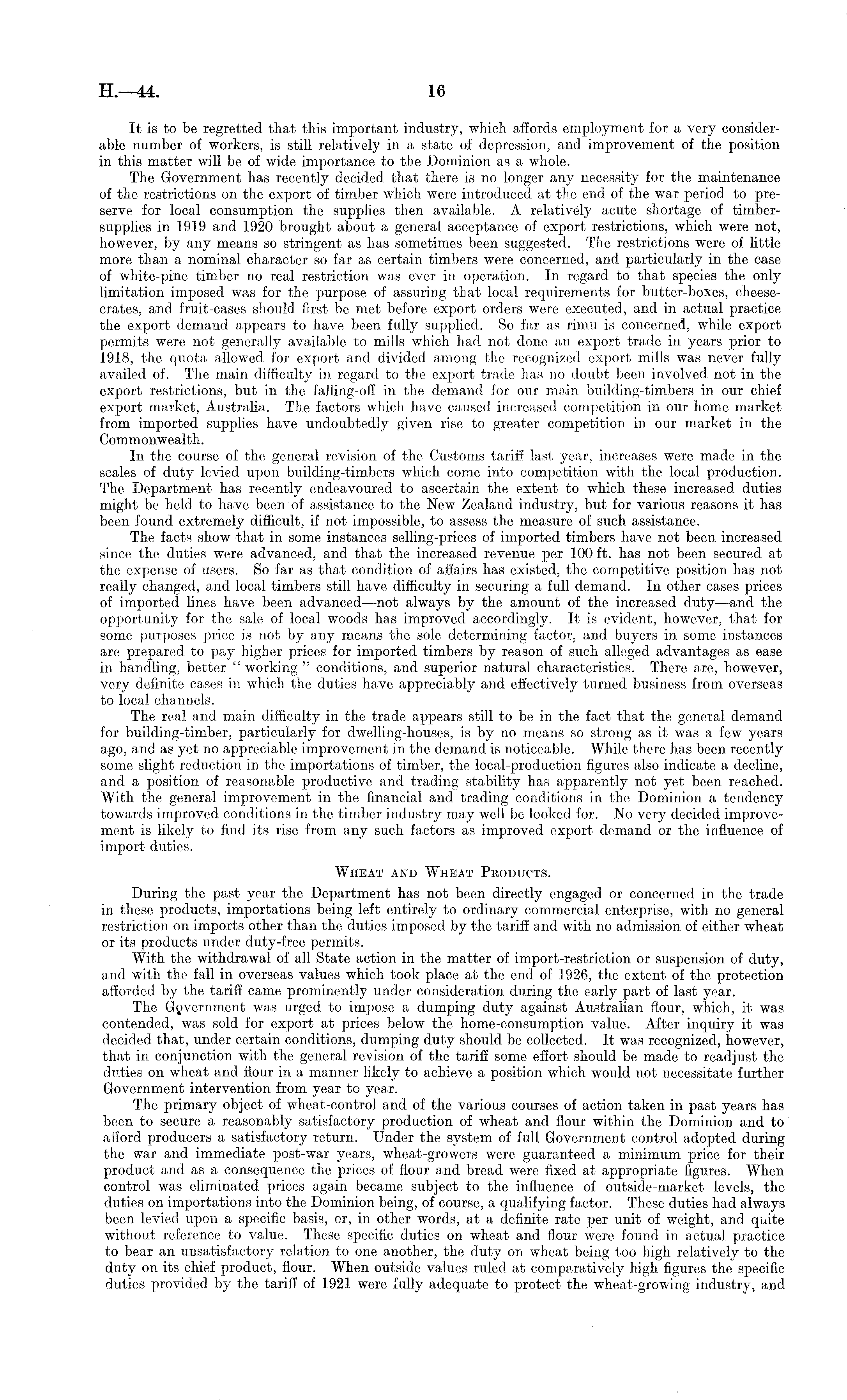 It is to be regretted that this important industry, which affords employment for a very considerable number of workers, is still relatively in a state of depression, and improvement of the position in this matter will be of wide importance to the Dominion as a whole. The Government has recently decided that there is no longer any necessity for the maintenance of the restrictions on the export of timber which were introduced at the end of the war period to preserve for local consumption the supplies then available. A relatively acute shortage of timbersupplies in 1919 and 1920 brought about a general acceptance of export restrictions, which were not, however, by any means so stringent as has sometimes been suggested. The restrictions were of little more than a nominal character so far as certain timbers were concerned, and particularly in the case of white-pine timber no real restriction was ever in operation. In regard to that species the only limitation imposed was for the purpose of assuring that local requirements for butter-boxes, cheesecrates, and fruit-cases should first be met before export orders were executed, and in actual practice the export demand appears to have been fully supplied. So far as rimu is concerned, while export permits were not generally available to mills which had not done an export trade in years prior to 1918, the quota allowed for export and divided among the recognized export mills was never fully availed of. The main difficulty in regard to the export trade has no doubt been involved not in the export restrictions, but in the falling-off in the demand for our main building-timbers in our chief export market, Australia. The factors which have caused increased competition in our home market from imported supplies have undoubtedly given rise to greater competition in our market in the Commonwealth. In the course of the general revision of the Customs tariff last year, increases were made in the scales of duty levied upon building-timbers which come into competition with the local production. The Department has recently endeavoured to ascertain the extent to which these increased duties might be held to have been of assistance to the New Zealand industry, but for various reasons it has been found extremely difficult, if not impossible, to assess the measure of such assistance. The facts show that in some instances selling-prices of imported timbers have not been increased since the duties were advanced, and that the increased revenue per 100 ft. has not been secured at the expense of users. So far as that condition of affairs has existed, the competitive position has not really changed, and local timbers still have difficulty in securing a full demand. In other cases prices of imported lines have been advanced —not always by the amount of the increased duty —and the opportunity for the sale of local woods has improved accordingly. It is evident, however, that for some purposes price is not by any means the sole determining factor, and buyers in some instances are prepared to pay higher prices for imported timbers by reason of such alleged advantages as ease in handling, better " working " conditions, and superior natural characteristics. There are, however, very definite cases in which the duties have appreciably and effectively turned business from overseas to local channels. The real and main difficulty in the trade appears still to be in the fact that the general demand for building-timber, particularly for dwelling-houses, is by no means so strong as it was a few years ago, and as yet no appreciable improvement in the demand is noticeable. While there has been recently some slight reduction in the importations of timber, the local-production figures also indicate a decline, and a position of reasonable productive and trading stability has apparently not yet been reached. With the general improvement in the financial and trading conditions in the Dominion a tendency towards improved conditions in the timber industry may well be looked for. No very decided improvement is likely to find its rise from any such factors as improved export demand or the influence of import duties. Wheat and Wheat Products. During the past year the Department has not been directly engaged or concerned in the trade in these products, importations being left entirely to ordinary commercial enterprise, with no general restriction on imports other than the duties imposed by the tariff and with no admission of either wheat or its products under duty-free permits. With the withdrawal of all State action in the matter of import-restriction or suspension of duty, and with the fall in overseas values which took place at the end of 1926, the extent of the protection afforded by the tariff came prominently under consideration during the early part of last year. The Government was urged to impose a dumping duty against Australian flour, which, it was contended, was sold for export at prices below the home-consumption value. After inquiry it was decided that, under certain conditions, dumping duty should be collected. It was recognized, however, that in conjunction with the general revision of the tariff some effort should be made to readjust the duties on wheat and flour in a manner likely to achieve a position which would not necessitate further Government intervention from year to year. The primary object of wheat-control and of the various courses of action taken in past years has been to secure a reasonably satisfactory production of wheat and flour within the Dominion and to afford producers a satisfactory return. Under the system of full Government control adopted during the war and immediate post-war years, wheat-growers were guaranteed a minimum price for their product and as a consequence the prices of flour and bread were fixed at appropriate figures. When control was eliminated prices again became subject to the influence of outside-market levels, the duties on importations in