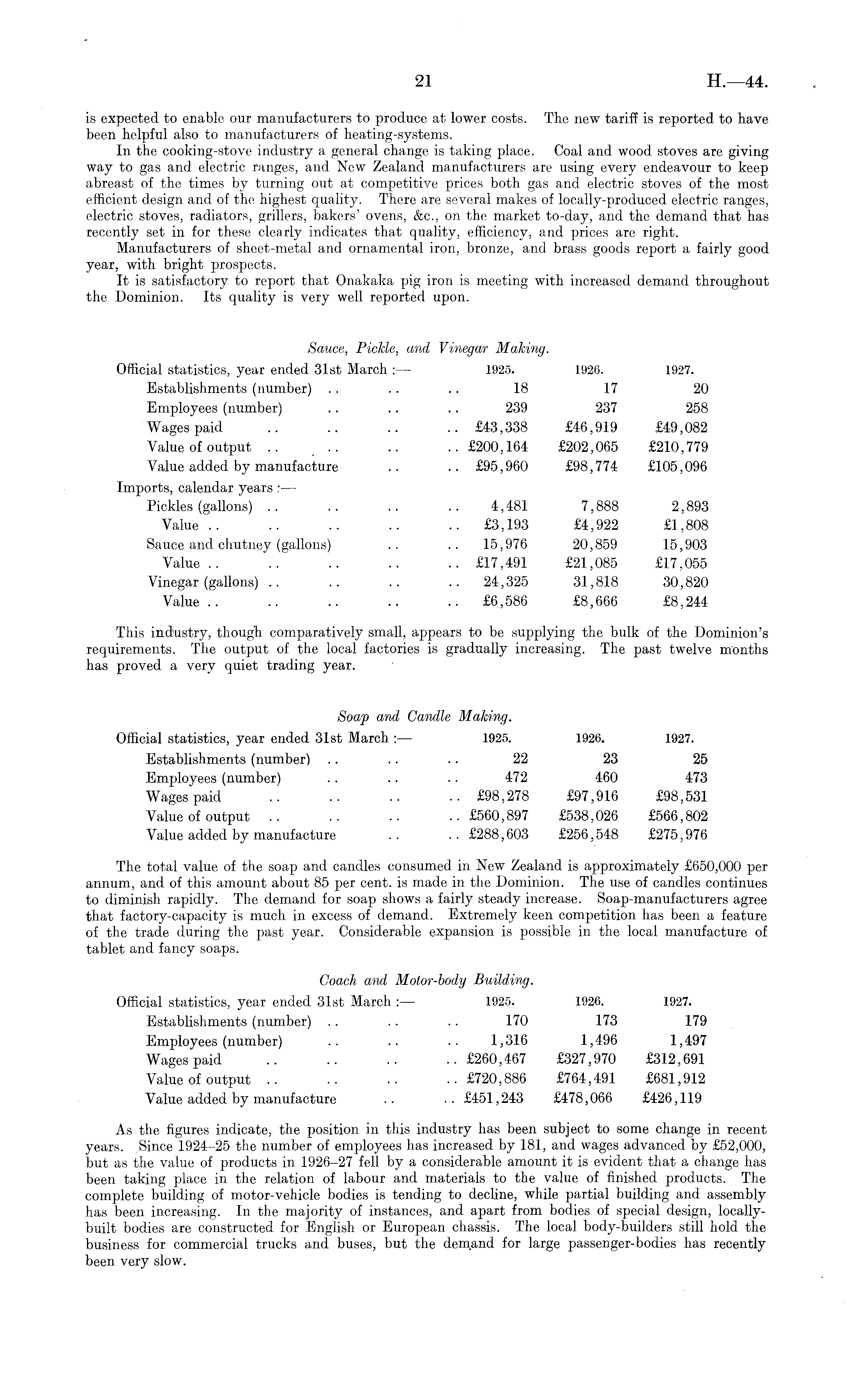 is expected to enable our manufacturers to produce at lower costs. The new tariff is reported to have been helpful also to manufacturers of heating-systems. In the cooking-stove industry a general change is taking place. Coal and wood stoves are giving way to gas and electric ranges, and New Zealand manufacturers are using every endeavour to keep abreast of the times by turning out at competitive prices both gas and electric stoves of the most efficient design and of the highest quality. There are several makes of locally-produced electric ranges, electric stoves, radiators, grillers, bakers' ovens, &c., on the market to-day, and the demand that has recently set in for these clearly indicates that quality, efficiency, and prices are right. Manufacturers of sheet-metal and ornamental iron, bronze, and brass goods report a fairly good year, with bright prospects. It is satisfactory to report that Onakaka pig iron is meeting with increased demand throughout the Dominion. Its quality is very well reported upon. Sauce, Pickle, and Vinegar Making. Official statistics, year ended 31st March : — 1925. 1926. 1927. Establishments (number) . . .. .. 18 17 20 Employees (number) .. .. .. 239 237 258 Wages paid .. .. .. .. £43,338 £46,919 £49,082 Value of output .. .. .. .. £200,164 £202,065 £210,779 Value added by manufacture .. .. £95,960 £98,774 £105,096 Imports, calendar years : — Pickles (gallons) .. .. . . .. 4,481 7,888 2,893 Value .. .. .. .. .. £3,193 £4,922 £1,808 Sauce and chutney (gallons) .. .. 15,976 20,859 15,903 Value .. .. .. .. .. £17,491 £21,085 £17,055 Vinegar (gallons) .. .. .. .. 24,325 31,818 30,820 Value .. .. .. .. .. £6,586 £8,666 £8,244 This industry, though comparatively small, appears to be supplying the bulk of the Dominion's requirements. The output of the local factories is gradually increasing. The past twelve months has proved a very quiet trading year. Soap and Candle Making. Official statistics, year ended 31st March 1925. 1926. 1927. Establishments (number) .. . . .. 22 23 25 Employees (number) .. .. .. 472 460 473 Wages paid .. .. .. .. £98,278 £97,916 £98,531 Value of output .. .. .. .. £560,897 £538,026 £566,802 Value added by manufacture .. .. £288,603 £256,548 £275,976 The total value of the soap and candles consumed in New Zealand is approximately £650,000 per annum, and of this amount about 85 per cent, is made in the Dominion. The use of candles continues to diminish rapidly. The demand for soap shows a fairly steady increase. Soap-manufacturers agree that factory-capacity is much in excess of demand. Extremely keen competition has been a feature of the trade during the past year. Considerable expansion is possible in the local manufacture of tablet and fancy soaps. Coach and Motor-body Building. Official statistics, year ended 31st March : — 1925. 1926. 1927. Establishments (number) .. .. . . 170 173 179 Employees (number) .. .. .. 1,316 1,496 1,497 Wages paid .. .. .. .. £260,467 £327,970 £312,691 Value of output .. .. .. .. £720,886 £764,491 £681,912 Value added by manufacture .. •• £451,243 £478,066 £426,119 As the figures indicate, the position in this industry has been subject to some change in recent years. Since 1924-25 the number of employees has increased by 181, and wages advanced by £52,000, but as the value of products in 1926-27 fell by a considerable amount it is evident that a change has been taking place in the relation of labour and materials to the value of finished products. The complete building of motor-vehicle bodies is tending to decline, while partial building and assembly has been increasing. In the majority of instances, and apart from bodies of special design, locallybuilt bodies are constructed for English or European chassis. The local body-builders still hold the business for commercial trucks and buses, but the demand for large passenger-bodies has recently been very slow.