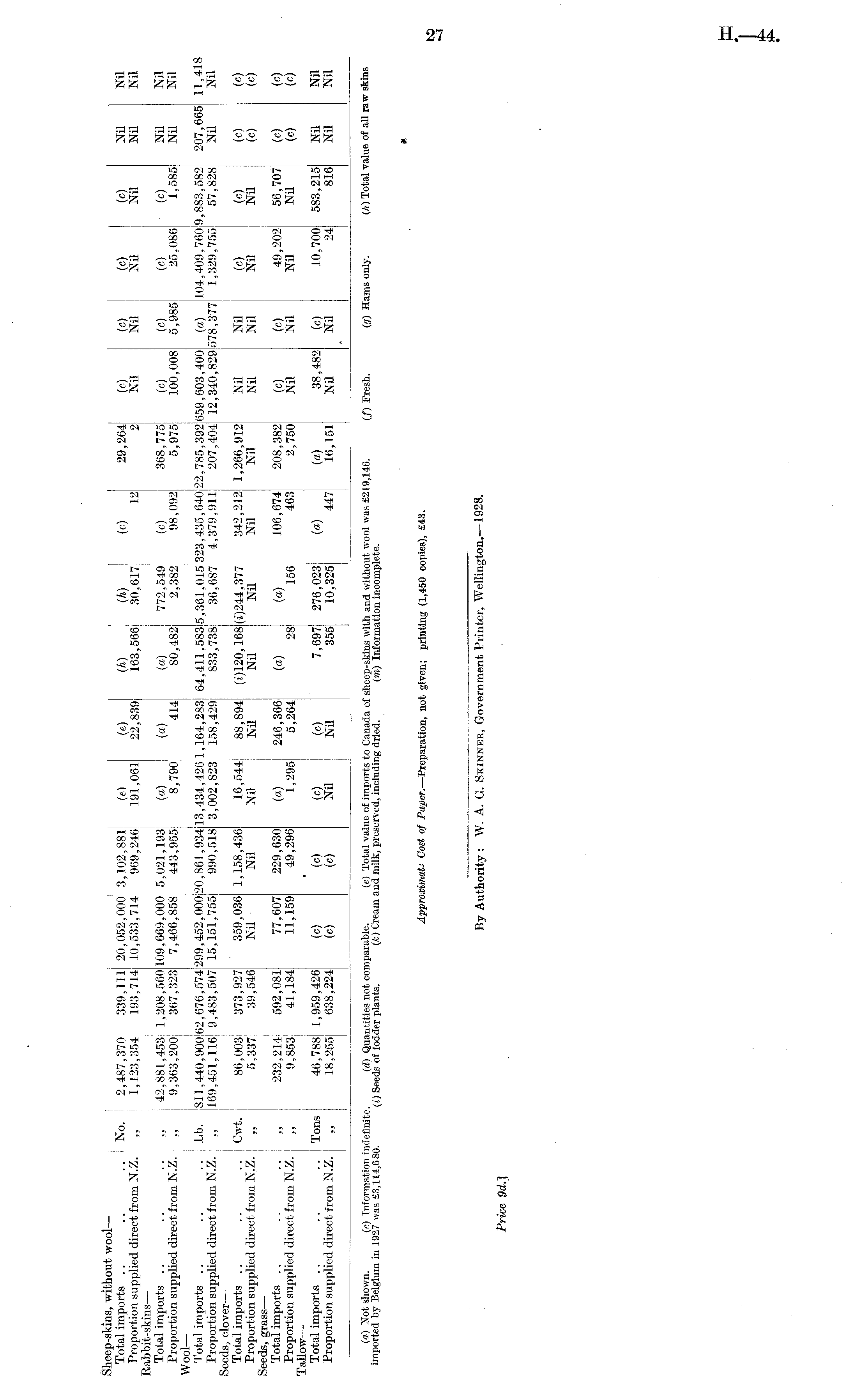 Sheep-skins, without wool — j ; Total imports .. .. ..No. 2,487,370 339,111 20,052,000 3,102,881 (e) (e) (h) (h) (c) 29,264 (c) (c) (c) (c) Nil Nil Proportion supplied direct from N.Z. „ 1,123,354 193,714 10,533,714 969,246 191,061 22,839 163,566 30,617 12 2 Nil Nil Nil Nil Nil Nil Rabbit-skins — Total imports .. .. .. „ 42,881,453 1,208,560109,669,000 5,021,193 (a) (a) (a) 772,549' (c) 368,775 (c) (c) (c) (c) Nil Nil Proportion supplied direct from N.Z. „ 9,363,200 367,323 7,466,858 443,955 8,790 414 80,482 2,382, 98,092 5,975 100,008 5,985 25,086 1,585 Nil Nil Wool — Total imports .. .. .. Lb. 811,440,900 62,676,574299,452,000 20,861,93413,434,4261,164,283 64,411,583 5,361,015 323,435,640 22,785,392 659,603,400 (a) 104,409,760 9,883,582 207,665 11,41S Proportion supplied direct from N.Z. „ 169,451,116 9,483,507 15,151,755 990,518 3,002,823 158,429 833,738 36,687 4,379,911 207,404 12,340,829578,377 1,329,755 57,828 Nil Nil Seeds; clover — Total imports .. .. .. | Cwt. 86,003 373,927 359,036 1,158,436 16,544 88,894 (i)120, 168 (i)244,377 342,212 1,266,912 Nil Nil (c) (c) (c) (c) Proportion supplied direct from N.Z. | ,, 5,337 39,546 Nil Nil Nil Nil Nil Nil Nil Nil Nil Nil Nil Nil (cj (c) Seeds, grass — Total imports .. .. .. „ 232,214 592,081 77,607 229,630 (a) 246,366 (a) (a) 106,674 208,382 (c) (c) 49,202 56,707 (c) (c) Proportion supplied direct from N.Z. ] ,, 9,853 41,184 11,159 49,296 1,295 5,264 28 156 463 2,750 Nil Nil Nil Nil (c) (c) Tallow — I Total imports .. .. .. Tons 46,788 1,959,426 (c) (c) (c) (c) 7,697 276,023 {a) (a) 38,482 (c) 10,700 583,215 Nil Nil Proportion supplied direct from N.Z. i „ 18,255 638,224 (c) (c) Nil Nil 355 10,325 447 16,151 Nil Nil 24 816 Nil Nil * (a) Not shown. (c) Information indefinite. (d) Quantities not comparable. (e) Total value of imports to Canada of sheep-skins with and without wool was £219,146. (/) Fresh. (g) Hams only. (h) Total value of all raw skins imported by Belgium in 1927 was £3,114,680. (i) Seeds of fodder plants. (k) Cream and milk, preserved, including dried. (m) Information incomplete.