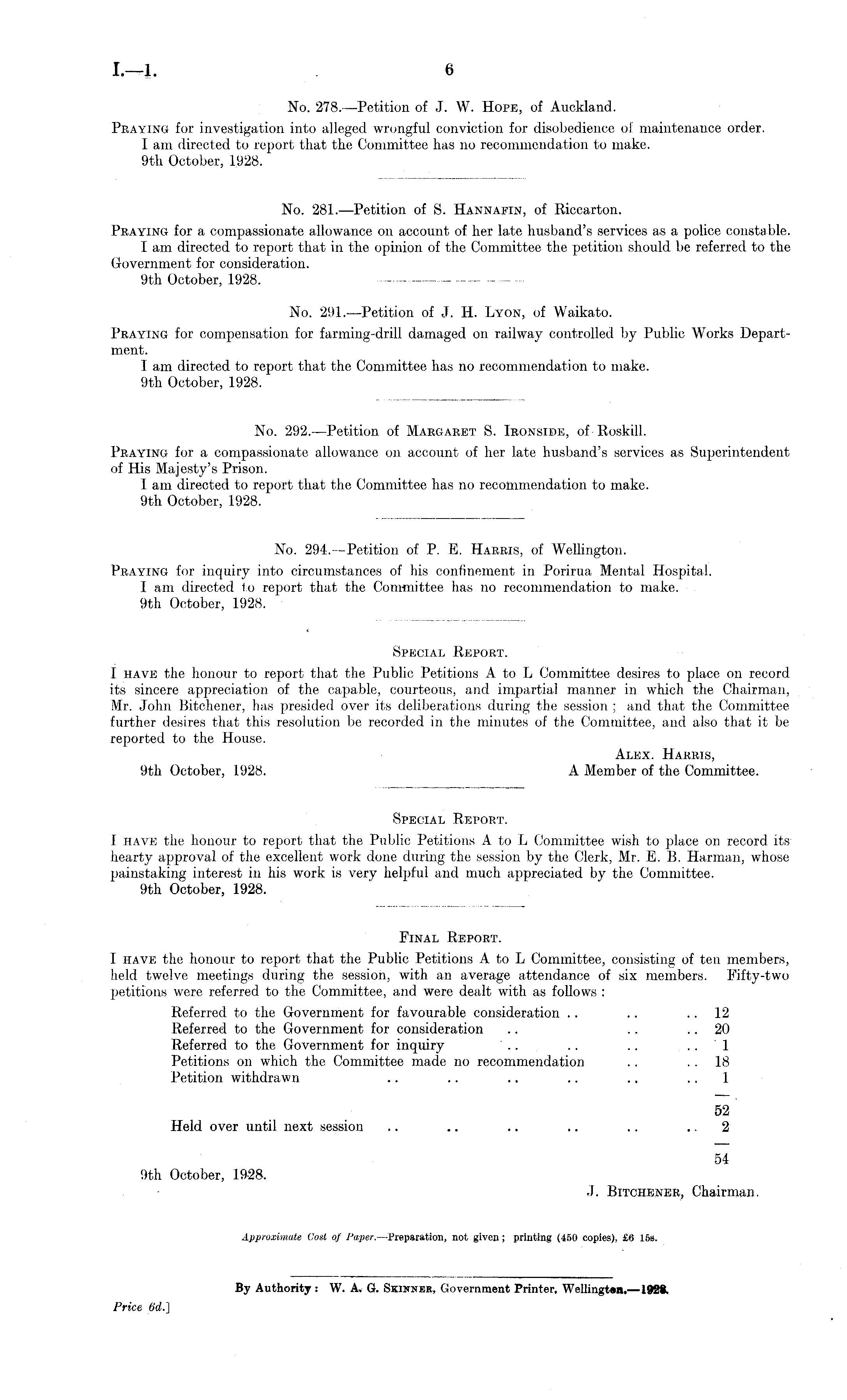 Special Report. I have the honour to report that the Public Petitions A to L Committee desires to place on record its sincere appreciation of the capable, courteous, and impartial manner in which the Chairman, Mr. John Bitchener, has presided over its deliberations during the session ; and that the Committee further desires that this resolution be recorded in the minutes of the Committee, and also that it be reported to the House. Alex. Harris, 9th October, 1928. A Member of the Committee.