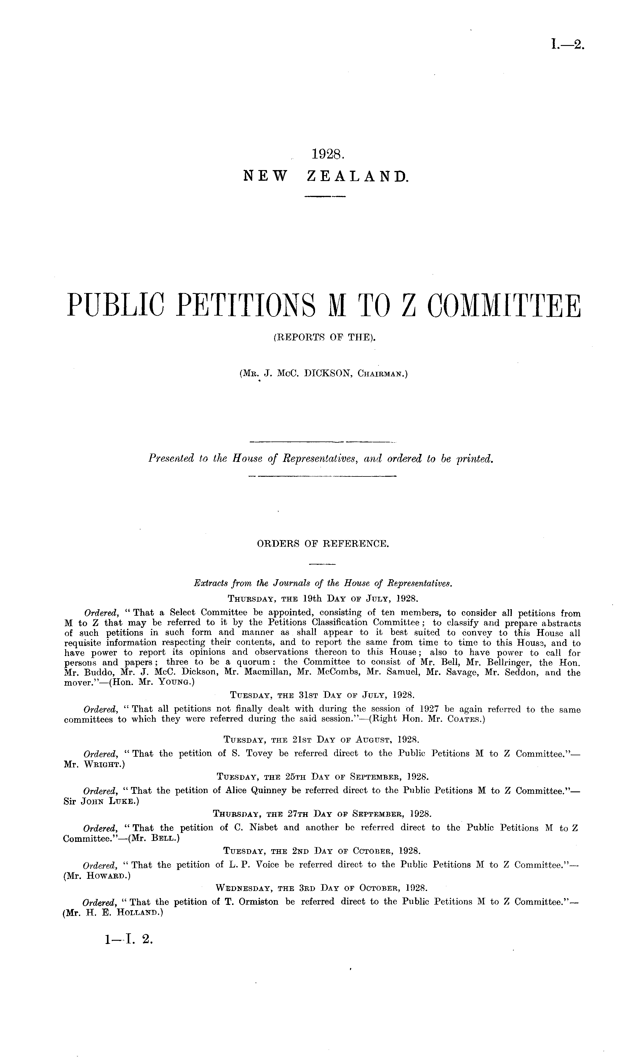 ORDERS OF REFERENCE. Extracts from the Journals of the, House of Representatives. Thursday, the 19th Day of July, 1928. Ordered, " That a Select Committee be appointed, consisting of ten members, to consider a]] petitions from Mto Z that may be referred to it by the Petitions Classification Committee; to classify and prepare abstracts of such petitions in such form and manner as shall appear to it best suited to convey to this House all requisite information respecting their contents, and to report the same from time to time to this House, and to have power to report its opinions and observations thereon to this House; also to have power to call for persons and papers ; three to be a quorum : the Committee to consist of Mr. Bell, Mr. Bellringer, the Hon. Mr. Buddo, Mr. J. McC. Dickson, Mr. Macmillan, Mr. McCombs, Mr. Samuel, Mr. Savage, Mr. Seddon, and the mover."—(Hon. Mr. Young.) Tuesday, the 31st Day of July, 1928. Ordered, " That all petitions not finally dealt with during the session of 1927 be again referred to the same committees to which they were referred during the said session." —(Right Hon. Mr. Coates.) Tuesday, the 2 Ist Day of August, 1928. Ordered, " That the petition of S. Tovey be referred direct to the Public Petitions M to Z Committee."— Mr. Weight.) Tuesday, the 25th Day of September, 1928. Ordered, " That the petition of Alice Quinney be referred direct to the Public Petitions M to Z Committee."— Sir John Luke.) Thursday, the 27th Day of September, 1928. Ordered, " That the petition of C. Nisbet and another be referred direct to the Public Petitions M to Z Committee." —(Mr. Bell.) Tuesday, the 2nd Day of October, 1928. Ordered, " That the petition of L. P. Voice be referred direct to the Public Petitions M to Z Committee."— (Mr. Howard.) Wednesday, the 3rd Day of October, 1928. Ordered, " That the petition of T. Ormiston be referred direct to the Public Petitions M to Z Committee."— (Mr. H. E. Holland.)