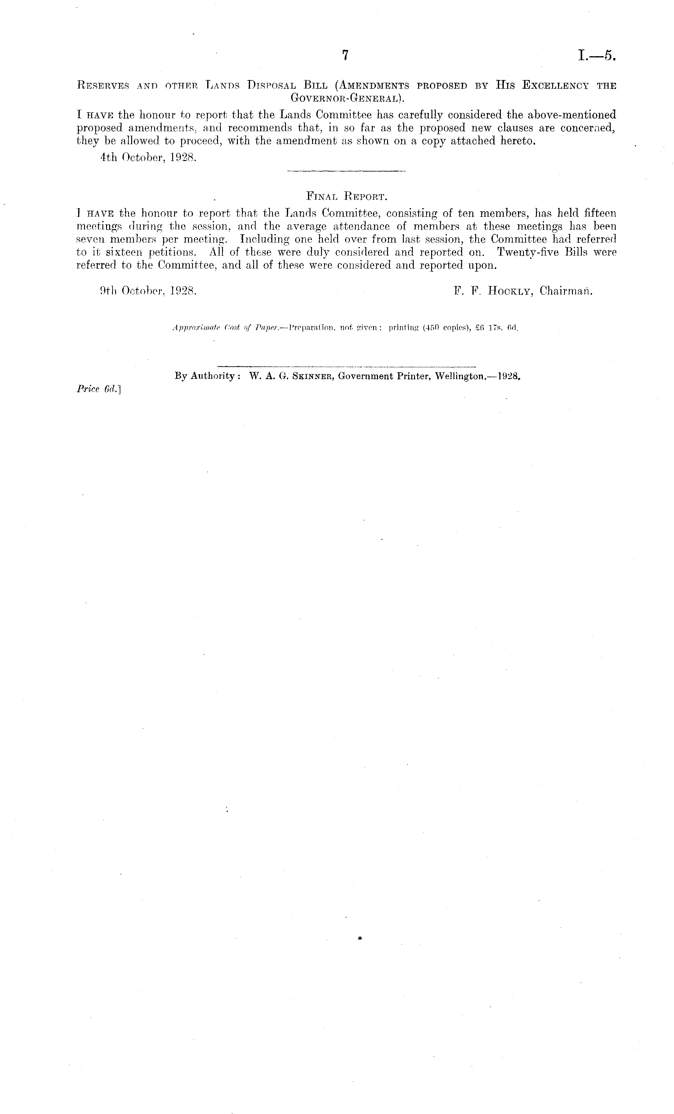 Reserves and other, Lands Disposal Bill (Amendments proposed by His Excellency the Governor-General). I have the honour to report that the Lands Committee has carefully considered the above-mentioned proposed amendments, and recommends that, in so far as the proposed new clauses are concerned, they be allowed to proceed, with the amendment as shown on a copy attached hereto. 4th October, 1928.