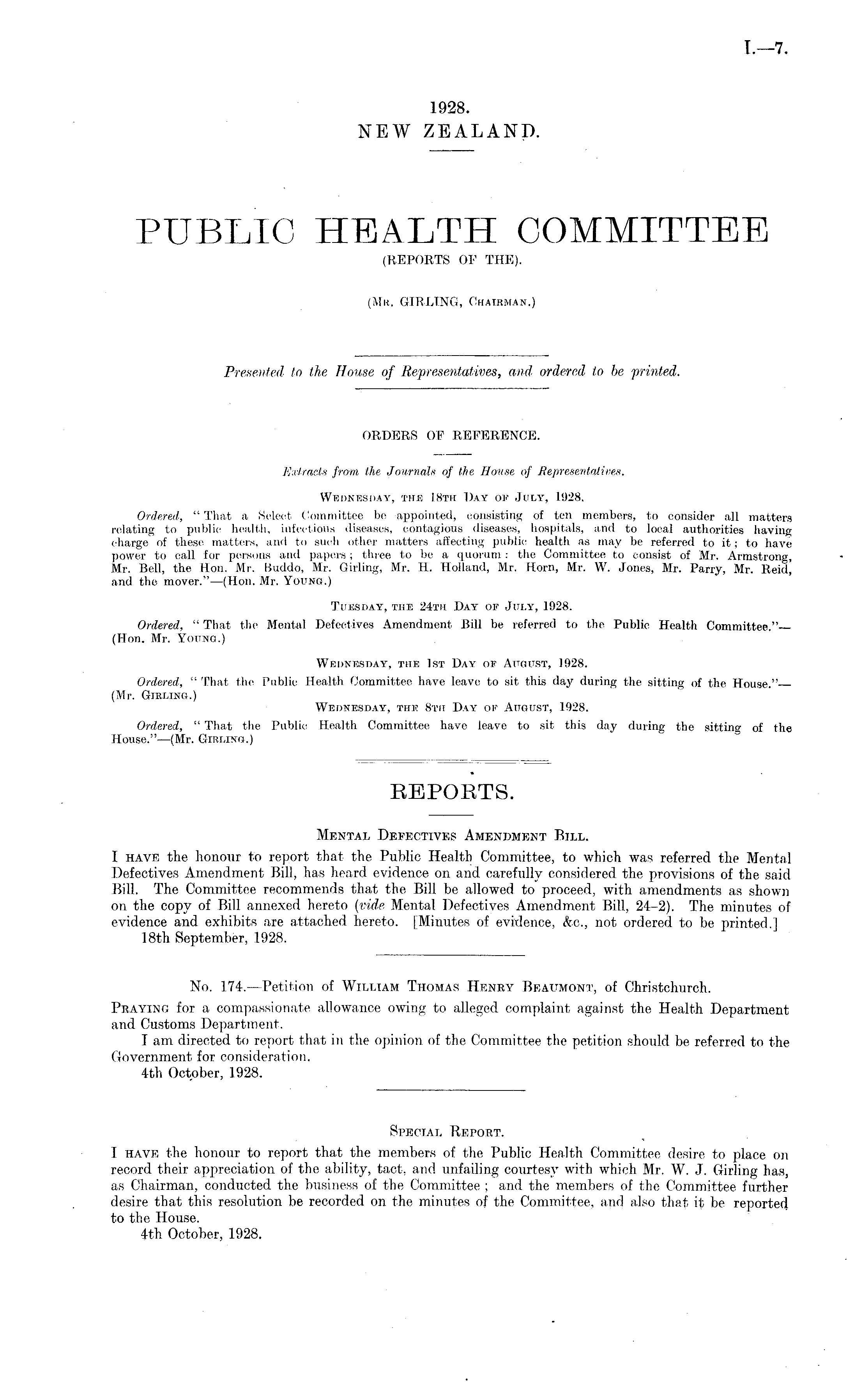 ORDERS OF REFERENCE. Extracts from the Journals of the House of Representatives. Wednesday, the 18th Day of July, 1928. Ordered, " That a Select Committee be appointed, consisting of ten members, to consider all matters relating to public health, infectious diseases, contagious diseases, hospitals, and to local authorities having charge of these matters, and to such other matters affecting public health as may be referred to it; .to have power to call for persons and papers; three to be a quorum : the Committee to consist of Mr. Armstrong, Mr. Bell, the Hon. Mr. Buddo, Mr. Girling, Mr. H. Holland, Mr. Horn, Mr. W. Jones, Mr. Parry, Mr. Reid, and the mover."—(Hon. Mr. Young.) Tuesday, the 24th Day of July, 1928. Ordered, " That the Mental Defectives Amendment Bill be referred to the Public Health Committee." (Hon. Mr. Young.) Wednesday, the Ist Day of August, 1928. Ordered, " That the Public Health Committee have leave to sit this day during the sitting of the House." (Mr. Girling.) Wednesday, the Btii Day of August, 1928. Ordered, " That the Public Health Committee have leave to sit this day during the sitting of the House."—(Mr. Girling.)
