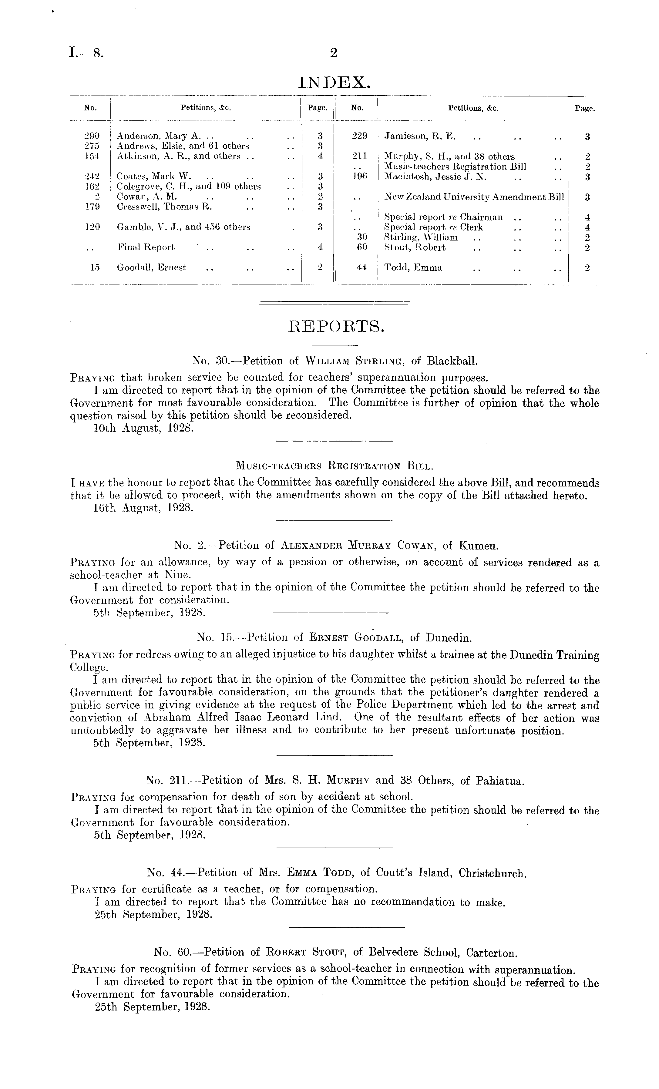 No. Petitions, &c. | Page. 229 Jamieson, R. E. .. .. 3 211 Murphy, S. H., and 38 others .. 2 Music-teachers Registration Bill .. 2 196 Macintosh, Jessie J. N. .. .. 3 New Zealand University Amendment Bill 3 Special report re Chairman .. .. 4 Special report re Clerk .. .. 4 30 Stirling, William .. .. .. 2 60 | Stout, Robert .. .. .. 2 44 j Todd, Emma .. .. .. 2