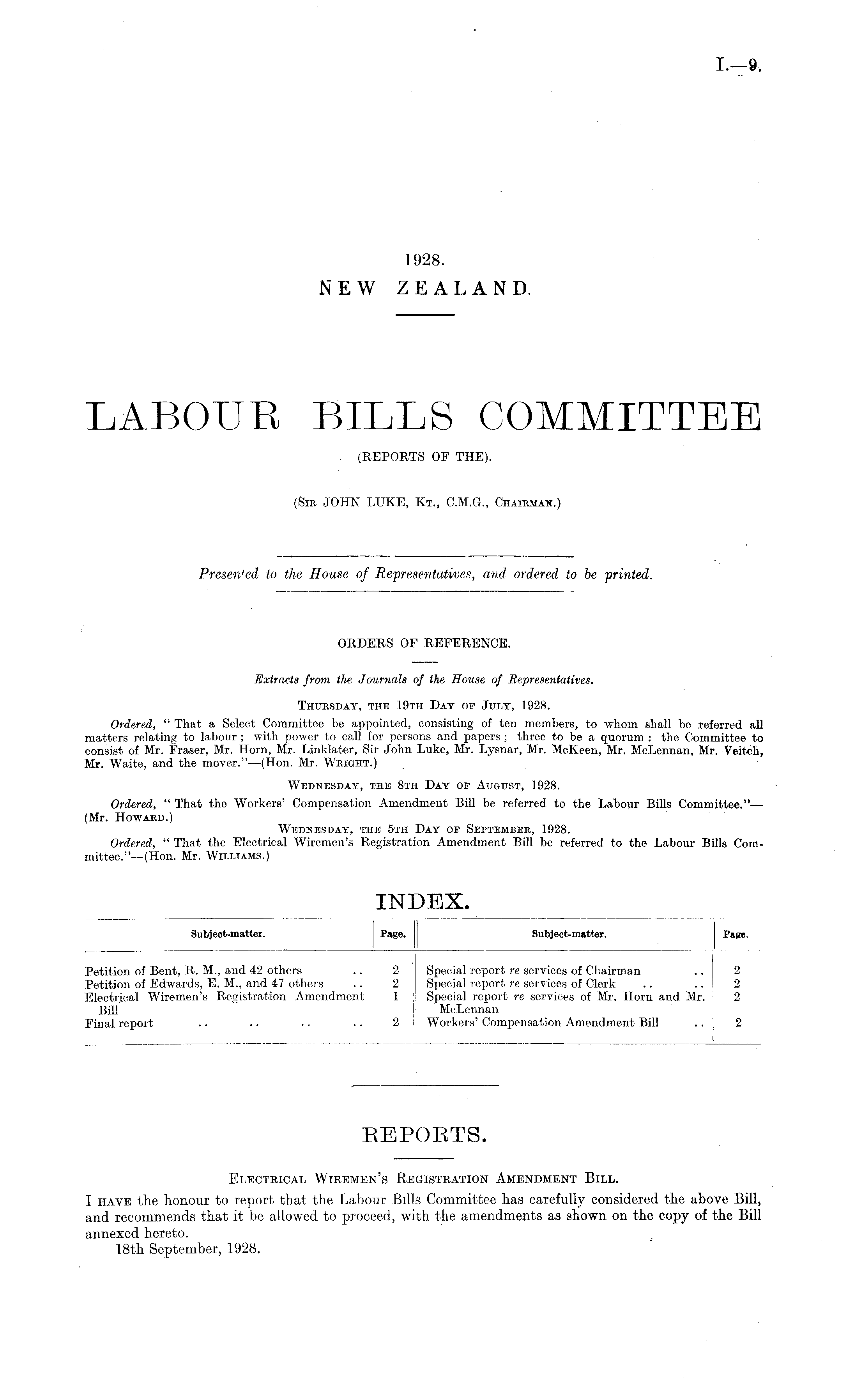 ORDERS OF REFERENCE. Extracts from the Journals of the House of Representatives. Thursday, the 19th Day of July, 1928. Ordered, " That a Select Committee be appointed, consisting of ten members, to whom shall be referred all matters relating to labour ; with power to call for persons and papers ; three to be a quorum : the Committee to consist of Mr. Eraser, Mr. Horn, Mr. Linklater, Sir John Luke, Mr. Lysnar, Mr. McKeen, Mr. McLennan, Mr. Veitch, Mr. Waite, and the mover." —(Hon. Mr. Weight.) Wednesday, the Bth Day op August, 1928. Ordered, " That the Workers' Compensation Amendment Bill be referred to the Labour Bills Committee."— (Mr. Howard.) Wednesday, the sth Day or September, 1928. Ordered; " That the Electrical Wiremen's Registration Amendment Bill be referred to the Labour Bills Committee." —(Hon. Mr. Williams.)