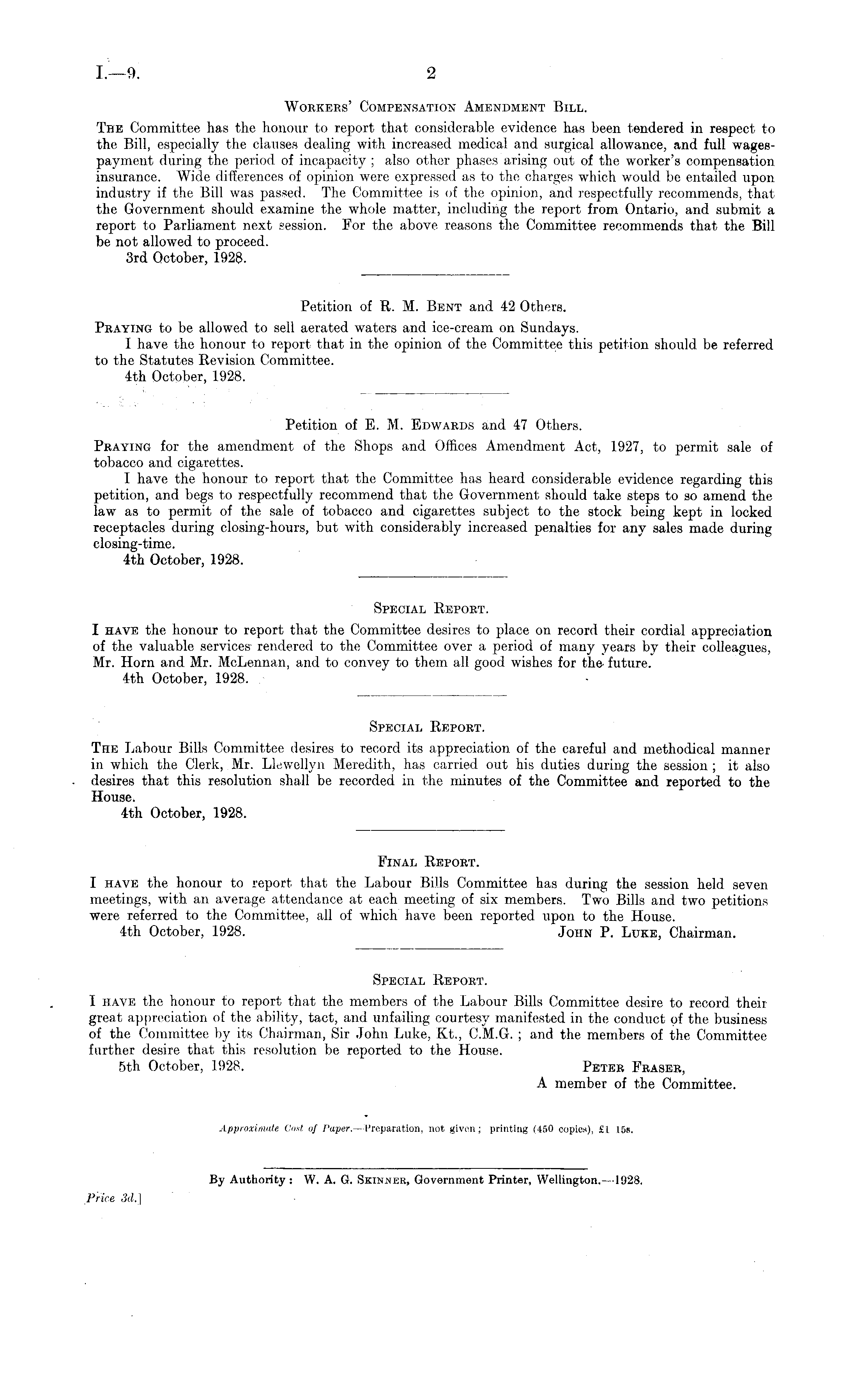 Final Report. I have the honour to report that the Labour Bills Committee has during the session held seven meetings, with an average attendance at each meeting of six members. Two Bills and two petitions were referred to the Committee, all of which have been reported upon to the House. 4th October, 1928. John P. Luke, Chairman.