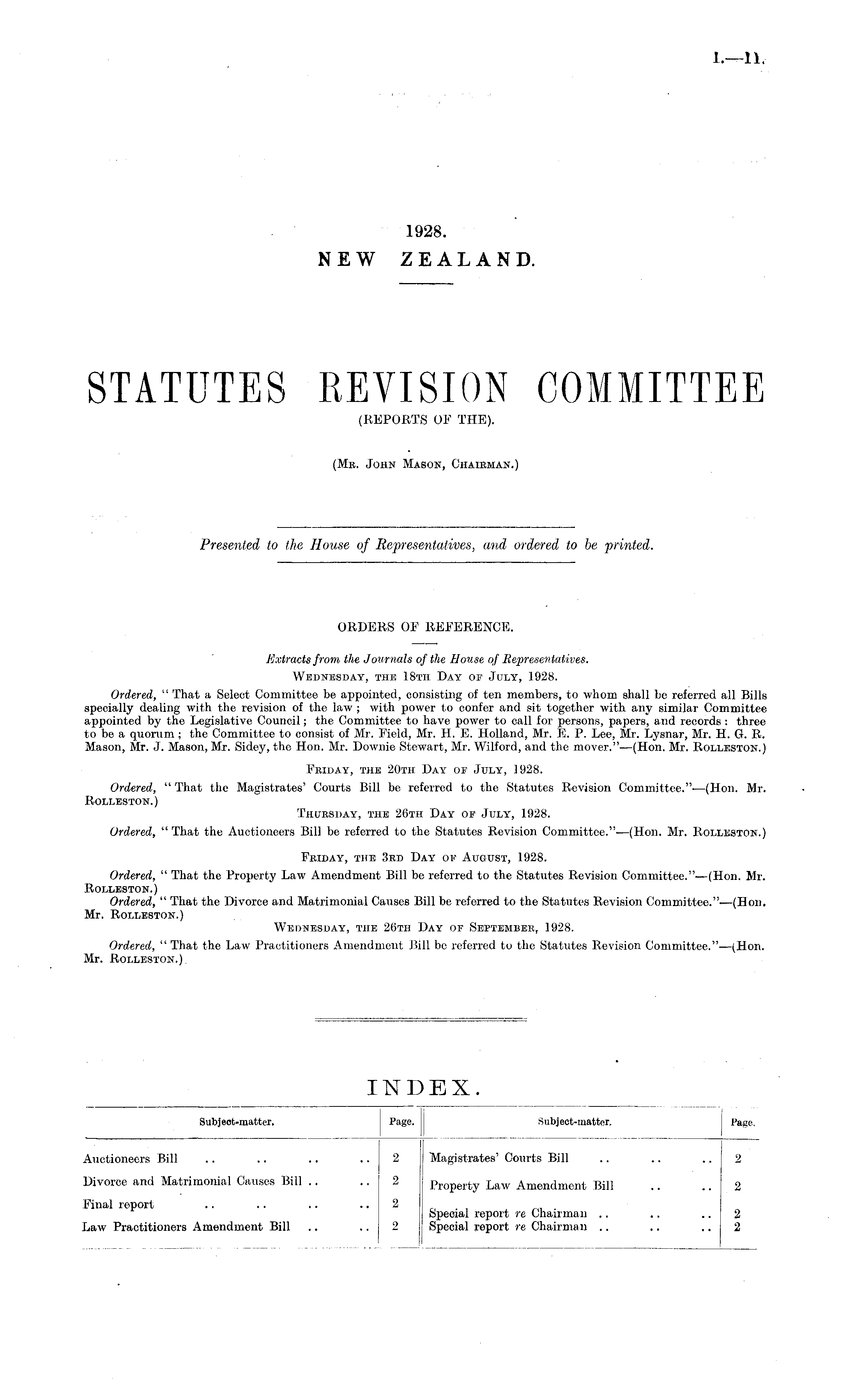 ORDERS OF REFERENCE. Extracts from the Journals of the House of Representatives. Wednesday, the 18th Day of July, 1928. Ordered, " That a Select Committee be appointed, consisting of ten members, to whom shall be referred all Bills specially dealing with the revision of the law ; with power to confer and sit together with any similar Committee appointed by the Legislative Council; the Committee to have power to call for persons, papers, and records : three to be a quorum ; the Committee to consist of Mr. Field, Mr. H. E. Holland, Mr. E. P. Lee, Mr. Lysnar, Mr. H. G. R. Mason, Mr. J. Mason, Mr. Sidey, the Hon. Mr. Downie Stewart, Mr. Wilford, and the mover."—(Hon. Mr. Rolleston.) Friday, the 20th Day of July, 1928. Ordered, " That the Magistrates' Courts Bill be referred to the Statutes Revision Committee.".—(Hon. Mr. Rolleston.) Thursday, the 26th Day of July, 1928. Ordered, "That the Auctioneers Bill be referred to the Statutes Revision Committee."—(Hon. Mr. Rolleston.) Fkiday, the 3rd Day of August, 1928. Ordered, " That the Property Law Amendment Bill be referred to the Statutes Revision Committee."—(Hon. Mr. Rolleston.) Ordered, " That the Divorce and Matrimonial Causes Bill be referred to the Statutes Revision Committee."—(Hon. Mr. Rolleston.) Wednesday, the 26th Day of September, 1928. Ordered, " That the Law Practitioners Amendment Bill be referred to the Statutes Revision Committee."—(Hon. Mr. Rolleston.)