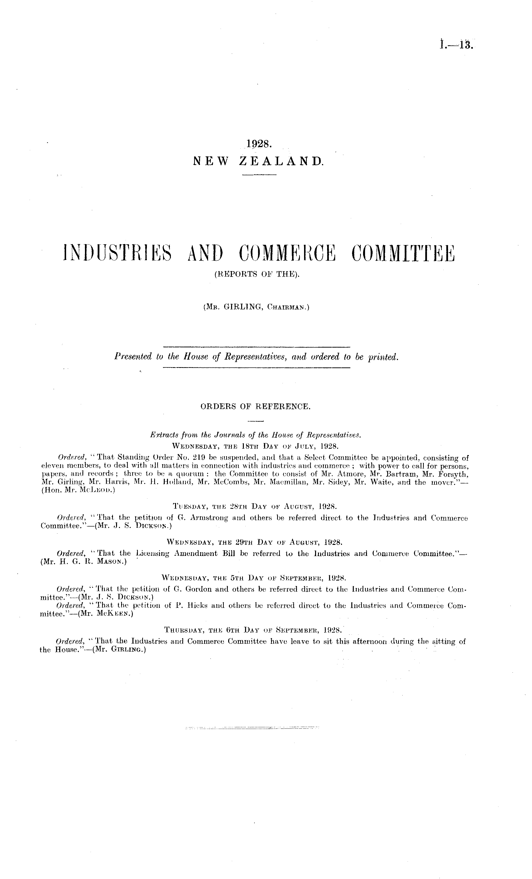ORDERS OF REFERENCE. Extracts from the. Journals of the Hou.se of Representatives. Wednesday, the 18th Day of July, 1928. Ordered, " That Standing Order .No. 219 be suspended, and that a Select Committee be appointed, consisting of eleven members, to deal with all matters in connection with industries and commerce ; with power to call for persons, papers, and records ; three to be a quorum : the Committee to consist of Mr. Atmore, Mr. Bartram, Mr. Forsyth, Mr. Girling, Mr. Harris, Mr. .11. Holland, Mr. MeCombs, Mr. Maemillan, Mr. Sidey, Mr. Waite, and the mover."— (Hon. Mr. McLeod.) Tuesday, the 28th Day of August, 1928. Ordered, "That the petition of G. Armstrong and others be referred direct to the Industries and Commerce Committee."—(Mr. J. S. Dickson.) Wednesday, the 29th Day of August, 1928. Ordered, " That the Licensing Amendment Bill be referred to the Industries and Commerce Committee."— (Mr. H. G. R. Mason.) ' Wednesday, the sth Day of September, 1928. Ordered, " That the petition of G. Gordon and others be referred direct to the Industries and Commerce Committee." —(Mr. J. S. Dickson.) Ordered, " That the petition of P. Hicks and others be referred direct to the Industries and Commerce Committee." —(Mr. McKeen.) Thursday, the 6th Day of September, 1928. Ordered, " That the Industries and Commerce Committee have leave to sit this afternoon during the sitting of the House."—(Mr. Girling.)