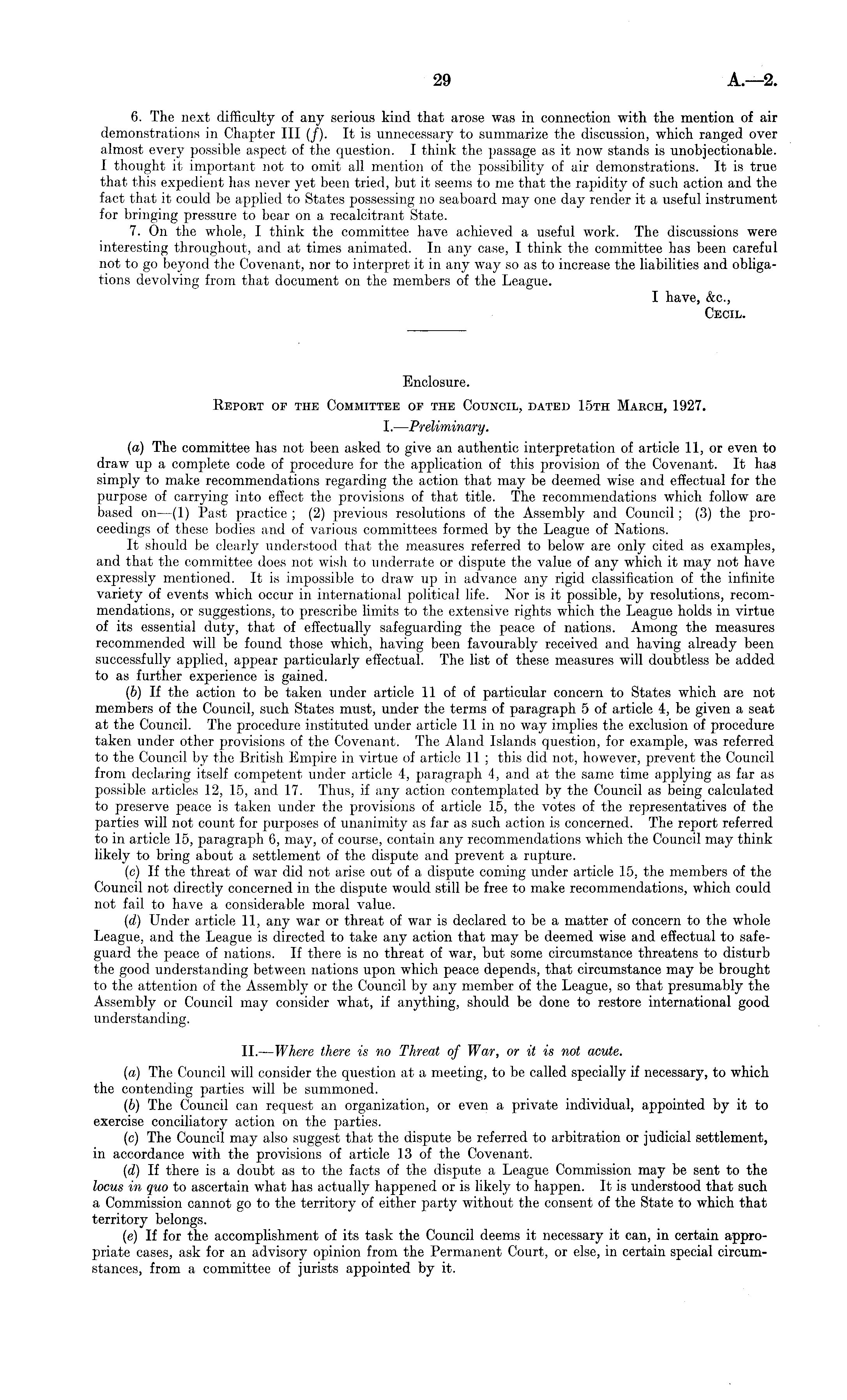 6. The next difficulty of any serious kind that arose was in connection with the mention of air demonstrations in Chapter 111 (/). It is unnecessary to summarize the discussion, which ranged over almost every possible aspect of the question. I think the passage as it now stands is unobjectionable. I thought it important not to omit all mention of the possibility of air demonstrations. It is true that this expedient has never yet been tried, but it seems to me that the rapidity of such action and the fact that it could be applied to States possessing no seaboard may one day render it a useful instrument for bringing pressure to bear on a recalcitrant State. 7. On the whole, I think the committee have achieved a useful work. The discussions were interesting throughout, and at times animated. In any case, I think the committee has been careful not to go beyond the Covenant, nor to interpret it in any way so as to increase the liabilities and obligations devolving from that document on the members of the League. I have, &c., Cecil. Enclosure. Report op the Committee op the Council, dated 15th March, 1927. I. —Preliminary. (a) The committee has not been asked to give an authentic interpretation of article 11, or even to draw up a complete code of procedure for the application of this provision of the Covenant. It has simply to make recommendations regarding the action that may be deemed wise and effectual for the purpose of carrying into effect the provisions of that title. The recommendations which follow are based on —(1) Past practice ; (2) previous resolutions of the Assembly and Council; (3) the proceedings of these bodies and of various committees formed by the League of Nations. It should be clearly understood that the measures referred to below are only cited as examples, and that the committee does not wish to underrate or dispute the value of any which it may not have expressly mentioned. It is impossible to draw up in advance any rigid classification of the infinite variety of events which occur in international political life. Nor is it possible, by resolutions, recommendations, or suggestions, to prescribe limits to the extensive rights which the League holds in virtue of its essential duty, that of effectually safeguarding the peace of nations. Among the measures recommended will be found those which, having been favourably received and having already been successfully applied, appear particularly effectual. The list of these measures will doubtless be added to as further experience is gained. (b) If the action to be taken under article 11 of of particular concern to States which are not members of the Council, such States must, under the terms of paragraph 5 of article 4, be given a seat at the Council. The procedure instituted under article 11 in no way implies the exclusion of procedure taken under other provisions of the Covenant. The Aland Islands question, for example, was referred to the Council by the British Empire in virtue of article 11 ; this did not, however, prevent the Council from declaring itself competent under article 4, paragraph 4, and at the same time applying as far as possible articles 12, 15, and 17. Thus, if any action contemplated by the Council as being calculated to preserve peace is taken under the provisions of article 15, the votes of the representatives of the parties will not count for purposes of unanimity as far as such action is concerned. The report referred to in article 15, paragraph 6, may, of course, contain any recommendations which the Council may think likely to bring about a settlement of the dispute and prevent a rupture. (c) If the threat of war did not arise out of a dispute coming under article 15, the members of the Council not directly concerned in the dispute would still be free to make recommendations, which could not fail to have a considerable moral value. (d) Under article 11, any war or threat of war is declared to be a matter of concern to the whole League, and the League is directed to take any action that may be deemed wise and effectual to safeguard the peace of nations. If there is no threat of war, but some circumstance threatens to disturb the good understanding between nations upon which peace depends, that circumstance may be brought to the attention of the Assembly or the Council by any member of the League, so that presumably the Assembly or Council may consider what, if anything, should be done to restore international good understanding. II. —Where there is no Threat of War, or it is not acute. (a) The Council will consider the question at a meeting, to be called specially if necessary, to which the contending parties will be summoned. (b) The Council can request an organization, or even a private individual, appointed by it to exercise conciliatory action on the parties. (c) The Council may also suggest that the dispute be referred to arbitration or judicial settlement, in accordance with the provisions of article 13 of the Covenant. (d) If there is a doubt as to the facts of the dispute a League Commission may be sent to the locus in quo to ascertain what has actually happened or is likely to happen. It is understood that such a Commission cannot go to the territory of either party without the consent of the State to which that territory belongs. (e) If for the accomplishment of its task the Council deems it necessary it can, in certain appropriate cases, ask for an advisory opinion from the Permanent Court, or else, in certain special circumstances, from a committee of jurists appointed by it.
