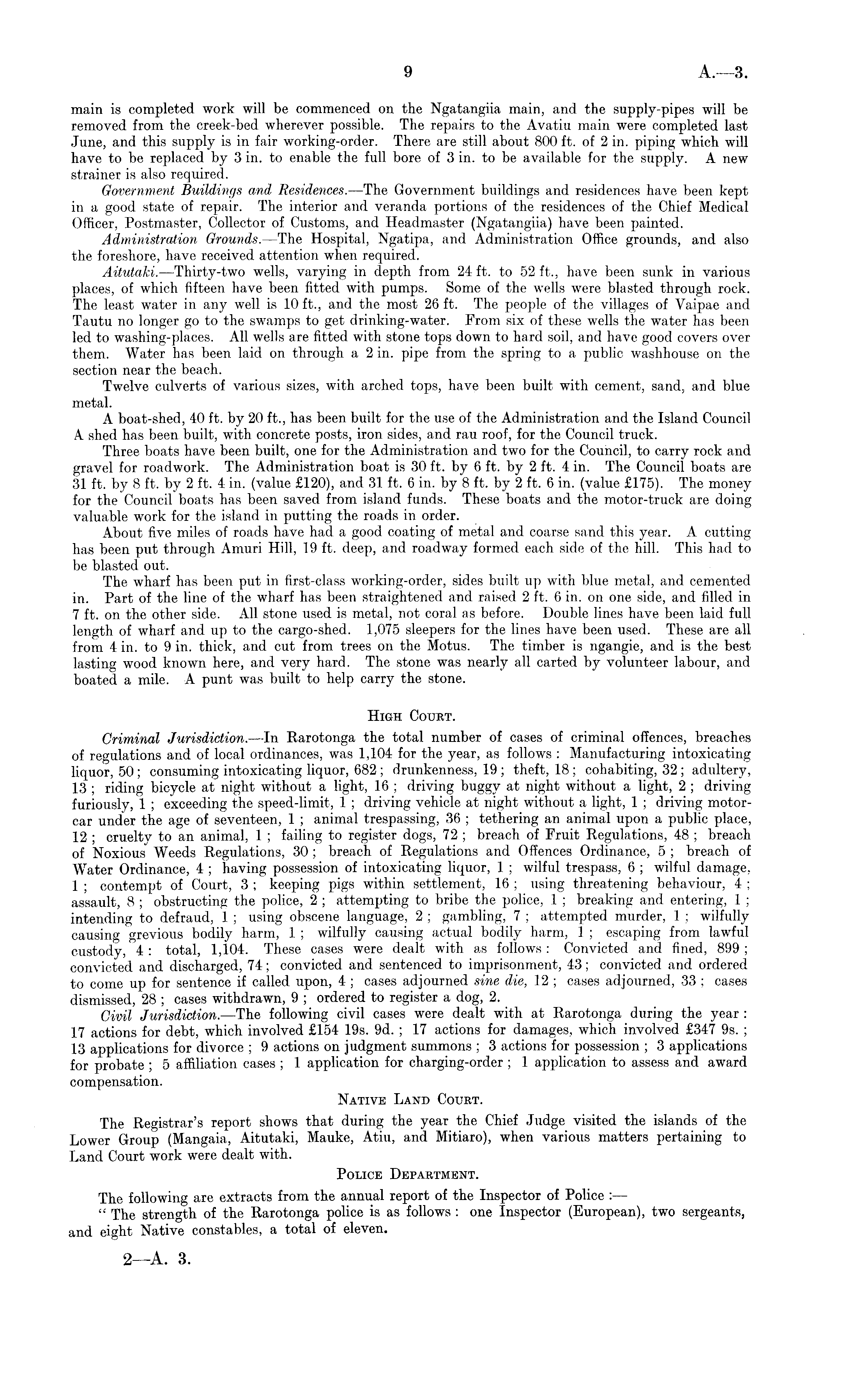 main is completed work will be commenced on the Ngatangiia main, and the supply-pipes will be removed from the creek-bed wherever possible. The repairs to the Avatiu main were completed last June, and this supply is in fair working-order. There are still about 800 ft. of 2 in. piping which will have to be replaced by 3 in. to enable the full bore of 3 in. to be available for the supply. A new strainer is also required. Government Buildings and Residences. —The Government buildings and residences have been kept in a good state of repair. The interior and veranda portions of the residences of the Chief Medical Officer, Postmaster, Collector of Customs, and Headmaster (Ngatangiia) have been painted. Administration Grounds. —The Hospital, Ngatipa, and Administration Office grounds, and also the foreshore, have received attention when required. Aitutaki. —Thirty-two wells, varying in depth from 24 ft. to 52 ft., have been sunk in various places, of which fifteen have been fitted with pumps. Some of the wells were blasted through rock. The least water in any well is 10 ft., and the most 26 ft. The people of the villages of Yaipae and Tautu no longer go to the swamps to get drinking-water. From six of these wells the water has been led to washing-places. All wells are fitted with stone tops down to hard soil, and have good covers over them. Water has been laid on through a 2 in. pipe from the spring to a public washhouse on the section near the beach. Twelve culverts of various sizes, with arched tops, have been built with cement, sand, and blue metal. A boat-shed, 40 ft. by 20 ft., has been built for the use of the Administration and the Island Council A shed has been built, with concrete posts, iron sides, and rau roof, for the Council truck. Three boats have been built, one for the Administration and two for the Council, to carry rock and gravel for roadwork. The Administration boat is 30 ft. by 6 ft. by 2 ft. 4 in. The Council boats are 31 ft. by 8 ft. by 2 ft. 4 in. (value £120), and 31 ft. 6 in. by 8 ft. by 2 ft. 6 in. (value £175). The money for the Council boats has been saved from island funds. These boats and the motor-truck are doing valuable work for the island in putting the roads in order. About five miles of roads have had a good coating of metal and coarse sand this year. A cutting has been put through Amuri Hill, 19 ft. deep, and roadway formed each side of the hill. This had to be blasted out. The wharf has been put in first-class working-order, sides built up with blue metal, and cemented in. Part of the line of the wharf has been straightened and raised 2 ft. 6 in. on one side, and filled in 7 ft. on the other side. All stone used is metal, not coral as before. Double lines have been laid full length of wharf and up to the cargo-shed. 1,075 sleepers for the lines have been used. These are all from 4 in. to 9 in. thick, and cut from trees on the Motus. The timber is ngangie, and is the best lasting wood known here, and very hard. The stone was nearly all carted by volunteer labour, and boated a mile. A punt was built to help carry the stone. High Court. Criminal Jurisdiction. —In Rarotonga the total number of cases of criminal offences, breaches of regulations and of local ordinances, was 1,104 for the year, as follows : Manufacturing intoxicating liquor, 50 ; consuming intoxicating liquor, 682 ; drunkenness, 19 ; theft, 18 ; cohabiting, 32 ; adultery, 13 ; riding bicycle at night without a light, 16 ; driving buggy at night without a light, 2 ; driving furiously, 1 ; exceeding the speed-limit, 1 ; driving vehicle at night without a light, 1 ; driving motorcar under the age of seventeen, 1 ; animal trespassing, 36 ; tethering an animal upon a public place, 12 ; cruelty to an animal, 1 ; failing to register dogs, 72 ; breach of Fruit Regulations, 48 ; breach of Noxious Weeds Regulations, 30 ; breach of Regulations and Offences Ordinance, 5 ; breach of Water Ordinance, 4 ; having possession of intoxicating liquor, 1 ; wilful trespass, 6 ; wilful damage, 1 ; contempt of Court, 3 ; keeping pigs within settlement, 16 ; using threatening behaviour, 4 ; assault, 8 ; obstructing the police, 2 ; attempting to bribe the police, 1 ; breaking and entering, 1 ; intending to defraud, 1 ; using obscene language, 2 ; gambling, 7 ; attempted murder, 1 ; wilfully causing grevious bodily harm, 1 ; wilfully causing actual bodily harm, 1 ; escaping from lawful custody, 4 : total, 1,104. These cases were dealt with as follows : Convicted and fined, 899 ; convicted and discharged, 74; convicted and sentenced to imprisonment, 43; convicted and ordered to come up for sentence if called upon, 4 ; cases adjourned sine die, 12 ; cases adjourned, 33 ; cases dismissed, 28 ; cases withdrawn, 9 ; ordered to register a dog, 2. Civil Jurisdiction. —The following civil cases were dealt with at Rarotonga during the year : 17 actions for debt, which involved £154 19s. 9d. ; 17 actions for damages, which involved £347 9s. ; 13 applications for divorce ; 9 actions on judgment summons ; 3 actions for possession ; 3 applications for probate ; 5 affiliation cases ; 1 application for charging-order ; 1 application to assess and award compensation. Native Land Court. The Registrar's report shows that during the year the Chief Judge visited the islands of the Lower Group (Mangaia, Aitutaki, Mauke, Atiu, and Mitiaro), when various matters pertaining to Land Court work were dealt with. Police Department. The following are extracts from the annual report of the Inspector of Police : — " The strength of the Rarotonga police is as follows : one Inspector (European), two sergeants, and eight Native constables, a total of eleven.